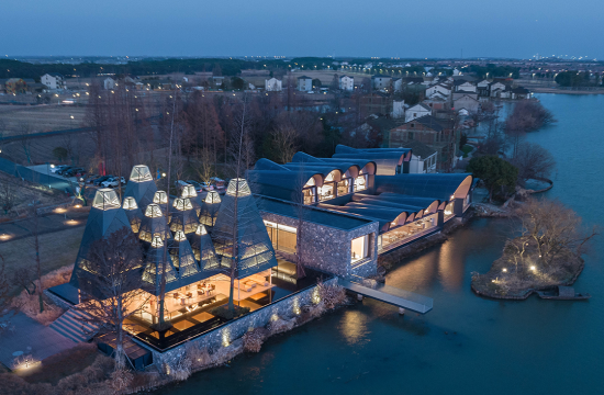 Proyectos GOA (Group of Architects): Anclado en la serenidad: Qushui Shanwan Boatyard Hotel Un barco rebosante de tonos otoñales, Diez millas de brillo del lago se extendieron de par en par. La deidad del agua…