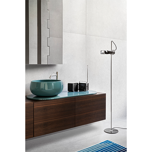 Caracterizada por una elegancia que ama la combinación de líneas rigurosas, simétricas y formas suaves, Delfo se expresa con el poder de los materiales, en un juego de combinaciones entre cerámica y madera, que da vida a diferentes interpretaciones de un solo modelo, unidos por la misma visión estética y la misma capacidad de reinterpretar el material cerámico en clave contemporánea.
