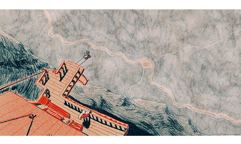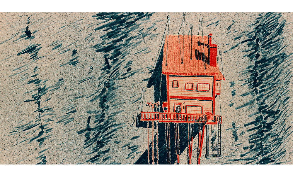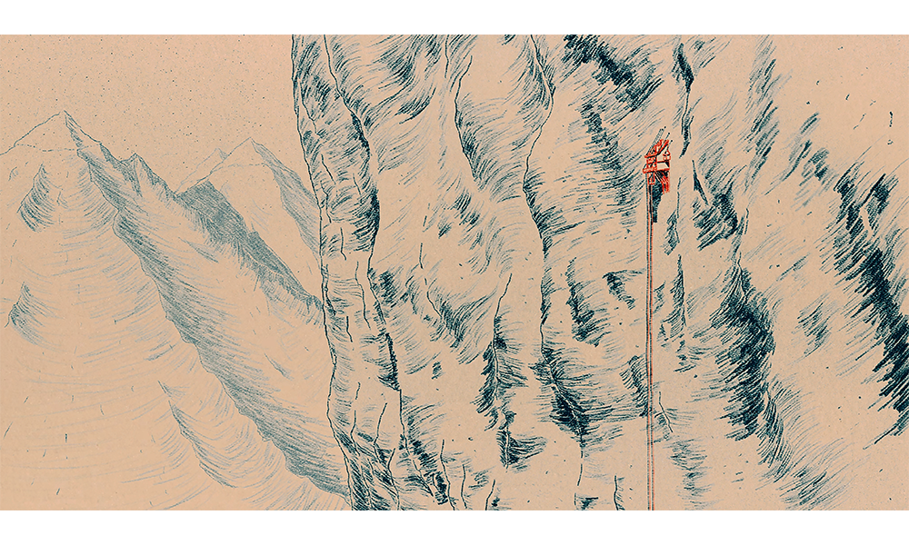 Todos los días, un padre y su hijo saltan en paracaídas desde su vertiginosa casa fría, adosada a un acantilado, para ir al pueblo de tierra, muy lejos, donde venden el hielo que producen a diario.