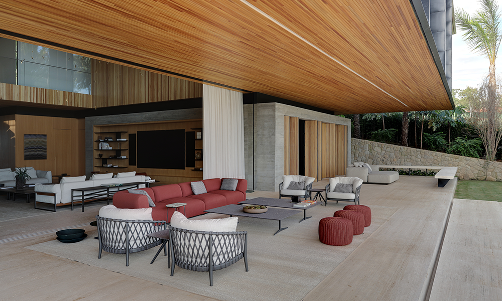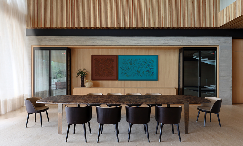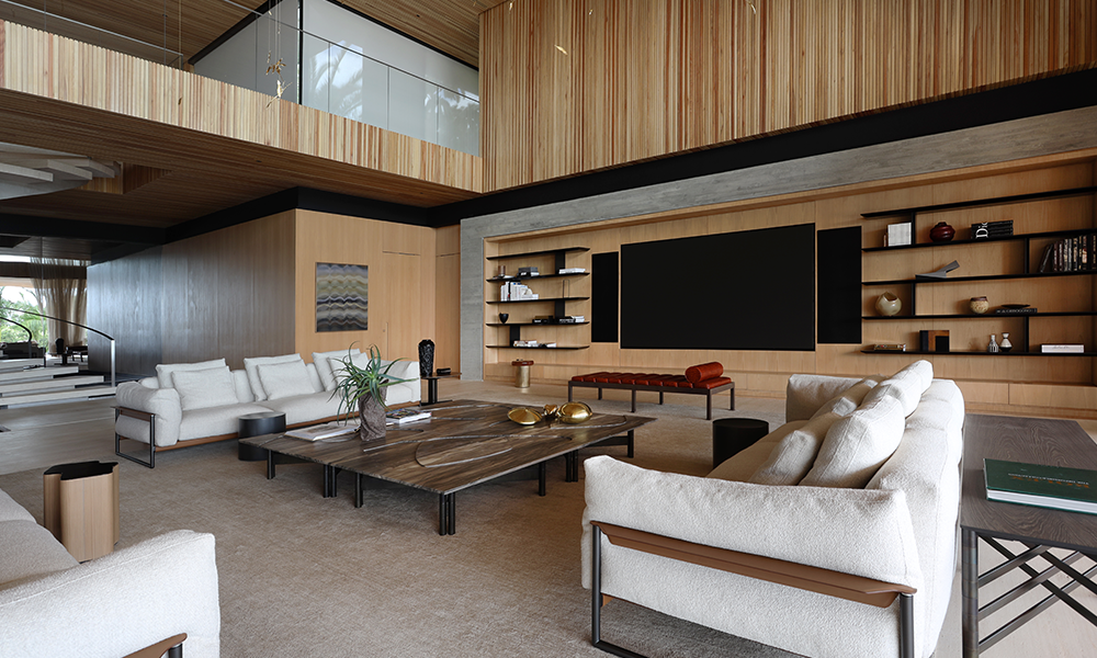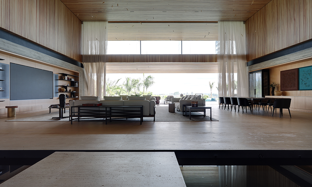 Con la estructura de la casa ya lista, se desarrolló toda la definición de la distribución (disposición del mobiliario), la elección de revestimientos para los distintos ambientes, lozas y metales, detallamiento de baños, cocinas, carpinterías y la escalera curva. Georgia Albuquerque buscó elementos presentes en la arquitectura, como el techo y las paredes de listones de madera y hormigón, para que los interiores fueran parte de un todo.