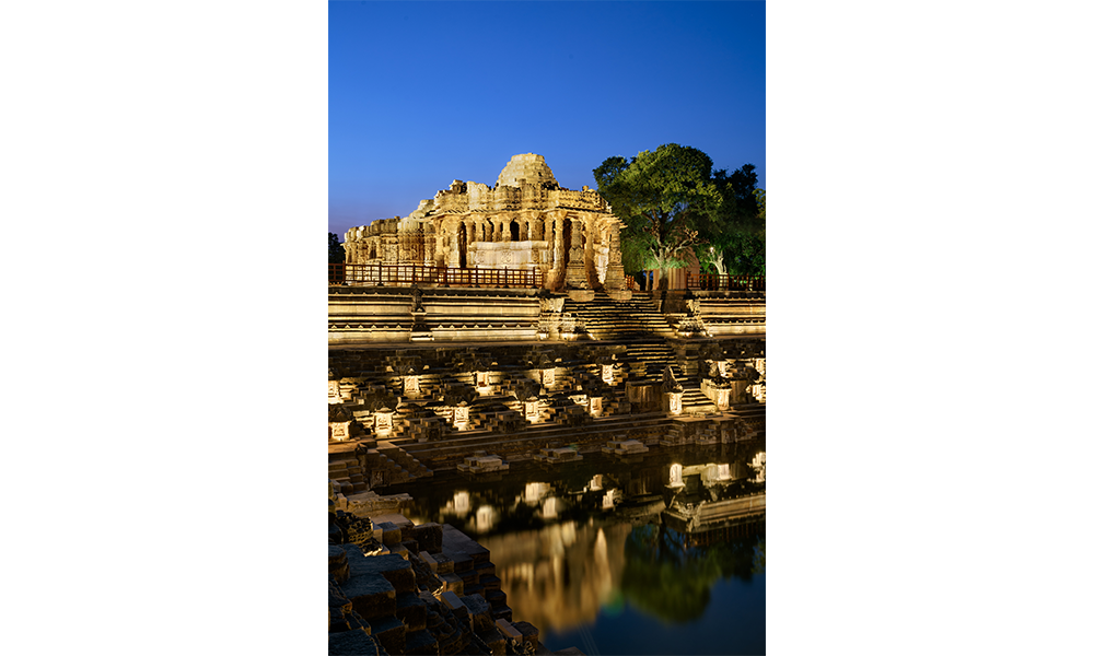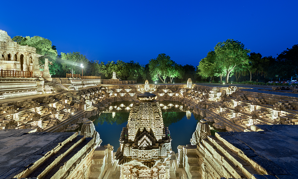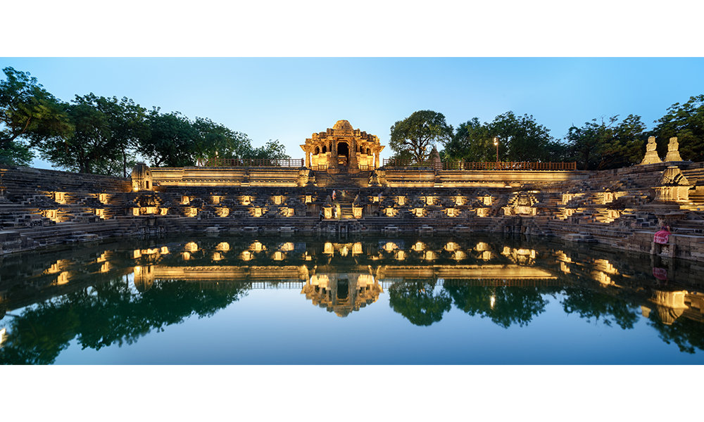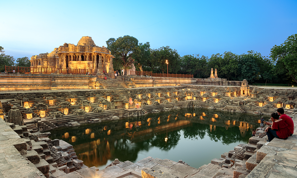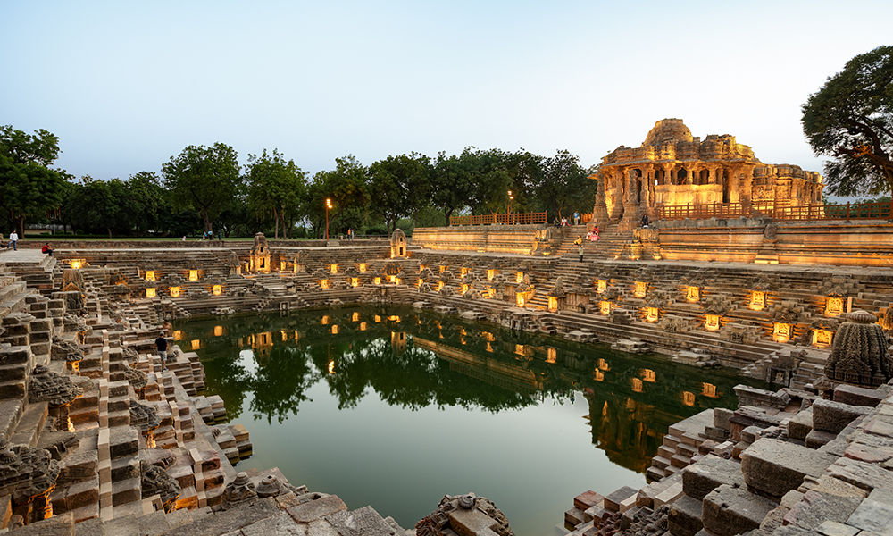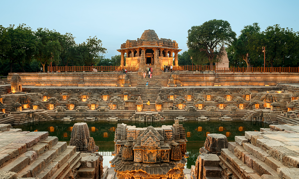 El Templo del Sol de Modhera es un templo hindú dedicado a la deidad solar Surya ubicado en la aldea de Modhera del distrito de Mehsana, Gujarat, India. Situado en la orilla del río Pushpavati, fue construido después de 1026-27 EC durante la dinastía Chalukya. En este templo, se incrustó una gema en medio de la corona del Dios Sol. La puerta de entrada en el lado este de este templo está concentrada de tal manera que el primer rayo del Sol cae directamente sobre una gema que está tachonada en medio de la corona del Dios Sol. Esto ilumina todo el santuario, creando una atmósfera divina. Además, hay 108 templos pequeños que rodean el tanque exterior, lo que crea una vista agradable al atardecer y al amanecer. El complejo del templo es ahora un monumento protegido mantenido por el Servicio Arqueológico de la India.