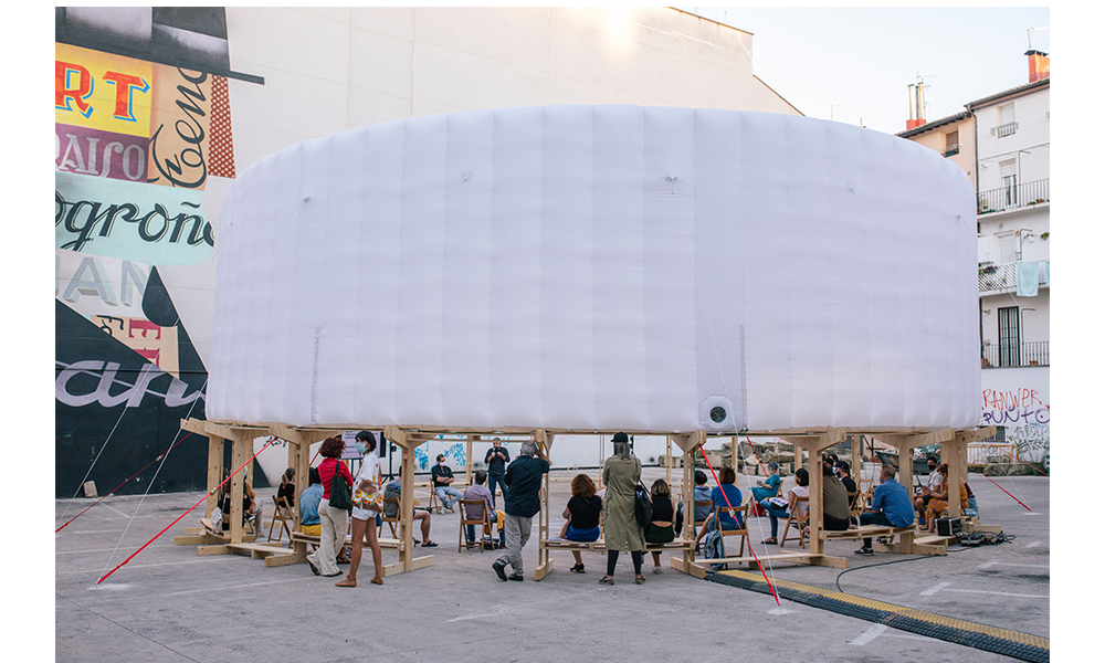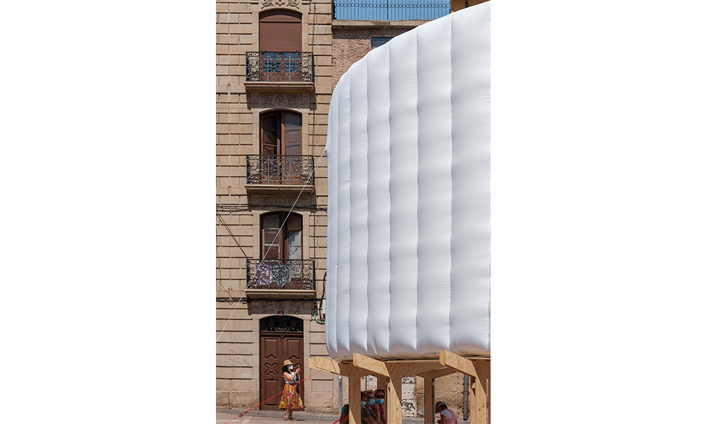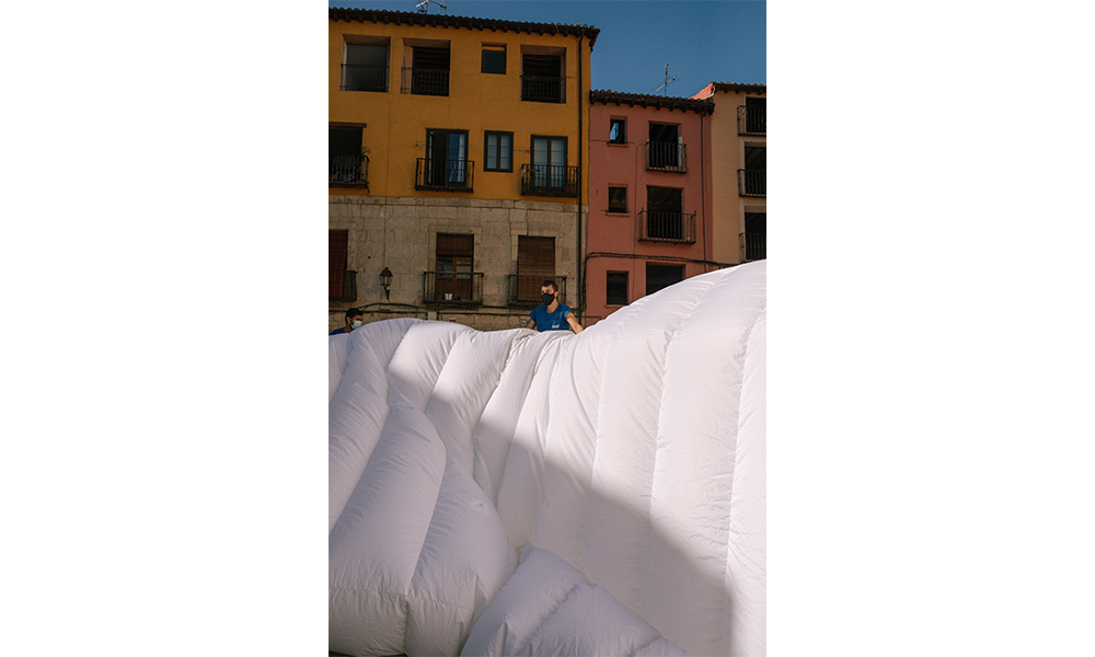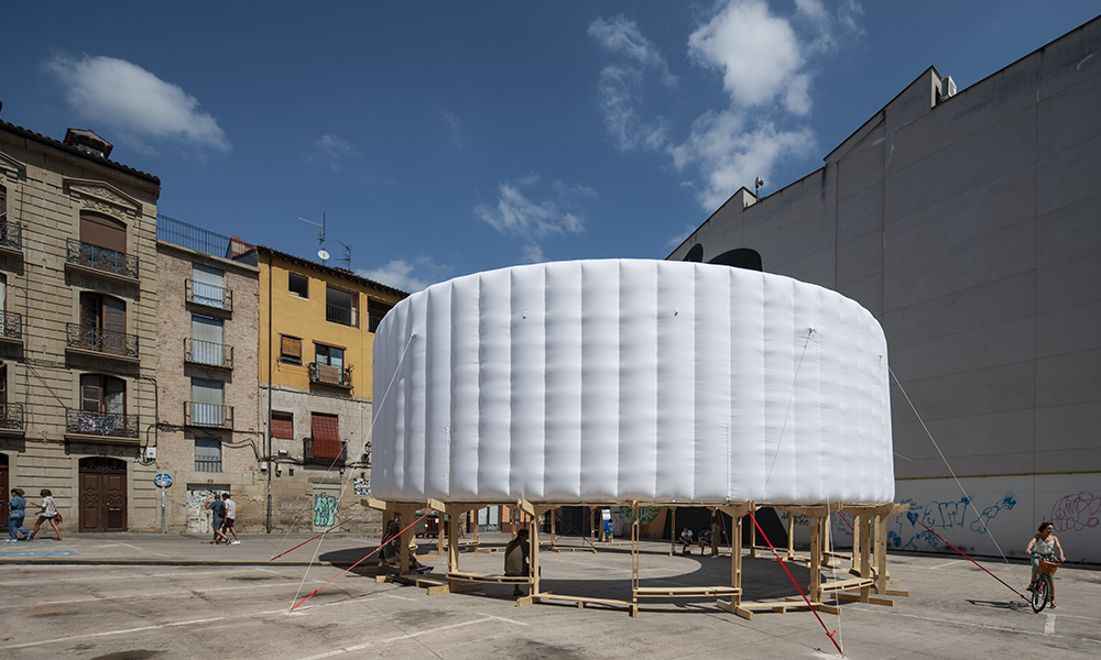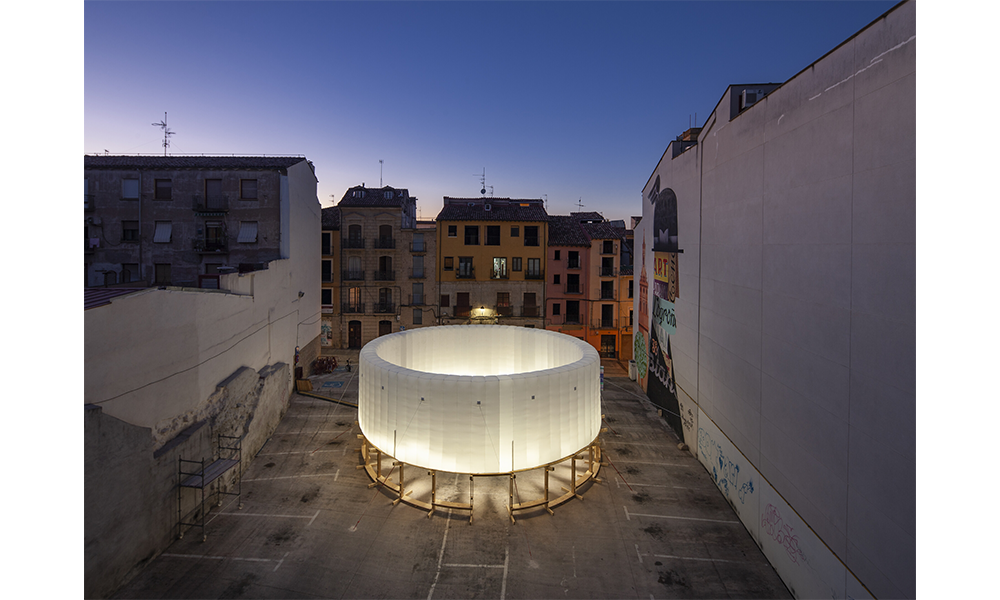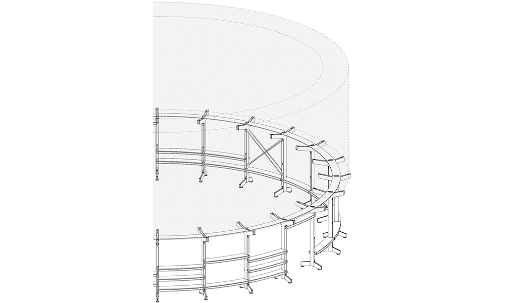 El cuerpo combina dos partes principales: una base estructural en la base y un componente inflable en la parte superior, midiendo en total 14 mt de diámetro y 6 mt de altura. Los componentes separados están empacados y listos para usar, junto con la mayoría de los accesorios e instrucciones de ensamblaje para ayudar en el proceso de construcción. Hecho de tablones de madera contrachapada cortados con cnc con el mínimo desperdicio en los recortes, la base está diseñada como un sistema modular compuesto por un elemento de pata vertical y un brazo horizontal. Esos dos componentes se entrelazan para construir la estructura de soporte de carga circular del anillo, que brinda estabilidad al cuerpo. Se eligió la forma circular debido a su capacidad intrínseca para regular las fuerzas contrarias dentro de sí misma y, por lo tanto, convertirla en la más autoestabilizadora de las formas geométricas elementales. La dinámica del círculo continuo puede soportar cualquier carga y, por lo tanto, solo necesita una contrafuerza para reforzarla, que se proporciona a través de la correa textil cruzada.