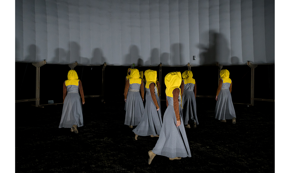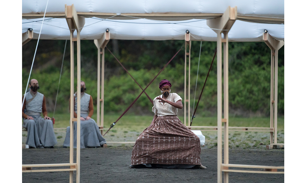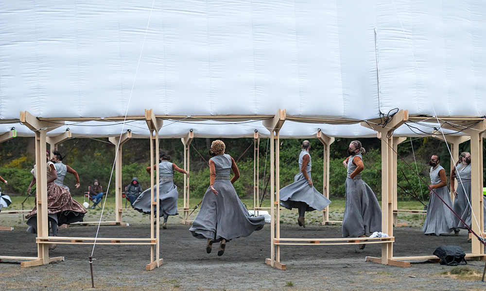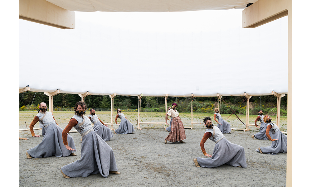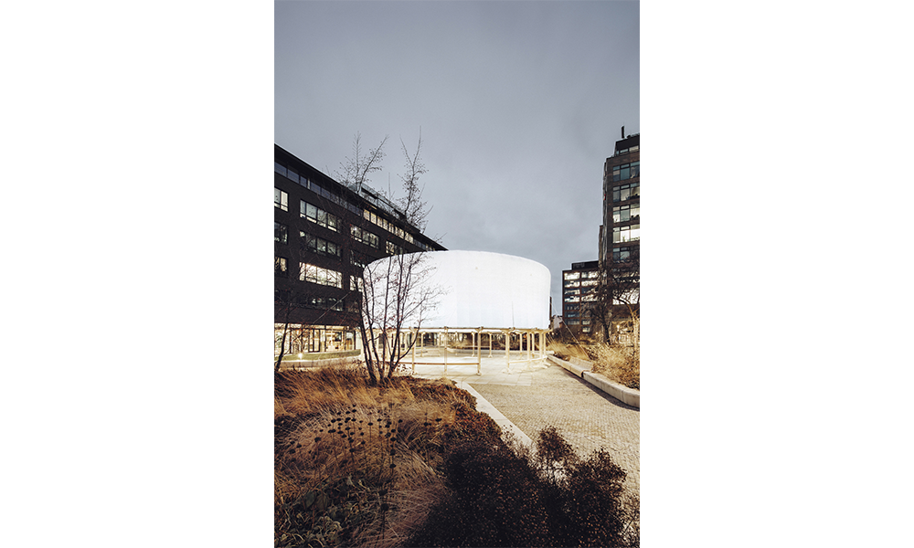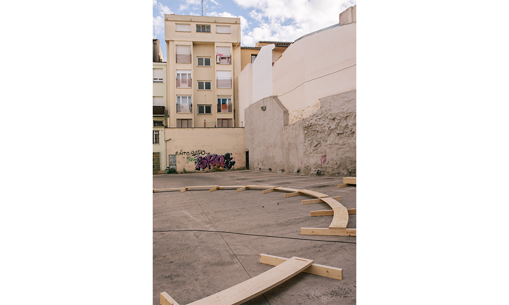 El cuerpo combina dos partes principales: una base estructural en la base y un componente inflable en la parte superior, midiendo en total 14 mt de diámetro y 6 mt de altura. Los componentes separados están empacados y listos para usar, junto con la mayoría de los accesorios e instrucciones de ensamblaje para ayudar en el proceso de construcción. Hecho de tablones de madera contrachapada cortados con cnc con el mínimo desperdicio en los recortes, la base está diseñada como un sistema modular compuesto por un elemento de pata vertical y un brazo horizontal. Esos dos componentes se entrelazan para construir la estructura de soporte de carga circular del anillo, que brinda estabilidad al cuerpo. Se eligió la forma circular debido a su capacidad intrínseca para regular las fuerzas contrarias dentro de sí misma y, por lo tanto, convertirla en la más autoestabilizadora de las formas geométricas elementales. La dinámica del círculo continuo puede soportar cualquier carga y, por lo tanto, solo necesita una contrafuerza para reforzarla, que se proporciona a través de la correa textil cruzada.