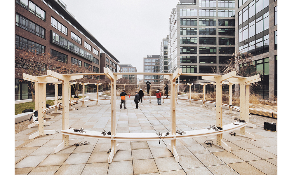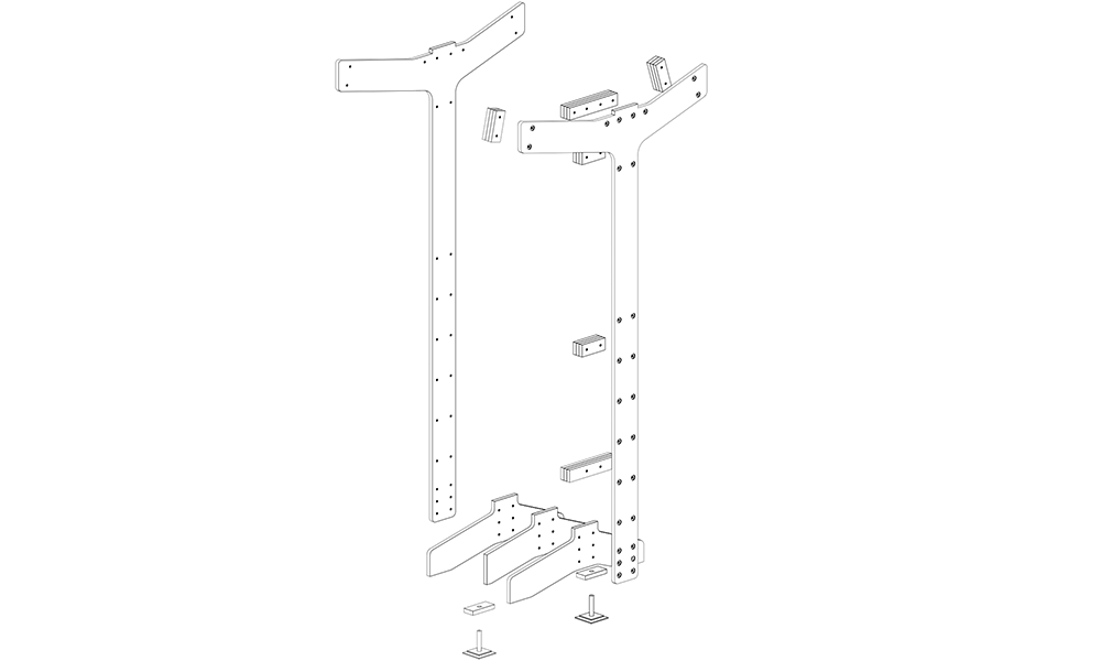 MODULAR, DURADERO, REUTILIZABLE: Hecho de tablones de madera contrachapada cortados por CNC con un desperdicio mínimo en los recortes, la base está diseñada como un sistema modular compuesto por patas verticales y bancos horizontales. Los componentes se atornillan entre sí para formar una estructura de soporte de carga circular que proporciona estabilidad a la carrocería.