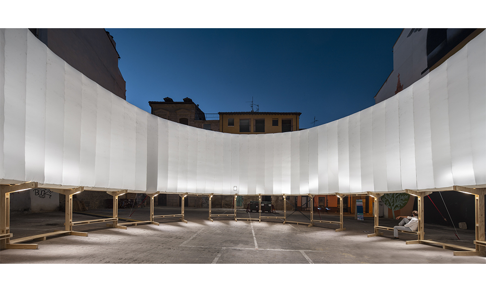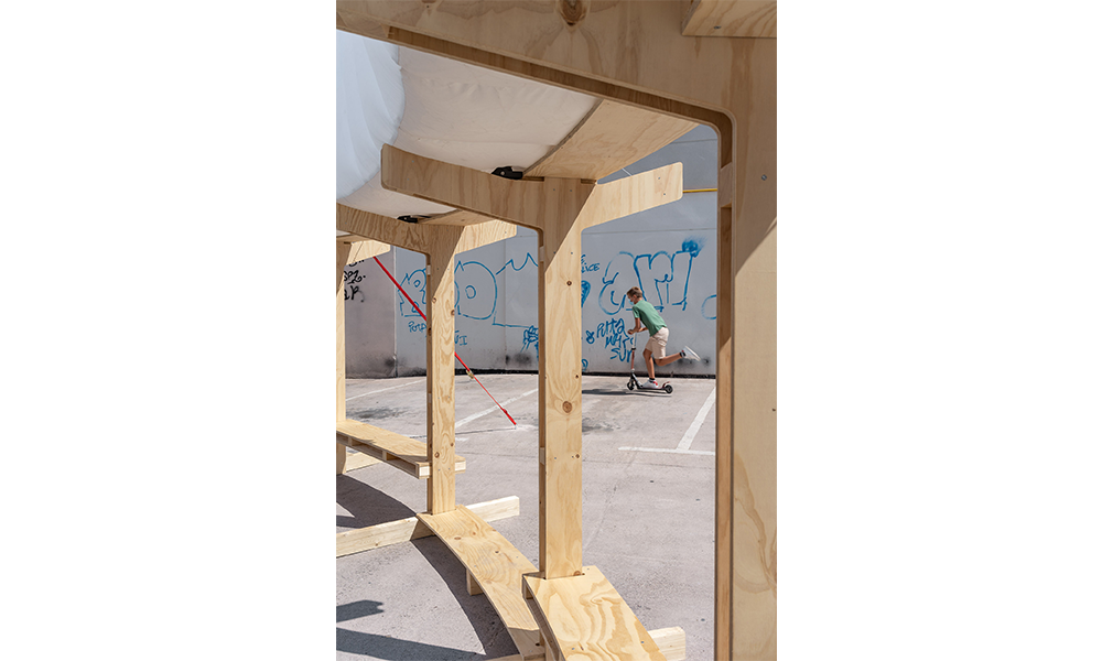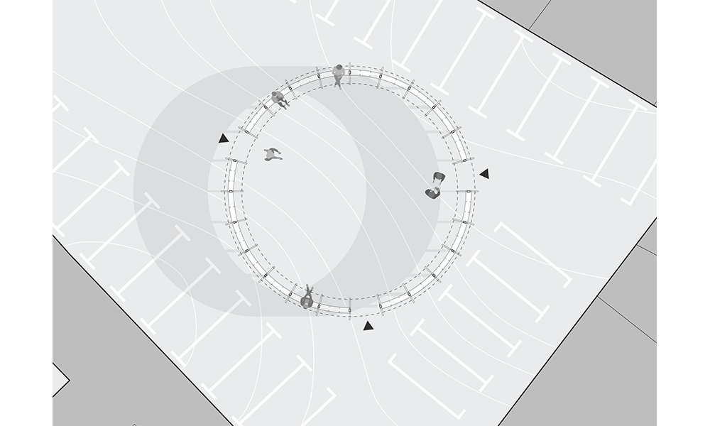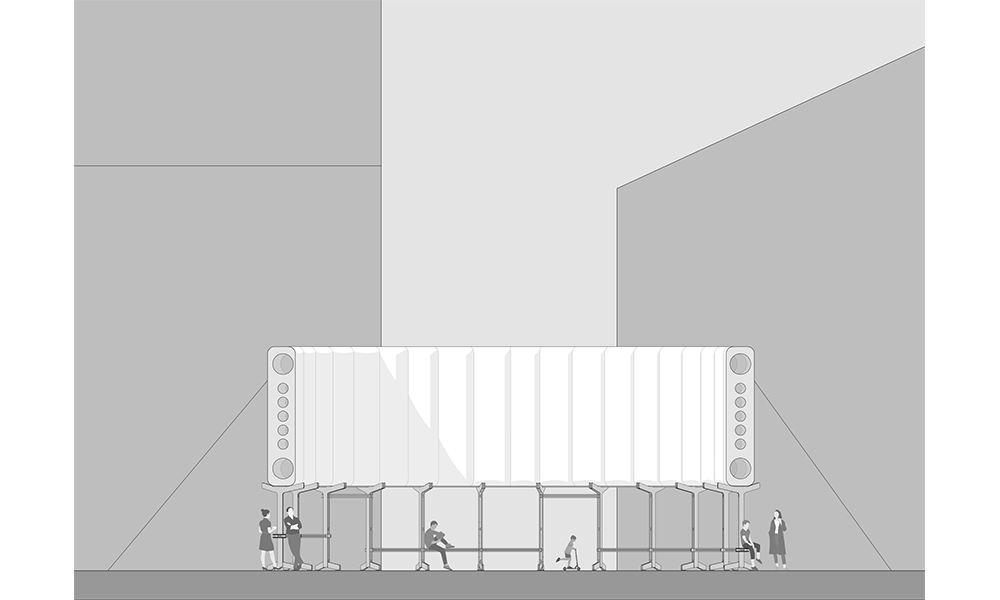 El anillo superior está diseñado como un sistema de sombreado para espacios públicos. En respuesta al problema del sobrecalentamiento de las ciudades de todo el mundo, el anillo genera una gran superficie para esconderse del sol, enfriando las zonas urbanas. El sombreador vertical y abierto evita problemas relacionados con tener un techo (sombreado, acumulación de calor, problemas estructurales), y para crear una gran superficie urbana para sombrear, se utilizó un material ligero que puede ser fácil de construir y desconstruir, su luz , puede resistir fuertes condiciones climáticas. Además, la forma circular permite un mayor alcance de sombra en comparación con una pared recta, lo que lo convierte en un espacio protegido del sol. Durante las horas de oscuridad, los interruptores inflables funcionan y se convierten en un difusor de luz, proporcionando iluminación a las áreas oscuras de la ciudad por las que a menudo se siente inseguro caminar. Esto genera un sentido de cuidado y pertenencia al espacio, lo que lleva a una mayor seguridad en el lugar.