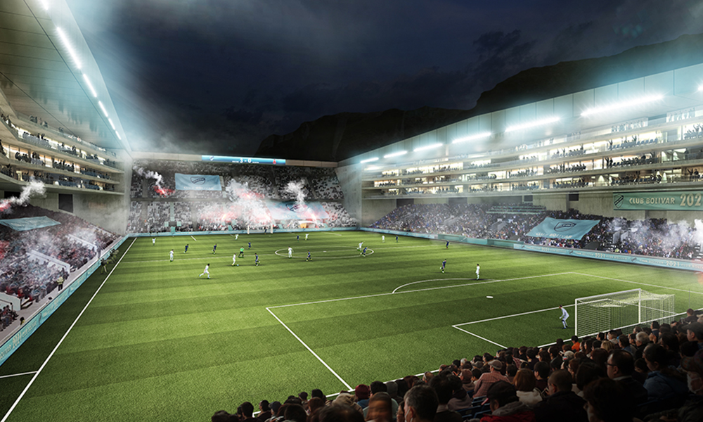 El mismo estudio que está realizando la remodelación del mítico estadio Santiago Bernabéu del Real Madrid, ha diseñado un nuevo estadio en Bolivia cuya construcción está a punto de comenzar. Sede del Club Bolívar, el proyecto del estadio Bolívar propuesto por L35 Architects fue seleccionado a través de un concurso internacional organizado en 2021 por el club y su socio City Football Group. Ubicado en el histórico barrio de Tembladerani de La Paz, el nuevo estadio se erige sobre los restos del anterior y su aforo le permitirá alojar partidos de la Copa Libertadores y de la Copa Sudaméricana hasta octavos y cuartos de final. Como si de un templo se tratase, la prominente estructura, formada por una serie de pilares masivos, marcará un hito en el tejido urbano de La Paz, a la vez que favorecerá la conexión del nuevo estadio con su entorno. Los usos adicionales para comercio, restauración y turismo, acabarán de integrar el edificio en el día a día de la ciudad.