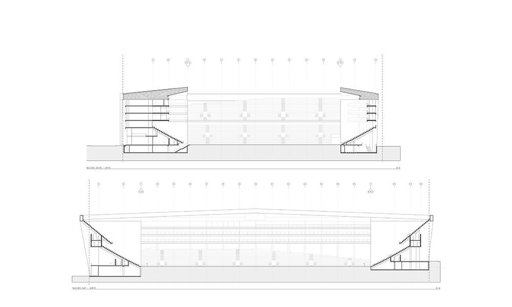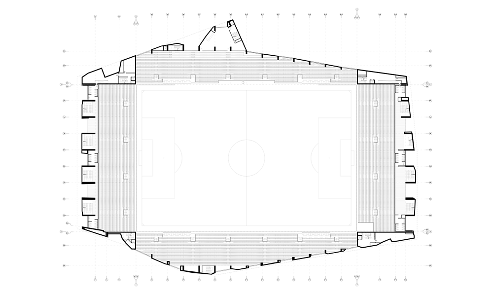 Así, la forma irregular de la parcela determina la volumetría del edificio, siendo uno de los rasgos más potentes de su identidad. La propia estructura de hormigón, desnuda, resuelve a la vez la imagen del edificio, lo que permite adaptarlo al presupuesto del proyecto. Y, aprovechando el desnivel a lo largo del perímetro, se ganan accesos independientes para servir a los diferentes usuarios del estadio así como dos accesos rodados, uno al nuevo aparcamiento bajo cancha y otro a una cota superior con salida directa al campo.