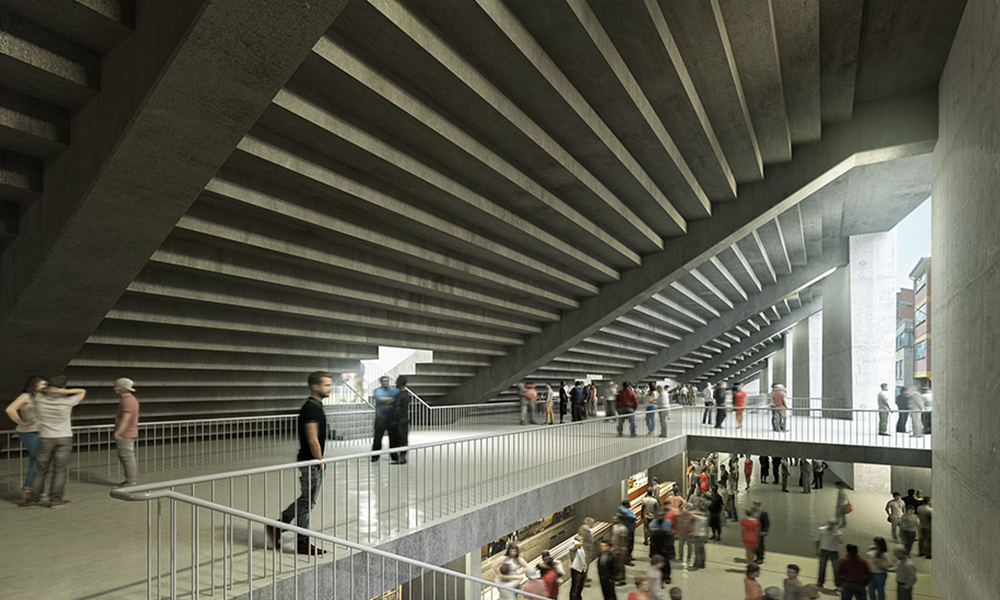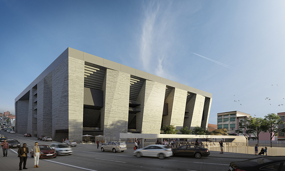 Inspirado en la arquitectura clásica, como si de un templo griego se tratase, el estadio Bolívar será realizado con un único material y mostrará una estructura desnuda de pilares masivos, dispuestos en un ritmo constante de llenos y vacíos, conformando un volumen monumental a la vez que permeable, abierto y conectado al entorno.