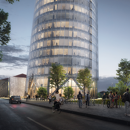 El gran atrio de la torre y el entrepiso suspendido crean un ambiente generoso y acogedor, realzado por los espacios de oficinas multifuncionales ubicados en los pisos superiores. La arquitectura del edificio aborda las necesidades profesionales futuras mediante la integración de espacios flexibles, incluidos los salones de trabajo compartido y las salas de reuniones informales, que se pueden reconfigurar para múltiples usos. La huella de la torre se minimiza al garantizar que el sitio esté abierto al uso público y al crear un nuevo distrito urbano amigable para los peatones donde las empresas locales puedan prosperar.
