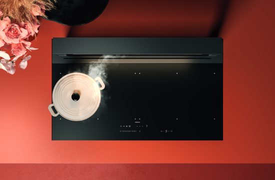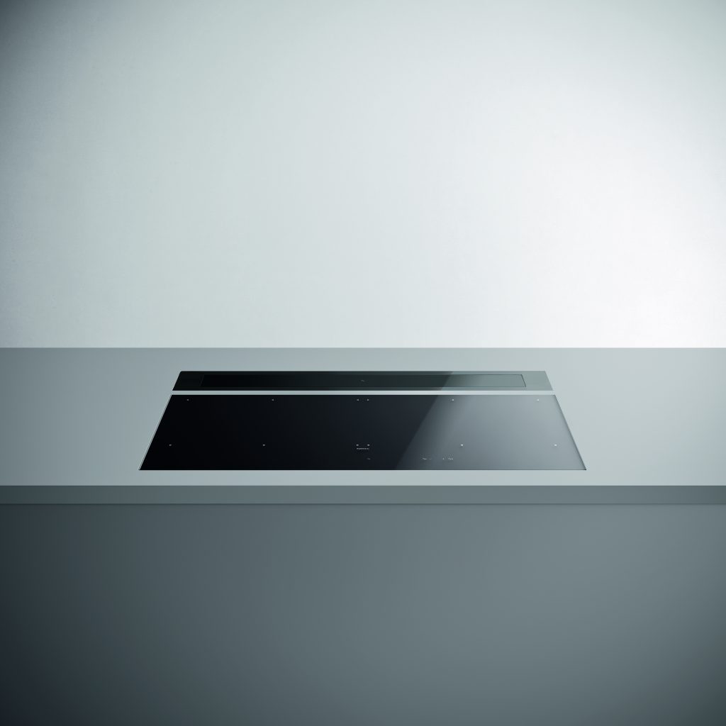 La primera propuesta es Level One, donde campana extractora y placa de cocción se combinan en una única solución de 90 cm, caracterizada por una sofisticada armonía de materiales y detalles. El aluminio negro satinado, el vidrio ahumado y la iluminación LED dinámica de la unidad extractora se combinan con la placa de inducción de vidrio cerámico negro, disponible en dos versiones: brillante o en el nuevo acabado mate resistente a los arañazos. Ambas versiones incorporan controles táctiles con elegantes LEDs blancos.