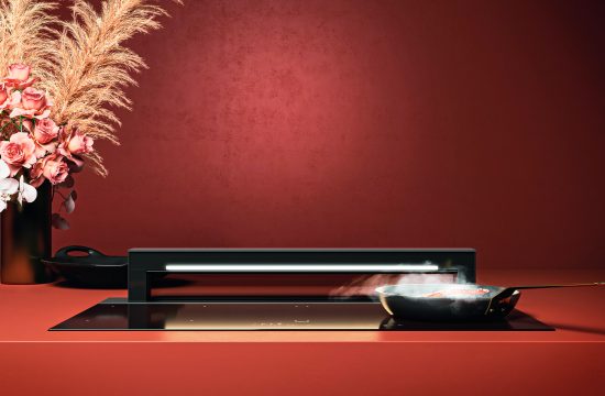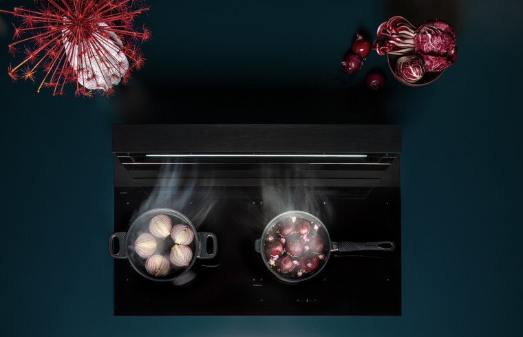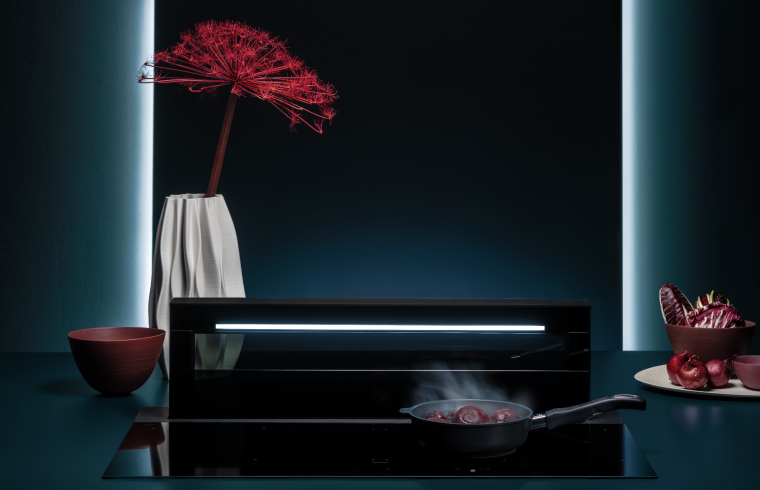 Cada modelo pertenece a la clase energética A++ y está dotado de un sistema motorizado de subida y bajada, que permite ajustar la altura de la campana a la posición exacta requerida según el tipo de sartén utilizada, además de un potente y silencioso motor brushless de 800 m³/h, que también puede instalarse en la parte posterior para optimizar el espacio dentro del mueble.