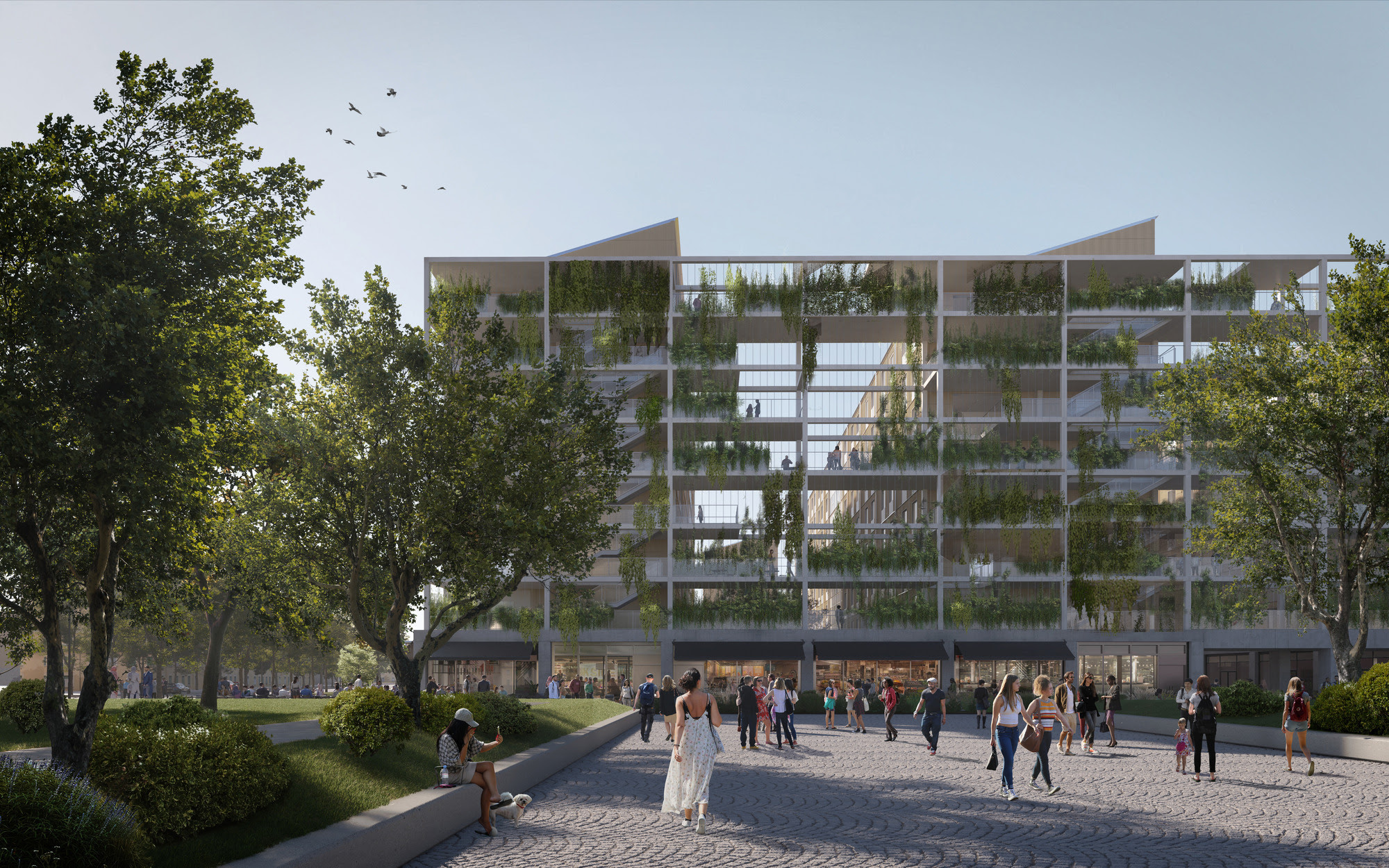 Los nuevos edificios reinterpretan la tipología lineal del barrio con una precisión contemporánea, combinándola con una paleta de materiales contextual y moderna. En los extremos del campus, las terrazas comunitarias actúan como puentes conectores —tanto físicos como sociales— para establecer una nueva forma de infraestructura compartida, basada tanto en la conexión humana como en el rendimiento ambiental. Sombreadas por vegetación vertical, estas terrazas se convertirán en espacios de encuentro y estudio al aire libre, aportando vitalidad al conjunto en todos sus niveles. Además, servirán como barrera acústica y visual entre las zonas residenciales privadas y las áreas públicas del perímetro. La integración de vegetación en los espacios exteriores es clave para la resiliencia climática del vecindario y el bienestar de sus ocupantes y visitantes.