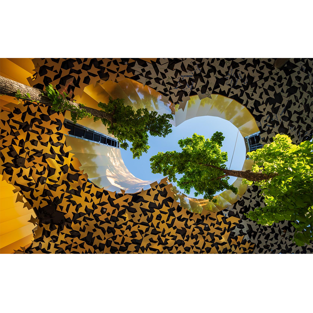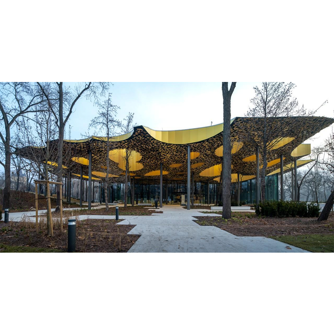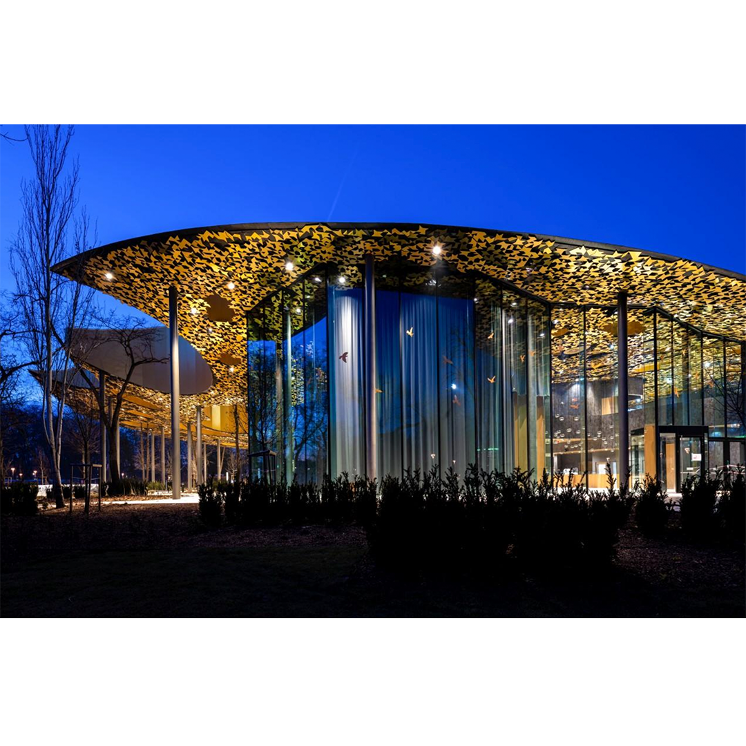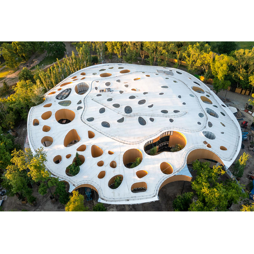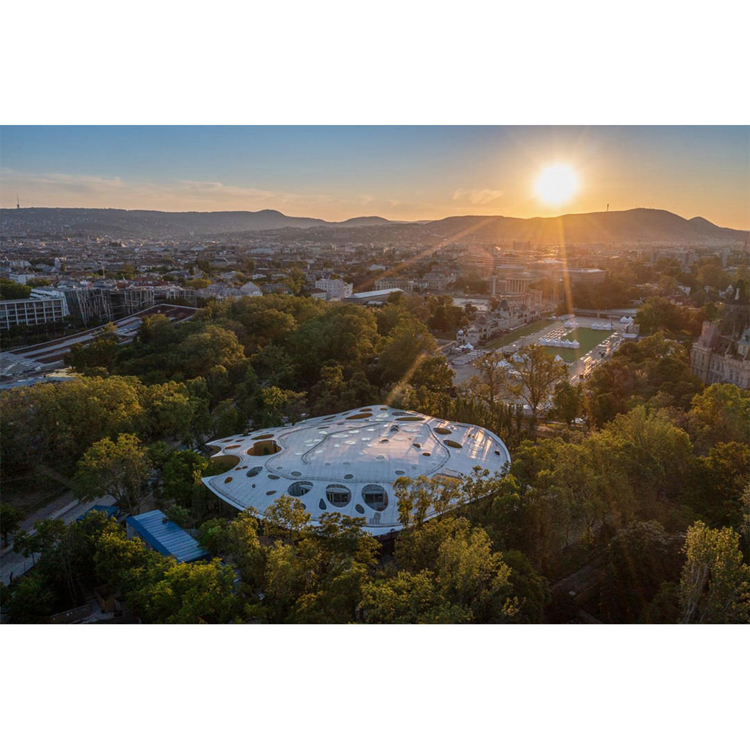La estructura está claramente definida por su distintivo techo ondulado. Lejos de ser solo una decisión estética o un capricho arquitectónico, este elemento está cuidadosamente diseñado para albergar una gama de experiencias musicales interactivas. Ubicado dentro del verde City Park de Budapest, la formación del volumen del lugar hace referencia a los árboles y al dosel natural de follaje y bosques. Una fachada de vidrio, que alcanza los 12 m de altura en algunos lugares, refleja el entorno verde y crea una presencia ligera que dirige la mirada hacia arriba, hacia el techo. Allí, ‘30,000 hojas decorativas de árboles [están] colocadas en el techo suspendido y aseguradas en su lugar por una estructura de acero hecha de 1,000 elementos en forma de panal’.
