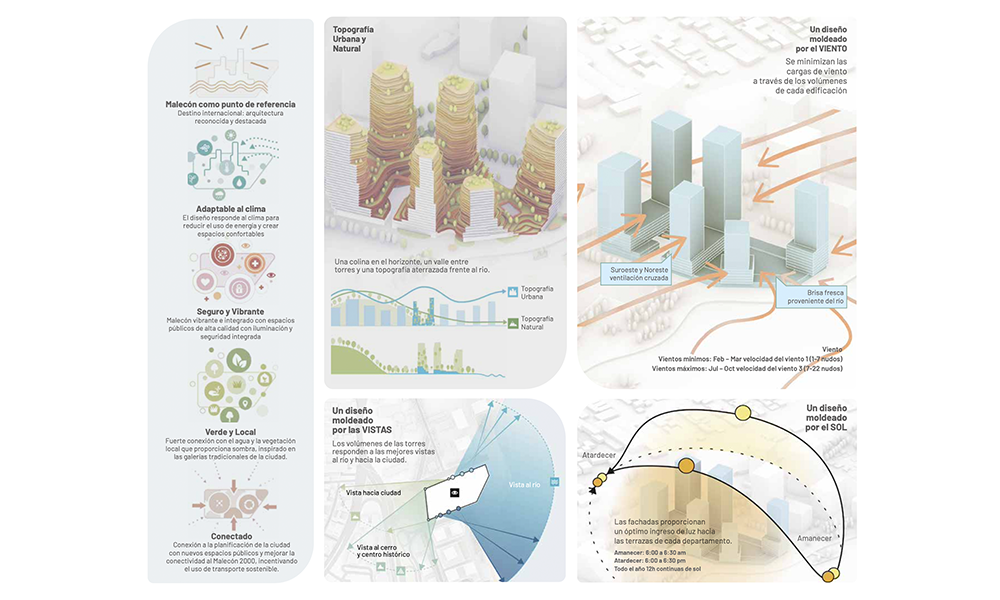 Conectar el proyecto con las calles circundantes. Agregar diferentes alternativas comerciales. Incluir áreas comunales que destaquen. Ajustar alturas que se conecten hacia el río. Vistas despejadas: las torres se miran entre sí, hacia el río y hacia la ciudad. Vistas optimizadas desde los apartamentos más bajos de las torres. Diseño de esquinas redondeadas para optimización de viento y seguridad. Degradé de colores en fachada: corte vertical de capas de tierra. Composición de balcones: optimizar la generación de sombras y generar escala humana. Diseño de esquinas especiales: integrar la calle al área comercial y crear espacios públicos atractivos. Un espacio verde: vegetación en techos, terrazas y balcones, que se desbordan sobre el río.