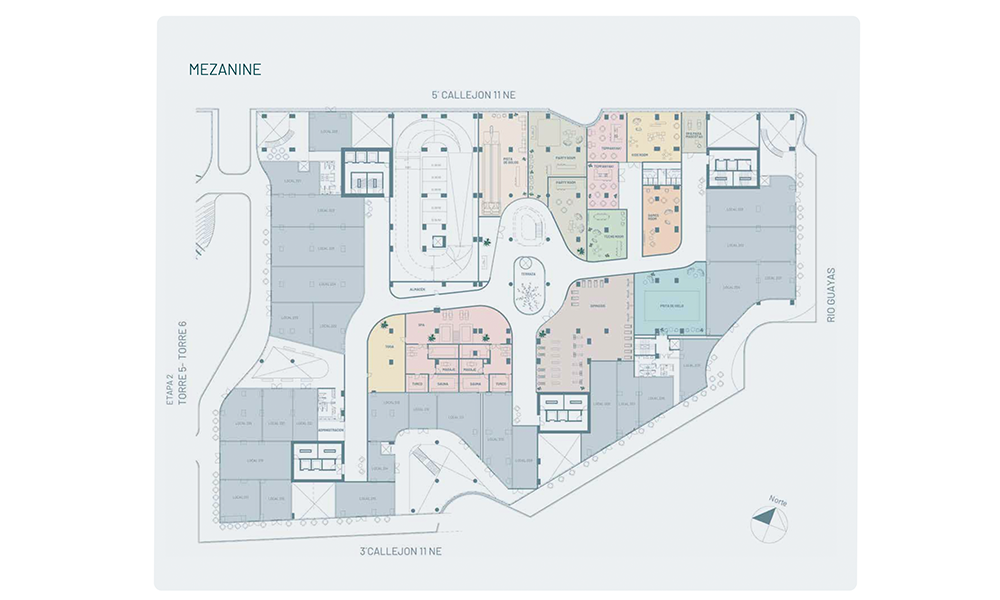 En la base del proyecto,las torres se fusionan para formar un valle verde aterrazado que contiene un oasis de piscinas, canchas deportivas y un pequeño parque frente al río, todo rodeado de una variada vegetación. Dentro de esta base se ubicará una plaza comercial, un importante Club House, y una serie de amenities para brindar la mejor de las experiencias