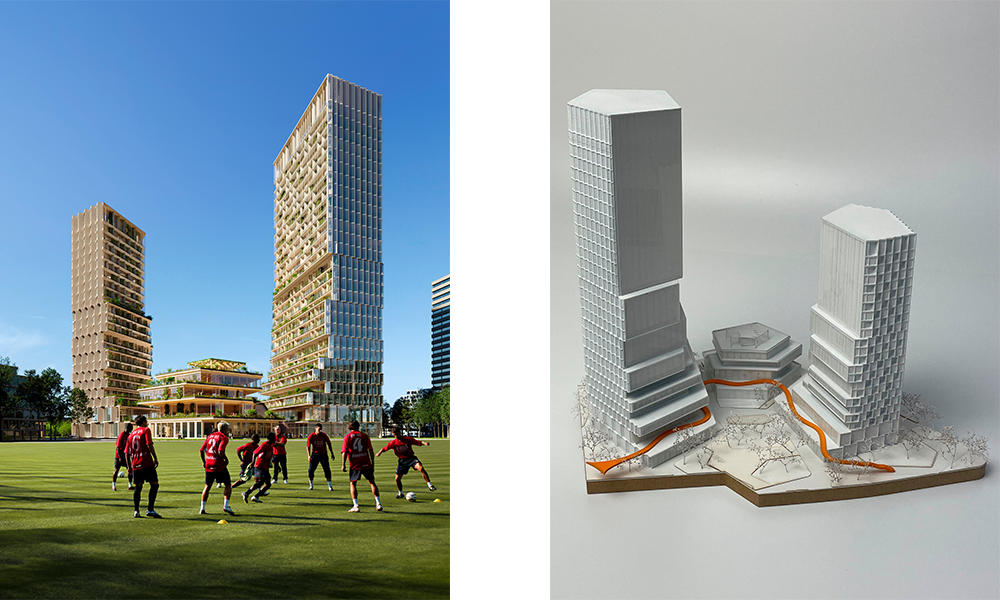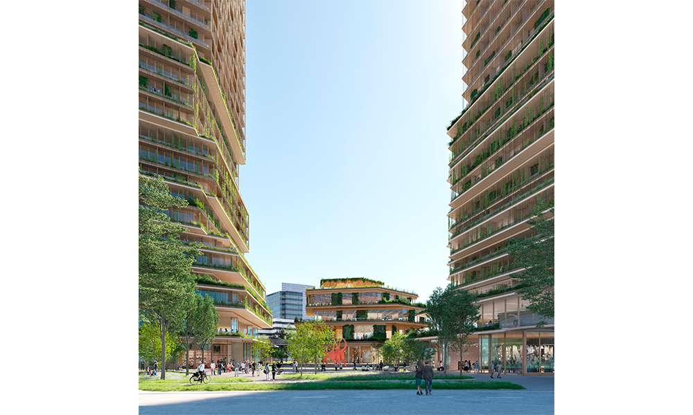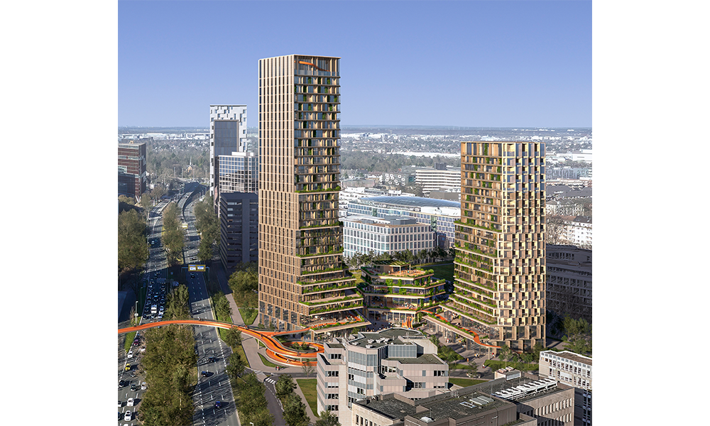 • El “nuevo corazón” del centro de la ciudad norte de Düsseldorf acogerá dos torres de uso mixto altamente sostenibles con alturas de hasta 120 metros, que rodearán un pabellón comunitario de poca altura.