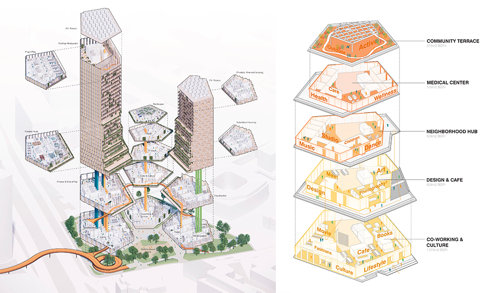 En opinión unánime del jurado, “el diseño de UNStudio crea un proyecto arquitectónicamente excepcional y que forma identidad en una ubicación central. La visión incluye una mezcla de usos que, además de oficinas y residencial, también incluye usos multifuncionales en el pabellón comunitario -el llamado Urban Hub- y en las plantas superiores, que serán parcialmente accesibles al público. En el futuro, los usuarios del barrio podrán organizar su vida diaria de forma centralizada en un solo lugar, ya que la oferta también incluirá gastronomía, servicios médicos, deportes, fitness, un centro de movilidad, una guardería, suministro local y ofertas culturales o entretenimiento educativo. Al colocar a los residentes en el centro de la agenda, el proyecto cumplirá con los requisitos futuros en materia de condiciones de trabajo, de vida y de vivienda”.