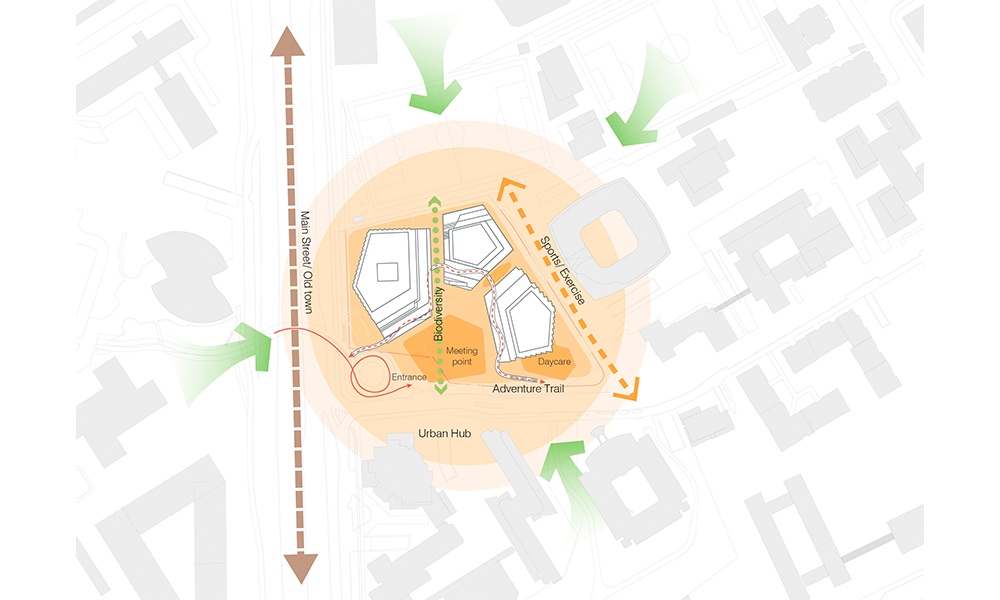 Para diferenciarse de las torres individuales cercanas en el horizonte de la ciudad de Düsseldorf, el proyecto New Heart está organizado como dos torres altas y esbeltas que rodean un centro comunitario. Esta masa permite una mayor ventilación y comodidad del viento, al tiempo que contrasta con el grupo de edificios de gran altura en Kennedydamm, creando así un centro claro para el vecindario. Balcones y terrazas profundas, un parque público, una generosa plaza vecinal y la inclusión de un centro comunitario crean un espacio público animado que ofrece espacio para eventos temporales y abre el sitio a residentes y visitantes por igual.