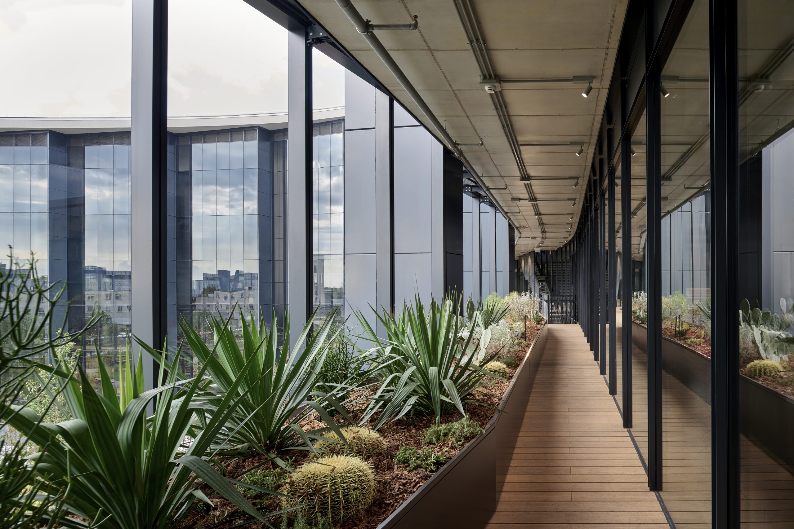 La envolvente del edificio, inspirada en instalaciones manufactureras históricas de varios pisos, se presenta externamente como un volumen sólido y compacto que, abriéndose hacia el interior, se disuelve en un gran patio acristalado. Esta configuración deliberadamente introspectiva está diseñada para maximizar la entrada de luz natural y crear una continuidad visual y perceptiva entre los espacios de trabajo y el corazón verde del edificio. La fachada sur se abre a un jardín interno de aproximadamente 7,500 metros cuadrados, diseñado en colaboración con Parcnouveau. El proyecto incorpora árboles nativos de gran altura y un claro central equipado como espacio para la interacción social informal y actividades al aire libre, sirviendo como una extensión natural de los ambientes interiores. La histórica chimenea, un elemento icónico del sitio, ha sido reutilizada como dispositivo pasivo para captar aire exterior. El aire se toma a una altura de 60 metros y se distribuye dentro de un invernadero bioclimático, un espacio transicional que sirve de amortiguador entre el interior y el exterior. Este entorno transitable alberga tres ecosistemas distintos: estepa, matorral mediterráneo y desierto frío, con especies vegetales seleccionadas por su resiliencia y adaptabilidad a las condiciones climáticas locales. Juntos, el invernadero bioclimático y el área verde exterior forman un sistema ecológico integrado que contribuye a la regulación del microclima y fortalece el diálogo entre arquitectura y naturaleza.