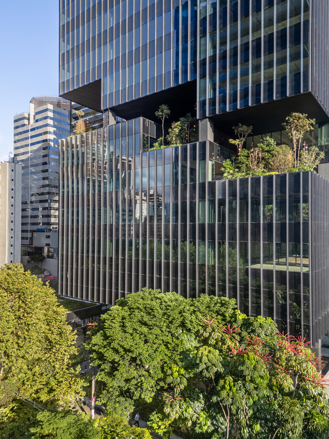 Uno de los aspectos más distintivos de este proyecto es la presencia de bosques de 110 m² con techos de doble altura en todos los pisos. Estos espacios fueron concebidos en una disposición en espiral alrededor del núcleo central del edificio, que alberga los ascensores y las escaleras. Con un área total de 1760 m² de bosque vertical, este enfoque innovador ofrece ambientes revitalizantes en plena Av. Faria Lima, ya que los bosques actúan como aislante térmico, barrera acústica y generan un microclima agradable en los espacios internos de la torre, brindando una nueva experiencia en la forma de trabajar.