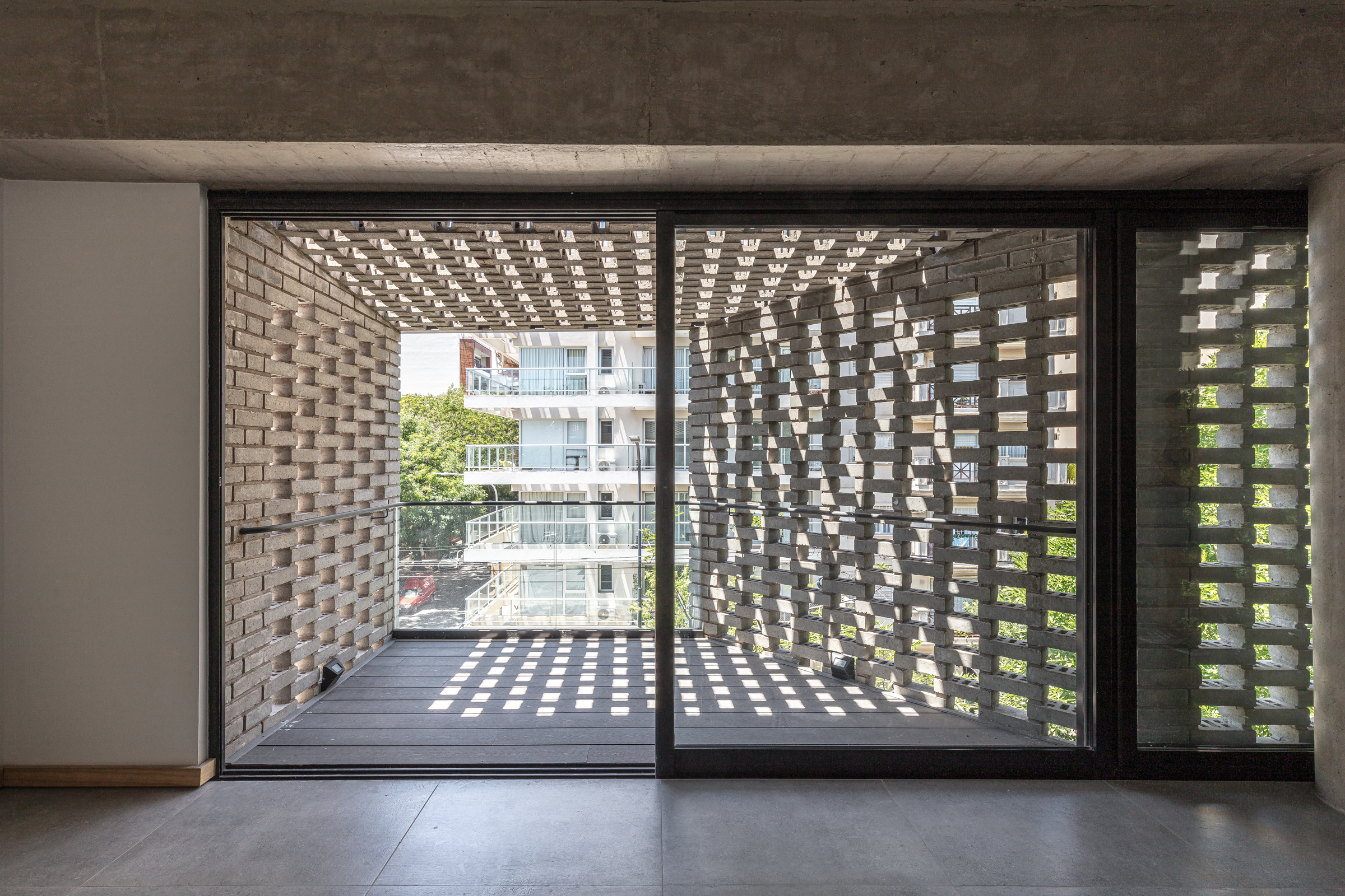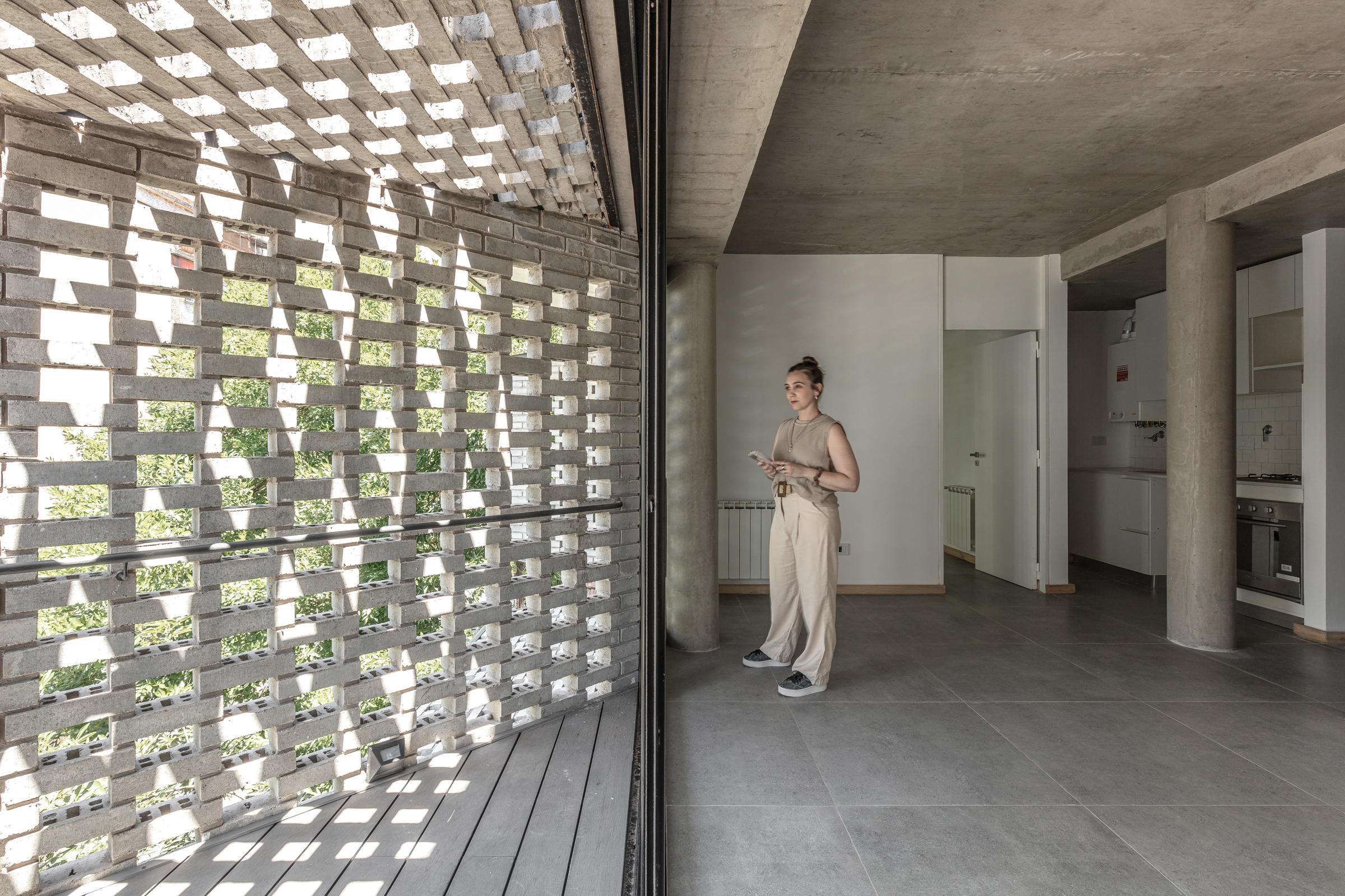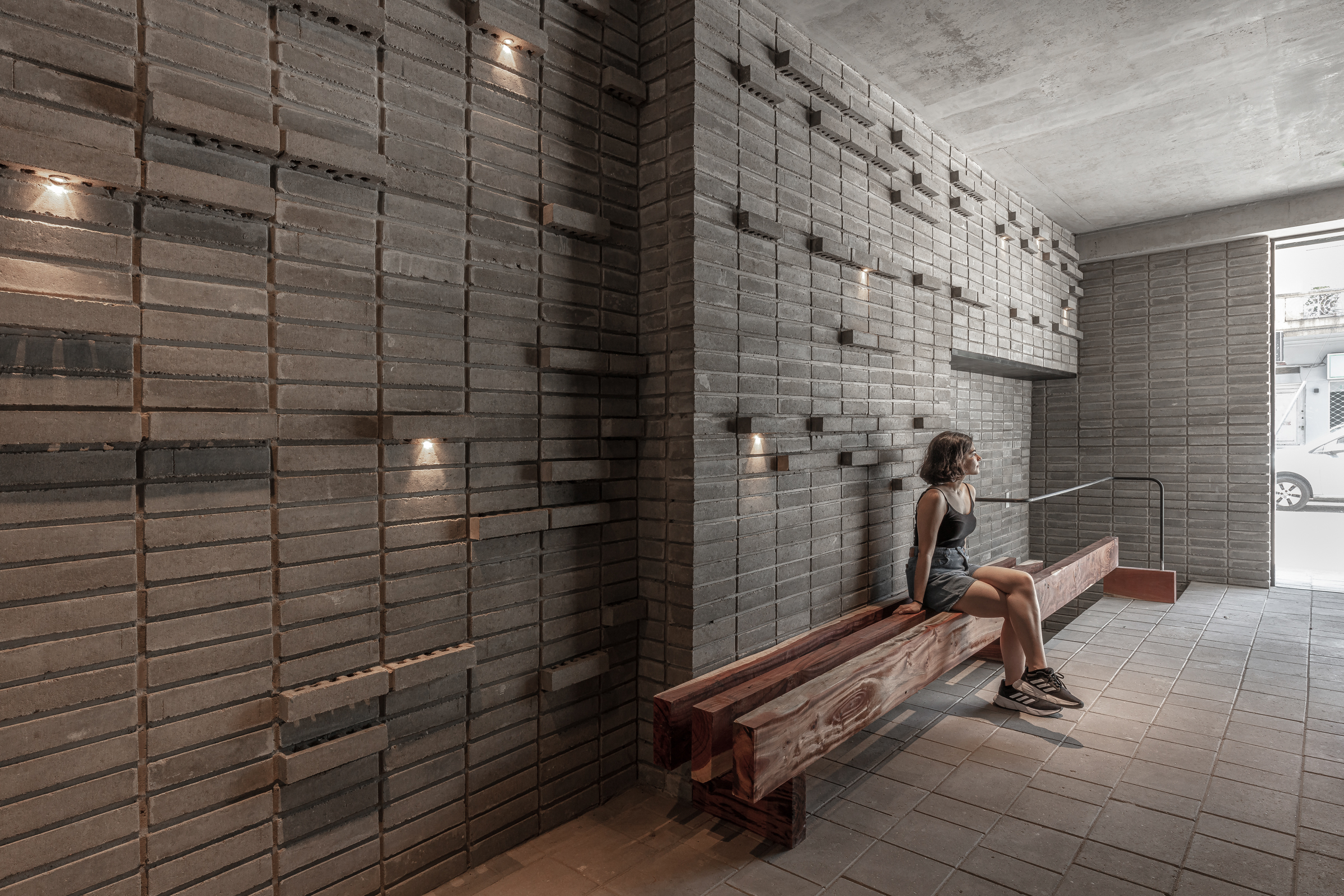 El edificio maximiza su capacidad constructiva, a partir de una envolvente mono material utilizando el ladrillo Bricko de Corblock. En ese sentido se permite una experimentación material a partir de diversas operaciones morfológicas precisas (repetición, sección, vinculación) para asumir su propia complejidad, e investigar los encuentros, las disposiciones, los modos de unión y las fijaciones con la intención de configurar una atmósfera deseada. (luz y espacio en una interpelación constante).
