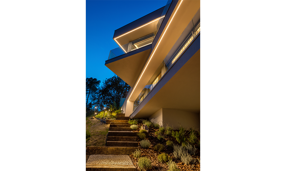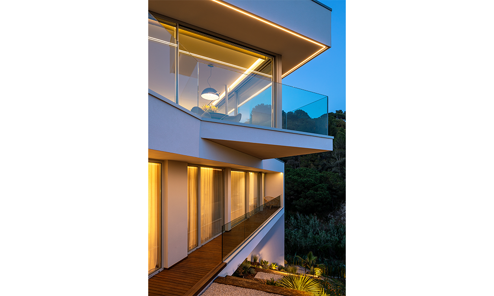 Diseñada a partir de dos volúmenes geométricos sobrepuestos, de diferentes dimensiones y ligeramente rotados, que emergen del terreno dejando una de sus aristas aparentemente flotando en el aire. Es el punto de contacto entre ambos volúmenes que actúa como núcleo de comunicación. El cuerpo superior que se eleva sobre el ambiente boscoso ha sido destinado a la planta de día, utilizando un diseño abierto para generar una convivencia fluida de todas las estancias, mientras que la planta inferior se ha reservado a los dormitorios y al estudio, disfrutando del paisaje mediterráneo, mientras que el corredor de acceso se abre al patio trasero facilitando la ventilación cruzada.