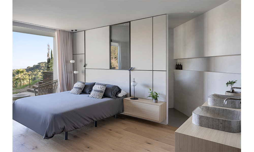 – El interiorismo de Casa ladera se ha realizado pensando en crear un espacio de descanso y desconexión en el que predominan los tonos neutros, el uso de materiales cálidos y una cuidada iluminación que contribuye a generar confort y bienestar.