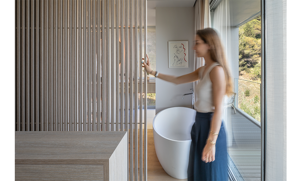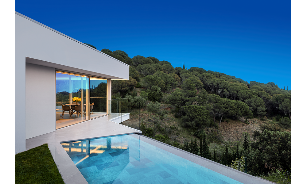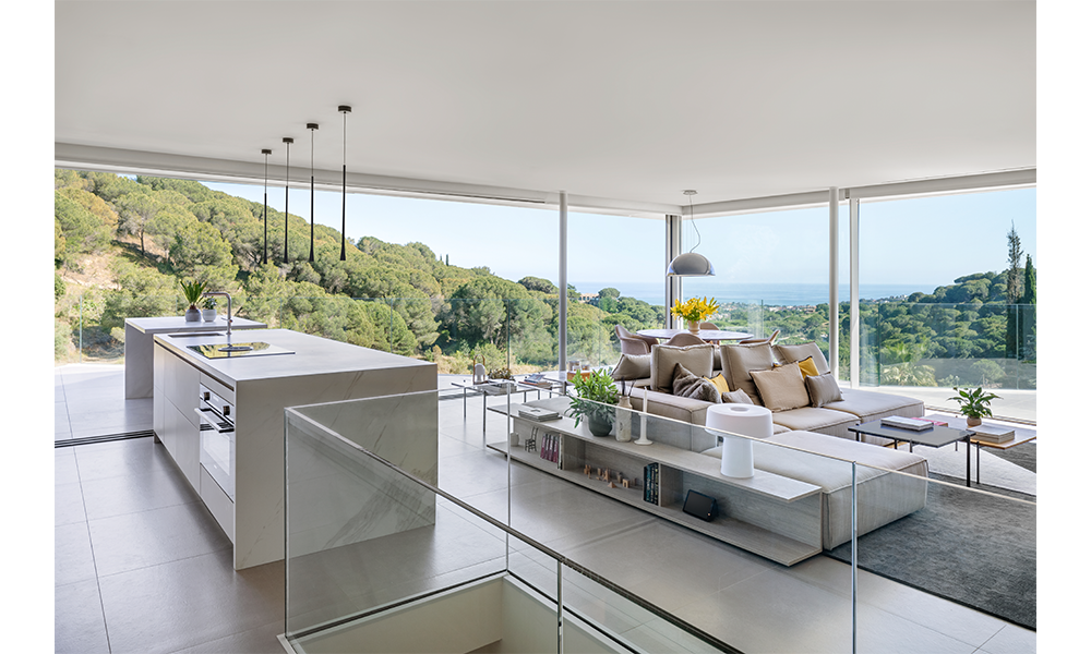 Todas las estancias de la vivienda se abren a través de grandes ventanales hacia el paraje natural que las rodea, permitiendo disfrutar del entorno a la vez que se aprovecha al máximo la luz natural. Una configuración que permite difuminar las barreras que separan los espacios interiores de los exteriores, eliminando los límites al hacer desaparecer las ventanas correderas en una estructura que las recoge fuera de los muros de la casa.