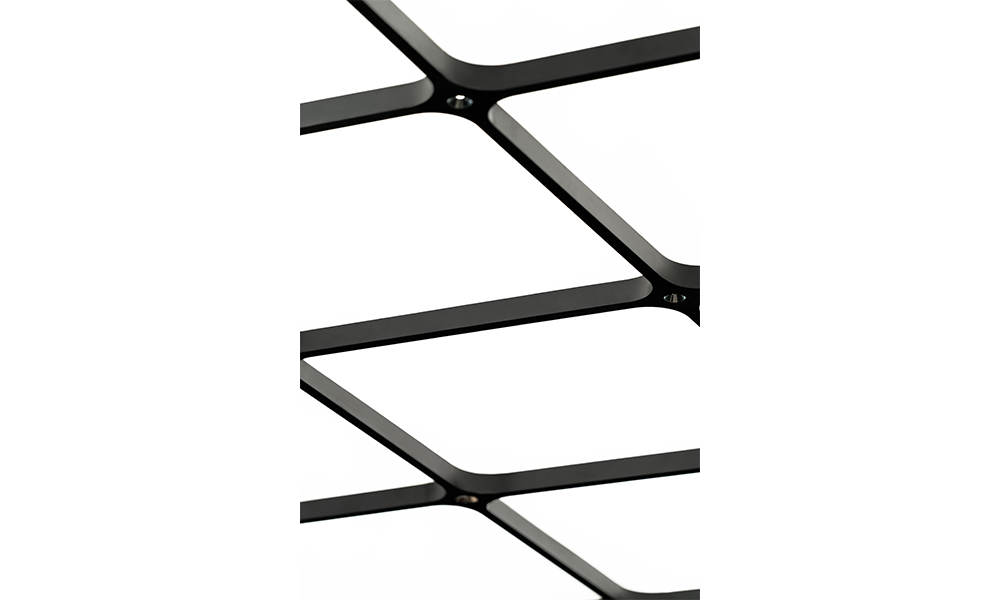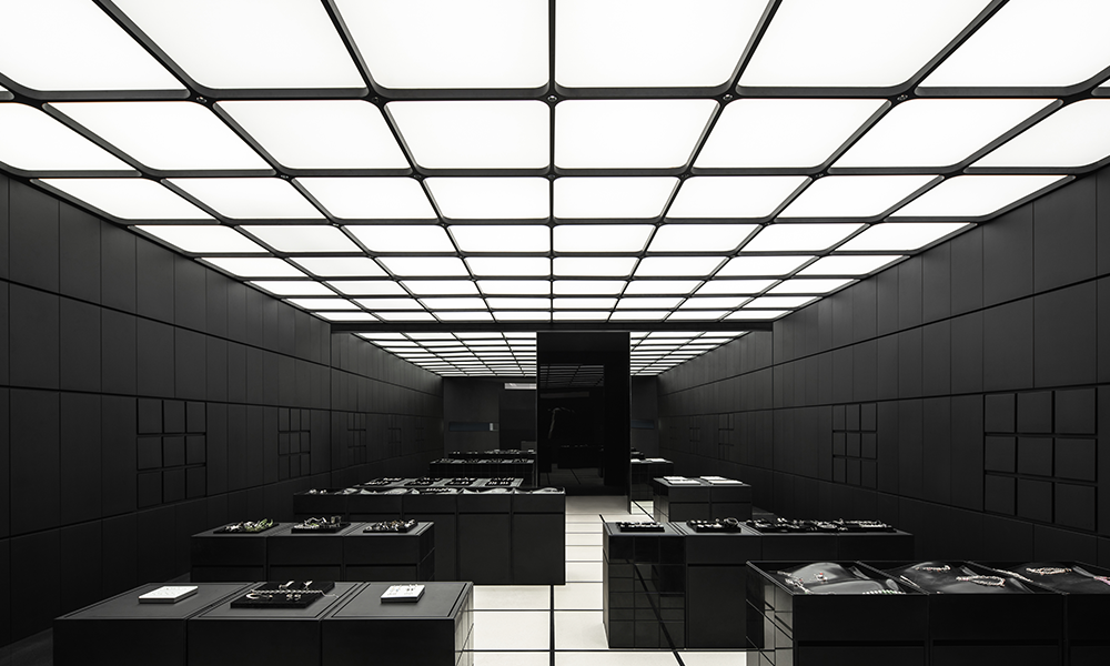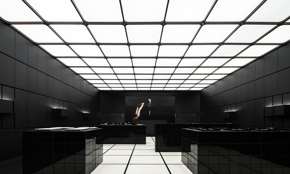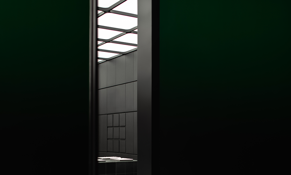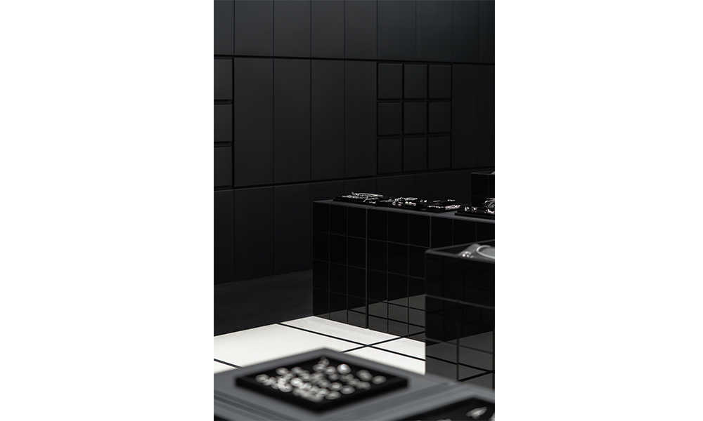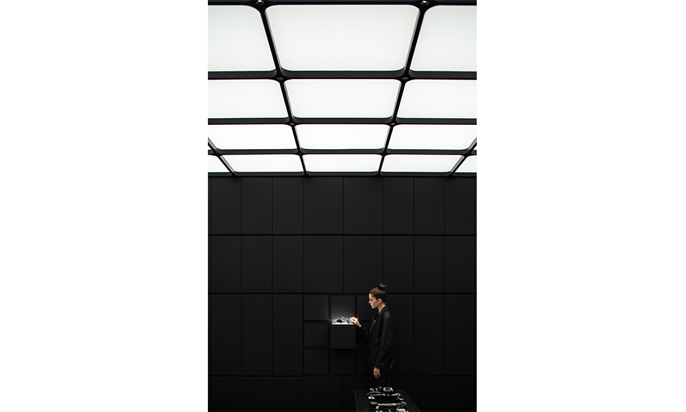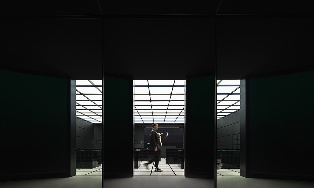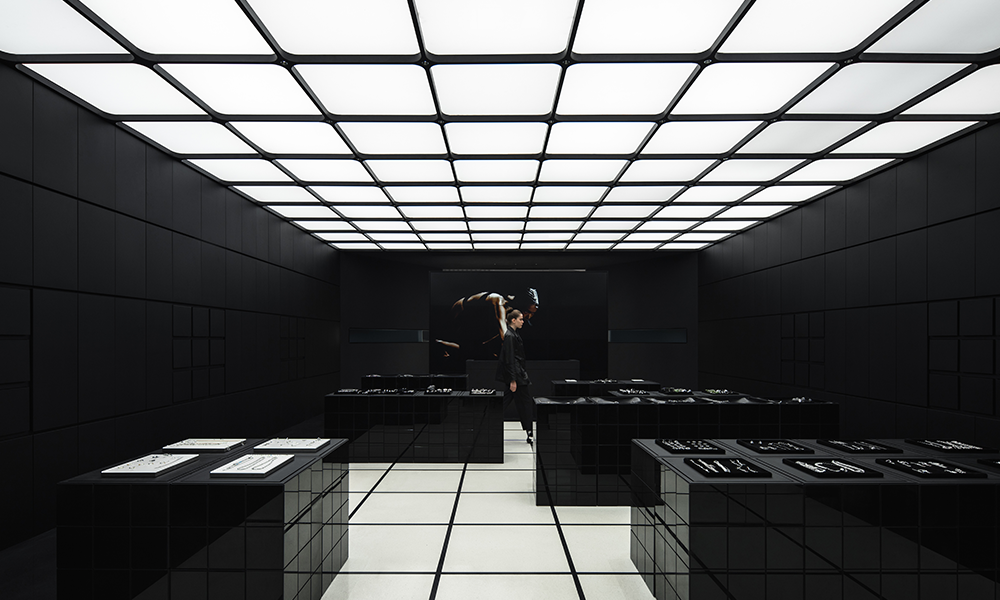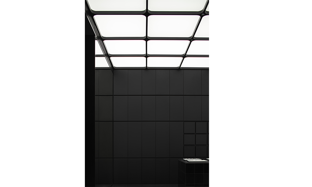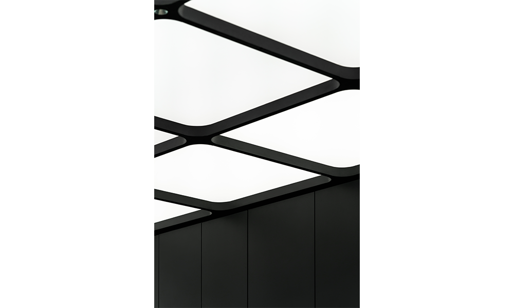 La pared interior de color negro puro se encuentra a ambos lados, con módulos emisores de luz de 3×3 que se extienden libremente como un grupo, que combina las funciones de exhibición de productos e iluminación al dibujar y unir con la iluminación. Cuando se sacan los «cajones», la luz se enciende inmediatamente. Mientras cumple con la función de exhibición, el interés aumenta a través de la disposición de la matriz, proporcionando diferentes cabinas para el cuerpo principal del espacio.