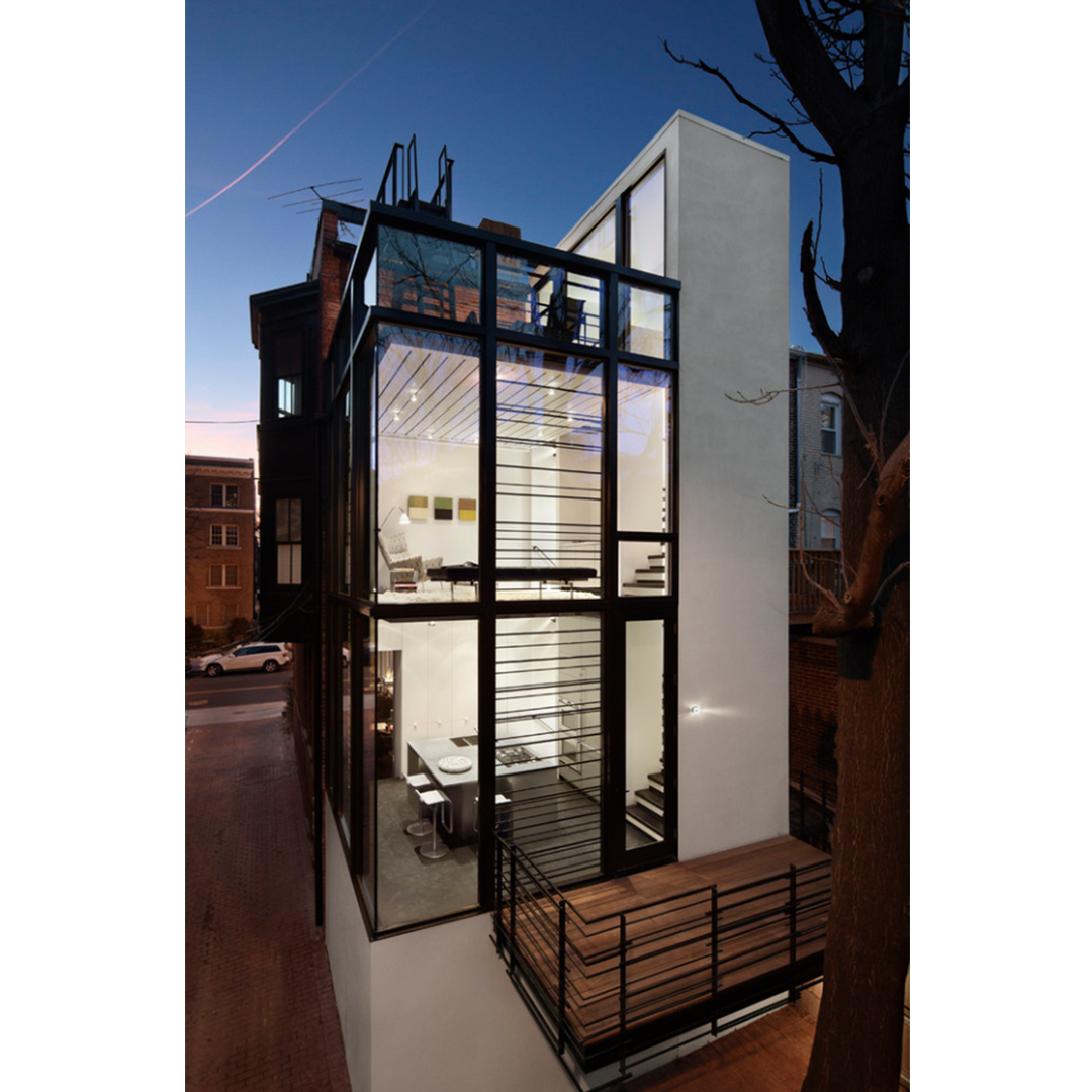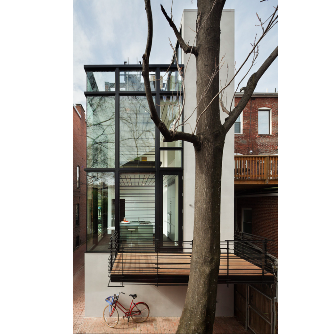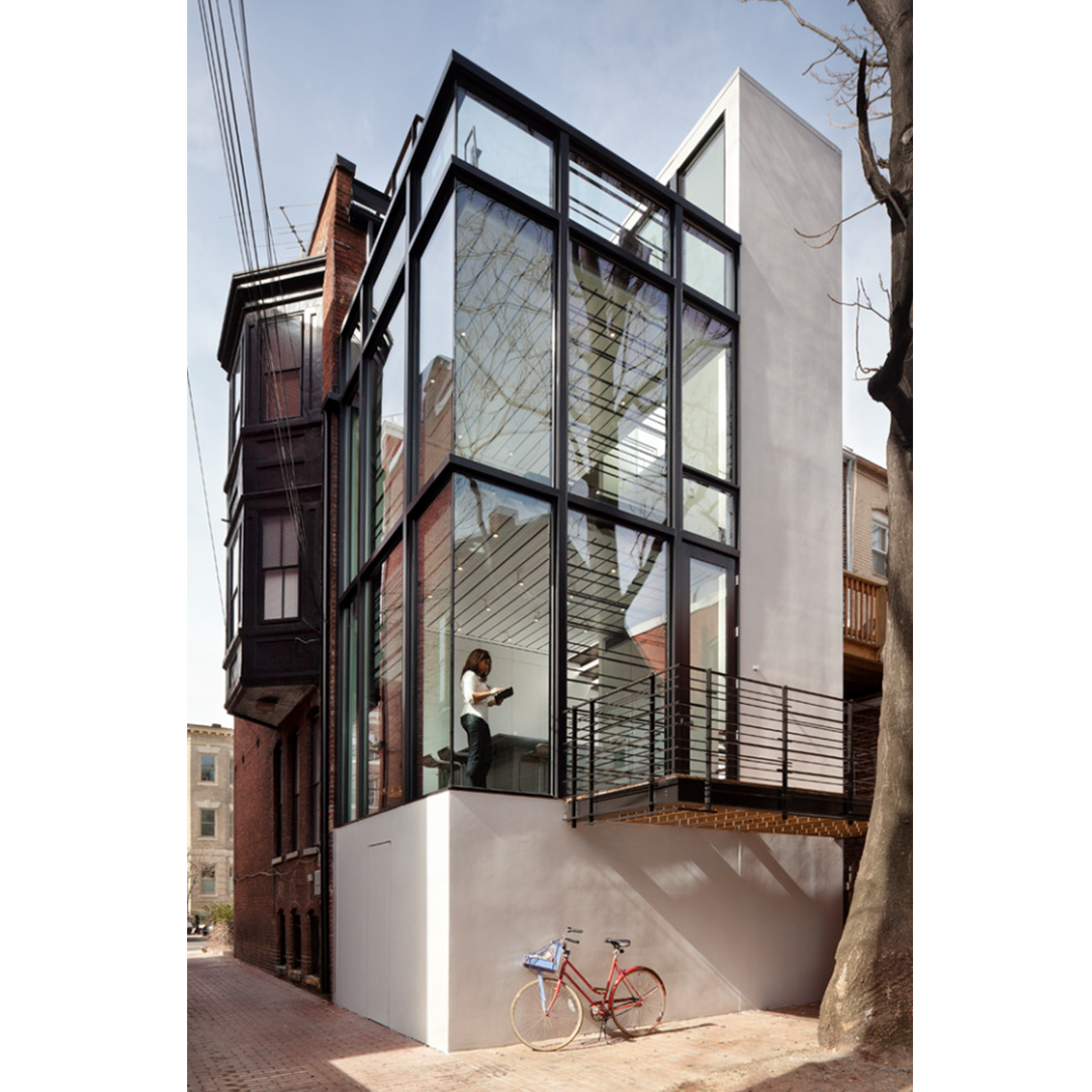 Los frágiles muros de mampostería existente en Washington DC, hicieron que la adición se diseñara como una estructura independiente. Las limitaciones del sitio dictaron una solución espacial orientada verticalmente.