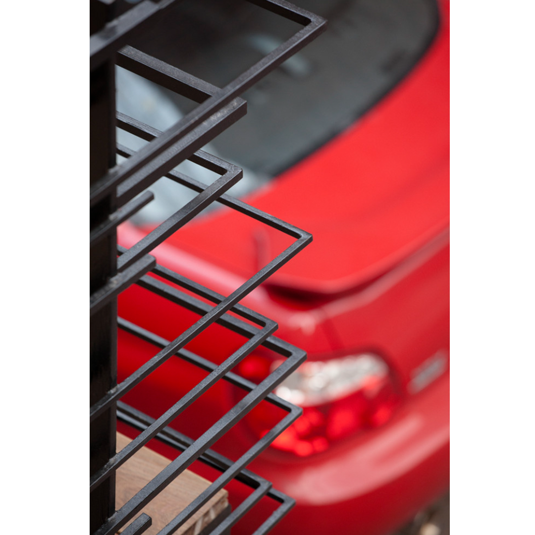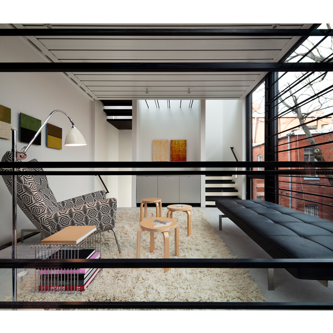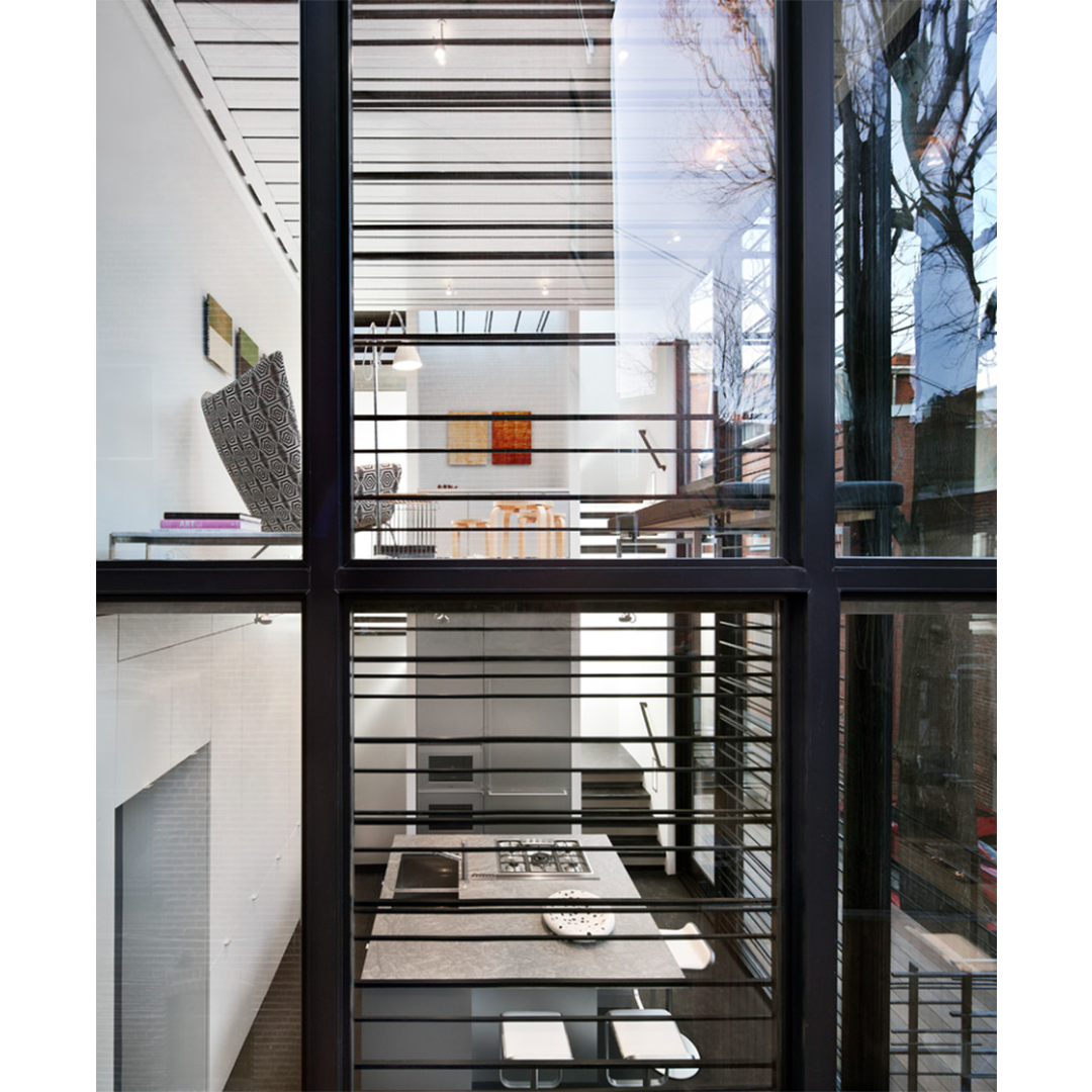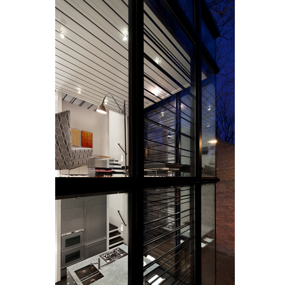 El deseo del cliente de tener un espacio de vida transparente, generó la oportunidad de crear una solución integral para las necesidades estructurales de la casa. Las barras estructurales de acero están alineadas con las líneas de referencia de las elevaciones del edificio vecino. David Jameson FAIA.