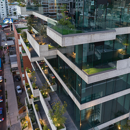 Desde la calle, la planta baja del edificio establece un diálogo con una primera capa verde; la acera no es sólo un lugar de paso sino de permanencia bajo la sombra de los árboles. Los pisos tipo se desarrollan en planta libre; el edificio regala a sus usuarios y su entorno, terrazas jardín con más de 40 especies de vegetación.