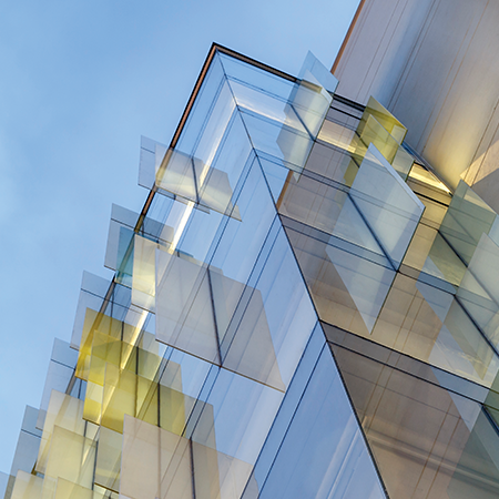 La fachada frontal tiene una orientación norte, por lo que es necesario pensar en una protección solar en el solsticio de verano. Se plantearon aletas de vidrio laminado y serigrafía de color como distintivo único de dos edificios pertenecientes a diferentes propietarios, la cromática se desprende de los colores corporativos de cada empresa para generar sentido de pertinencia.