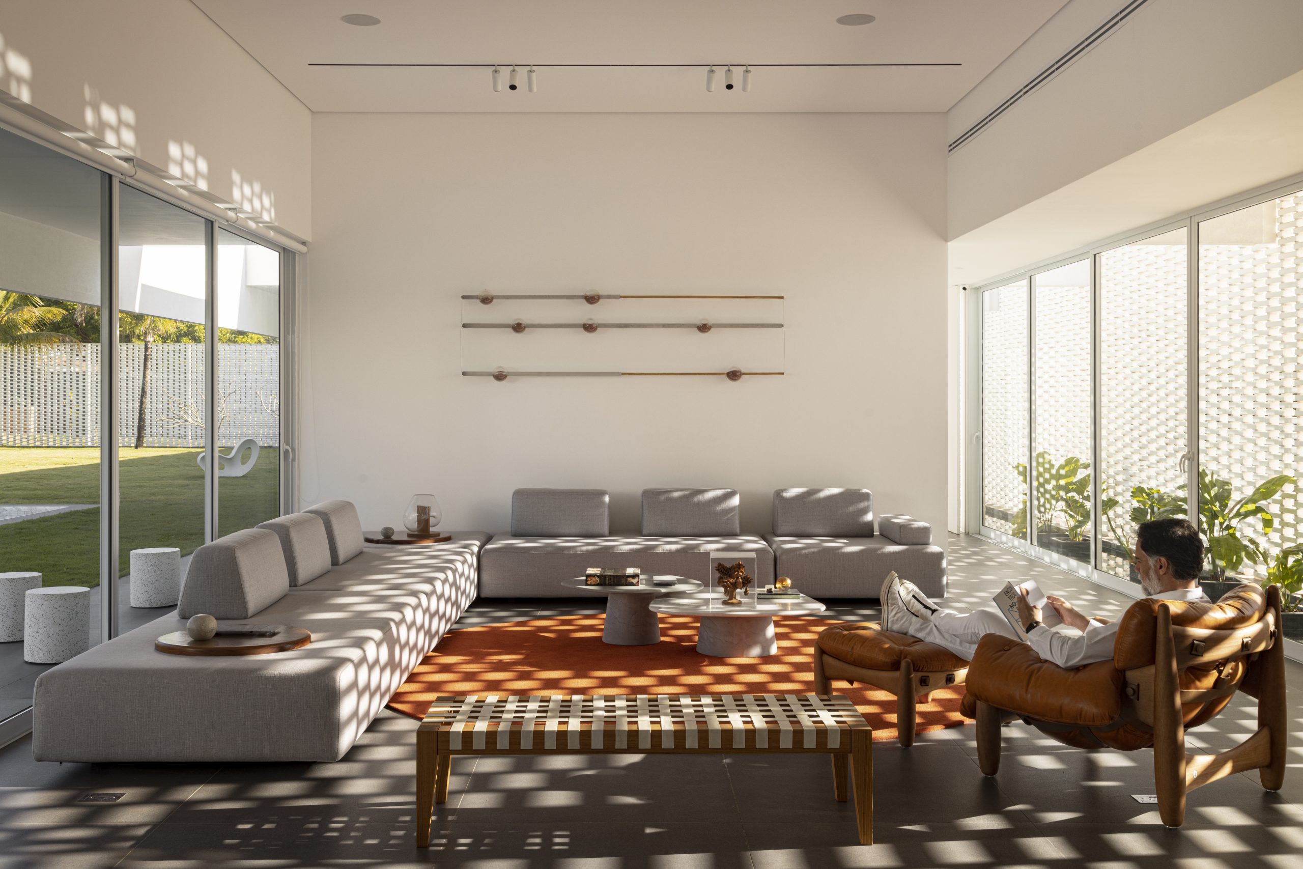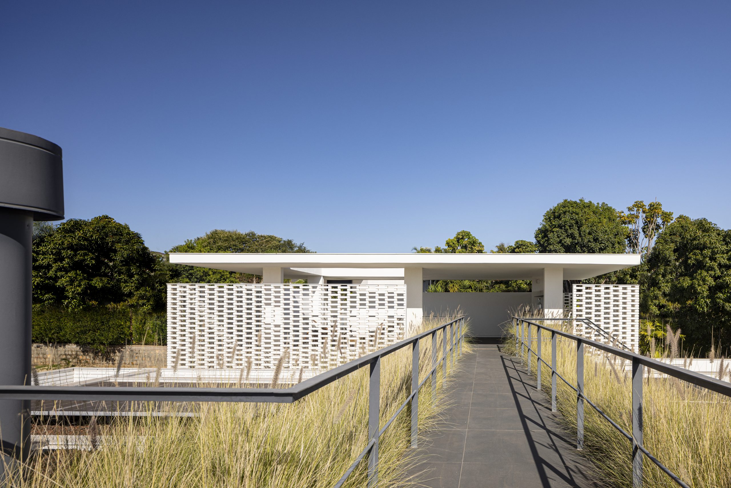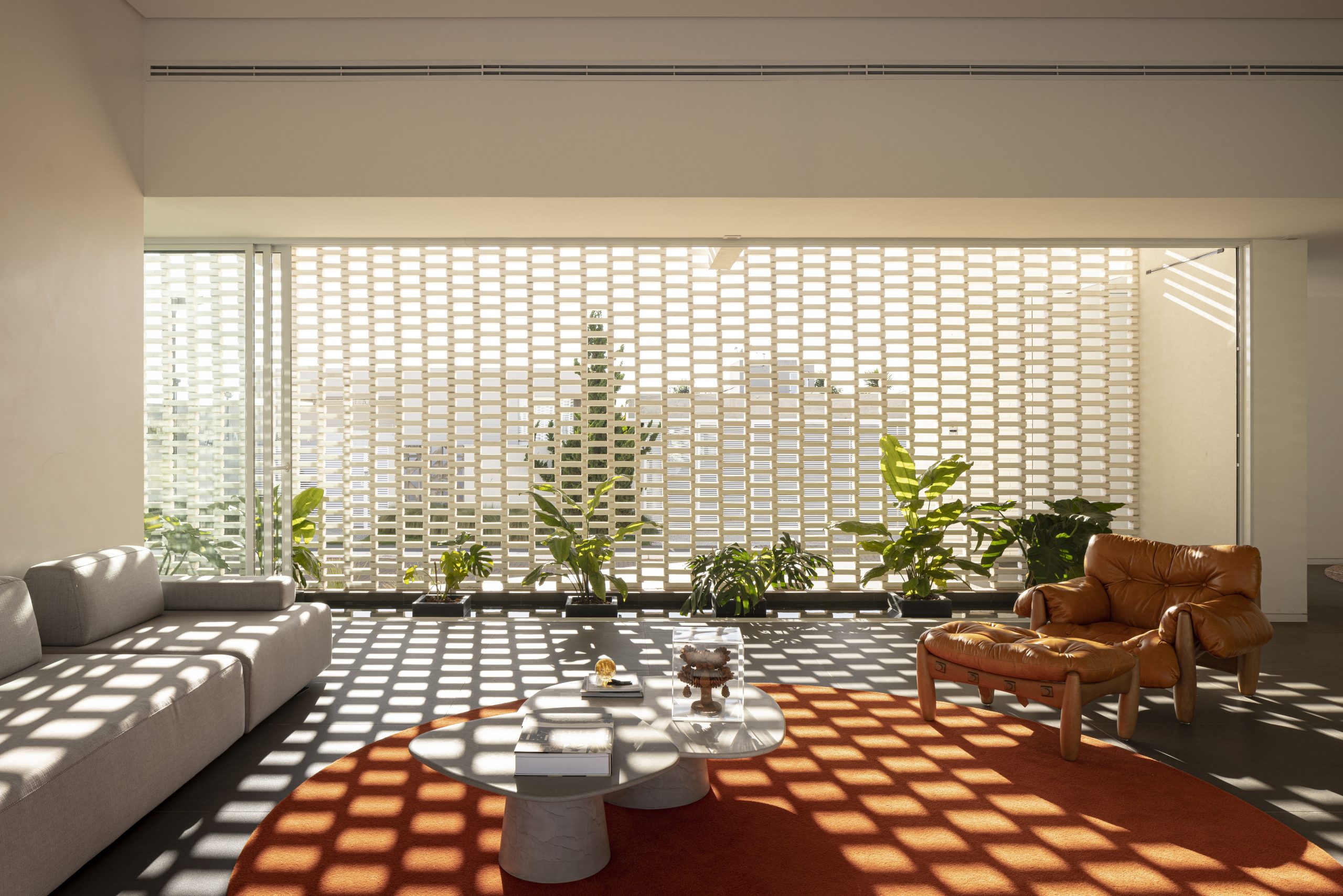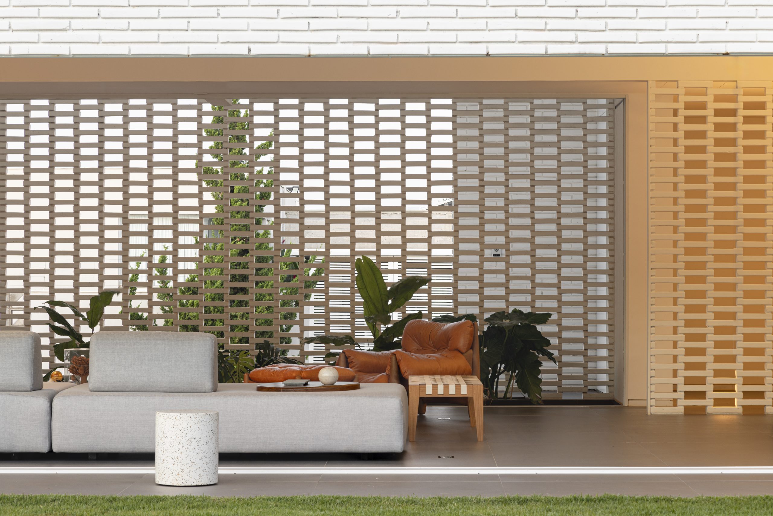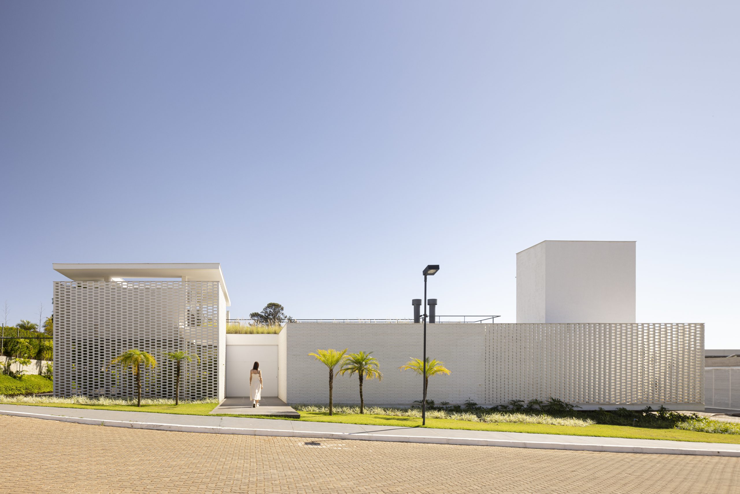 Construida en un complejo residencial en la región del Lago Sul de Brasilia, el programa de la Casa de Ladrillo Blanco se distribuyó alrededor del perímetro del terreno para que todas las estancias principales de la casa pudieran dar hacia el área central, con una amplia zona verde y una piscina semiolímpica. De esta manera, los dormitorios, salas de estar, balcones, cocina e incluso el garaje se orientaron hacia la amplia zona ajardinada, que funciona como patio central. Las fachadas están revestidas con una capa exterior de ladrillos macizos pintados de blanco. Sus diferentes grados de apertura se deben a la separación variable entre los ladrillos. El nivel de visibilidad a través de los ladrillos refleja los diferentes niveles de privacidad deseados para cada espacio interior. La disposición de huecos entre los ladrillos también permite la ventilación cruzada natural. Se trata, por lo tanto, de una «segunda fachada» que controla la luz solar directa y la privacidad deseada. Los ladrillos tienen tamaños alargados, fuera del estándar del mercado, encargados específicamente para este proyecto.