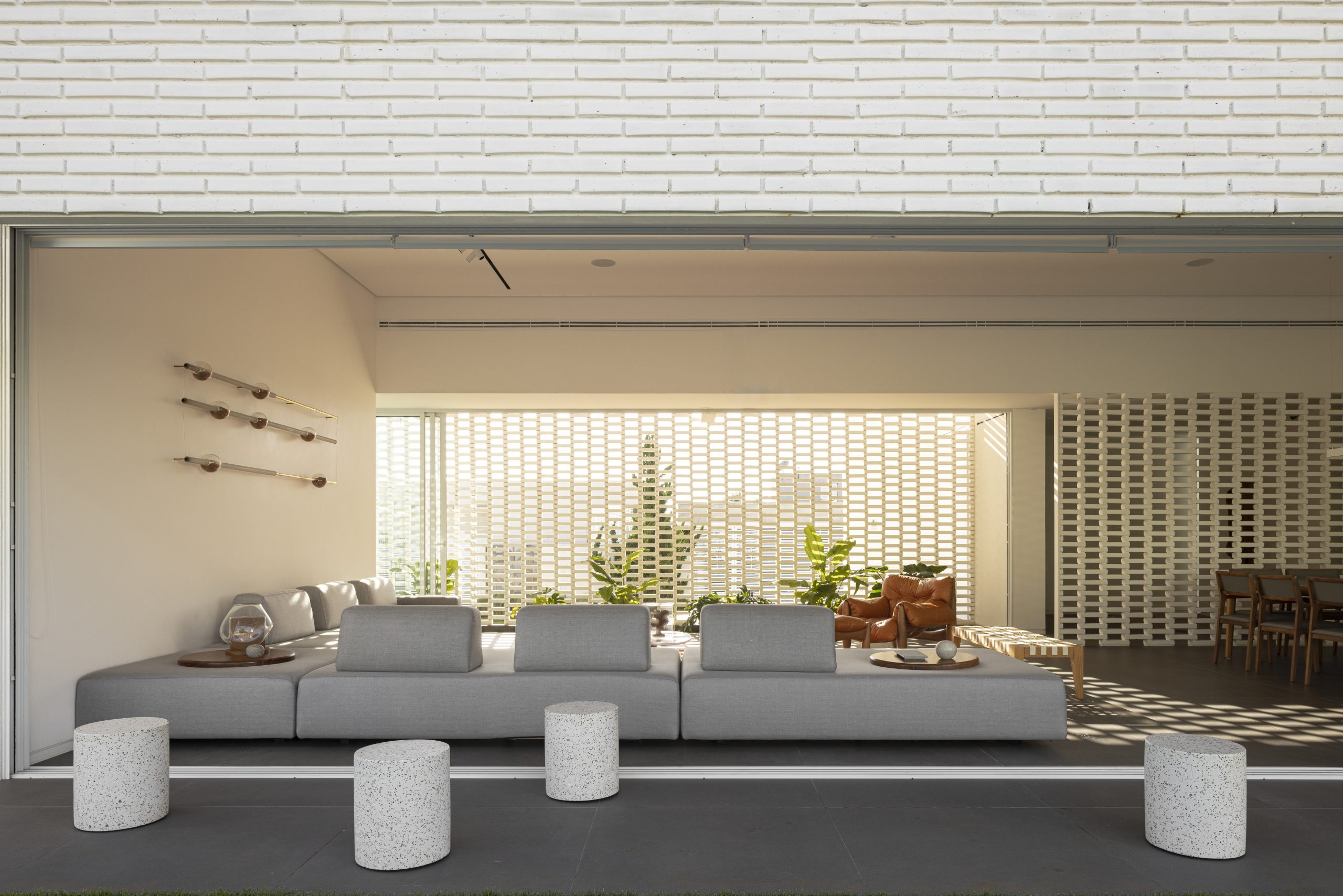 Los ladrillos espaciados reinterpretan uno de los objetos arquitectónicos más importantes de Brasilia, el cobogó, tan importante para la ventilación y la iluminación natural en la arquitectura brasileña.