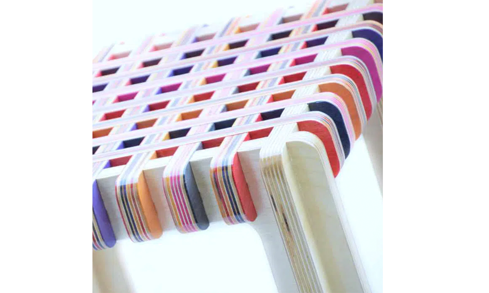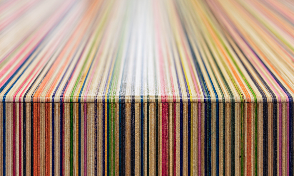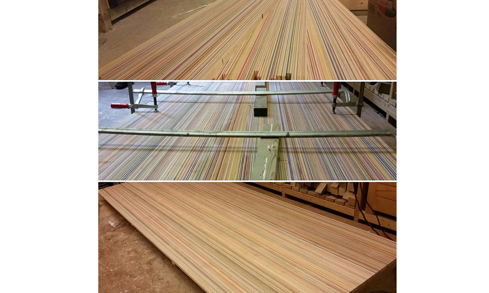 De la patineta a la obra de arte: Las viejas tablas de skate se quitan la lija, se lijan y se cortan en tiras. Las tiras se pegan en bloques de arcoíris en pilas de siete patinetas bajo alta presión. Estos bloques luego se cortan en rodajas de chapa. El patrón de la línea del arcoíris se crea con las coloridas capas de chapa de las patinetas usadas.