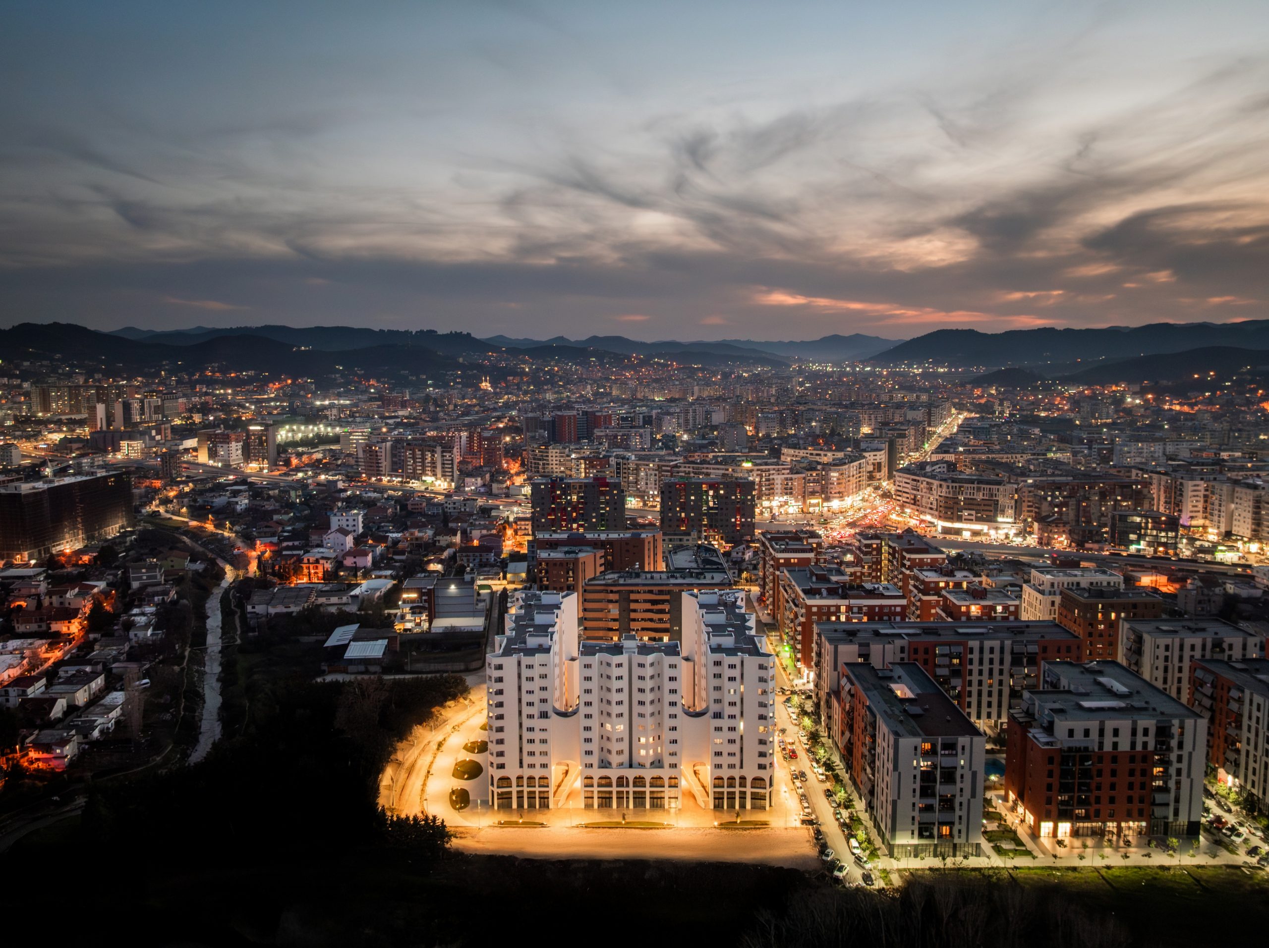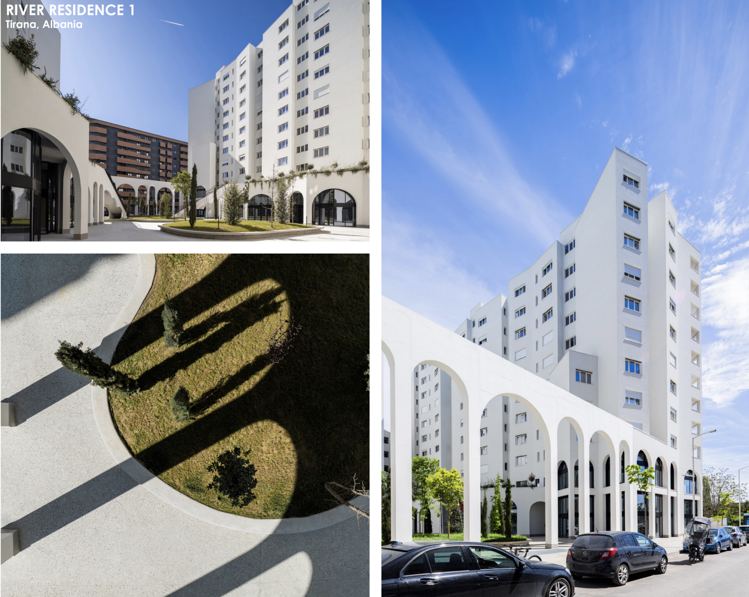 River Residences marca la puerta de entrada a un nuevo barrio en Tirana, compuesto por aproximadamente 200 viviendas con una superficie total construida de unos 25.000 metros cuadrados. Parte de un proyecto más amplio, se integra a la perfección en el sitio designado, con su diseño cuadrado que enfatiza su posición estratégica como punto de conexión entre el campo, la infraestructura de la ciudad y el nuevo barrio.