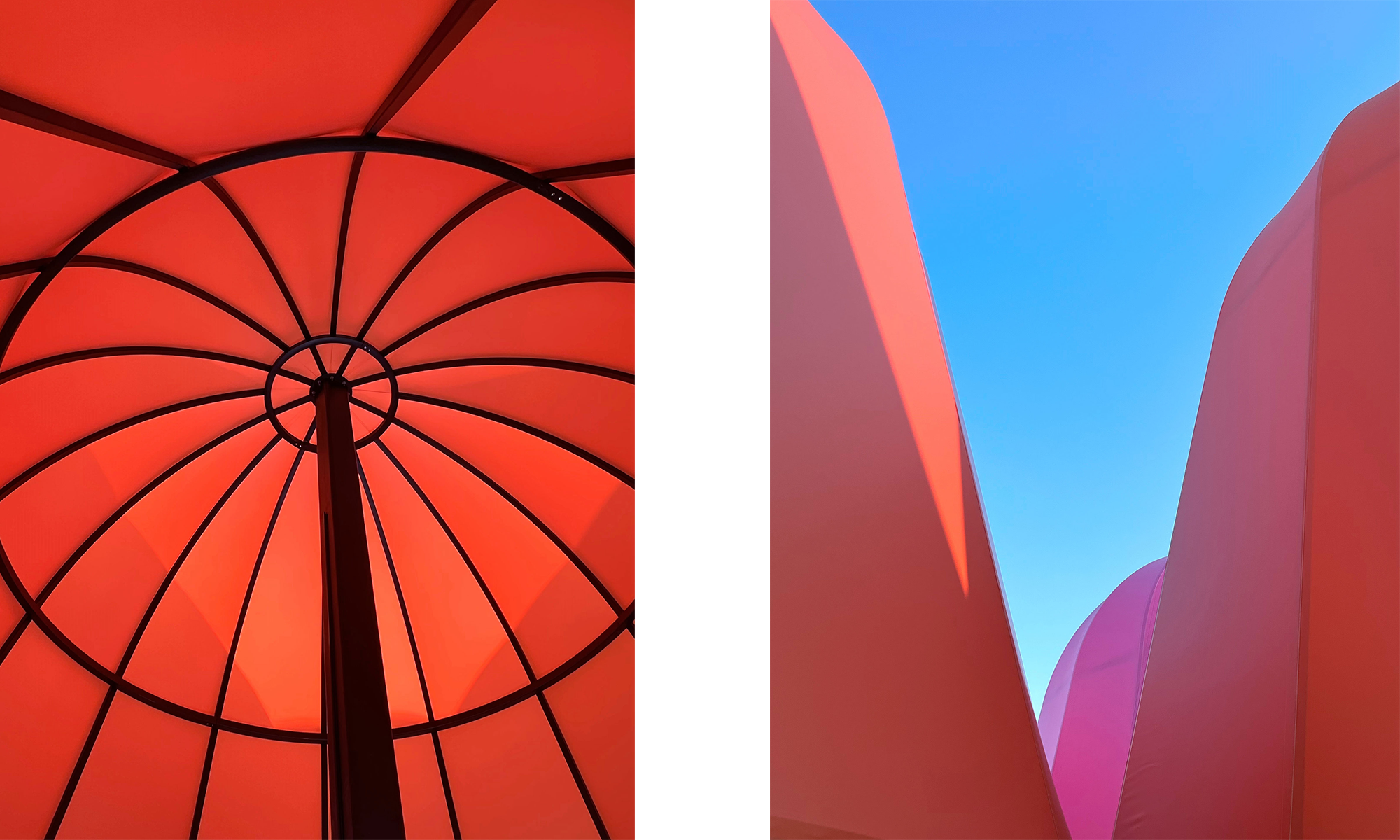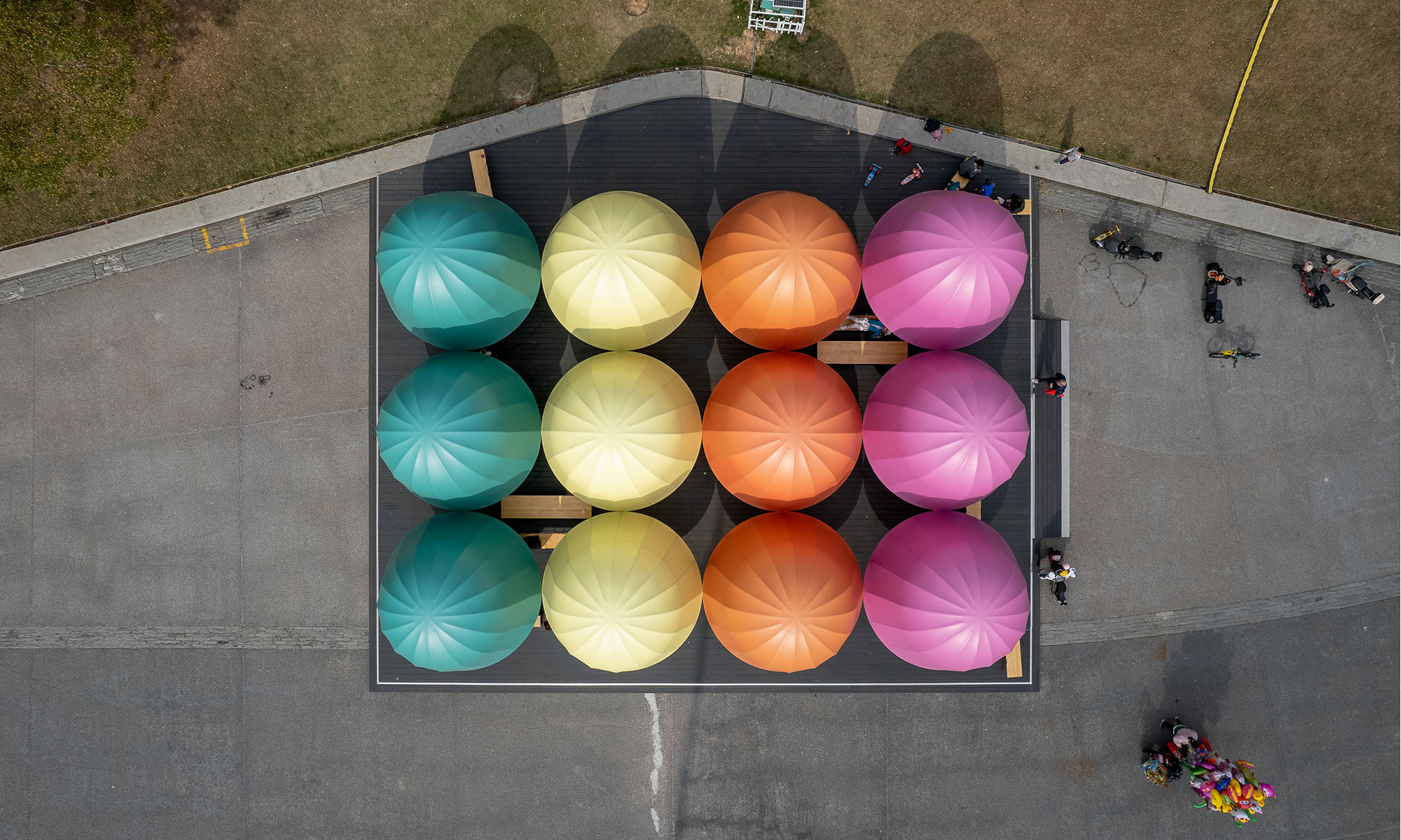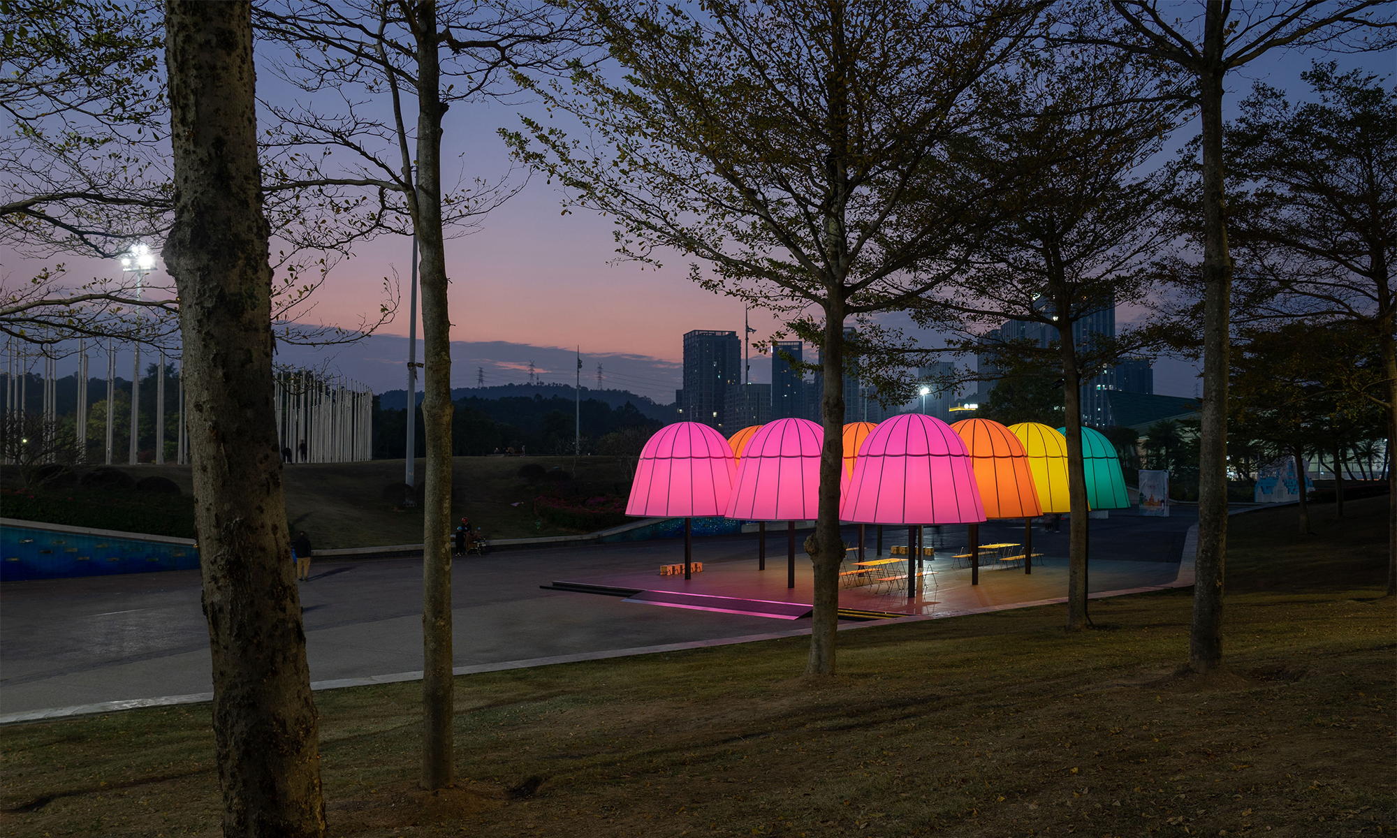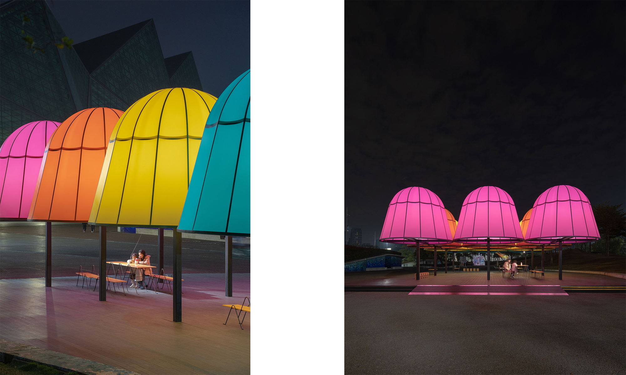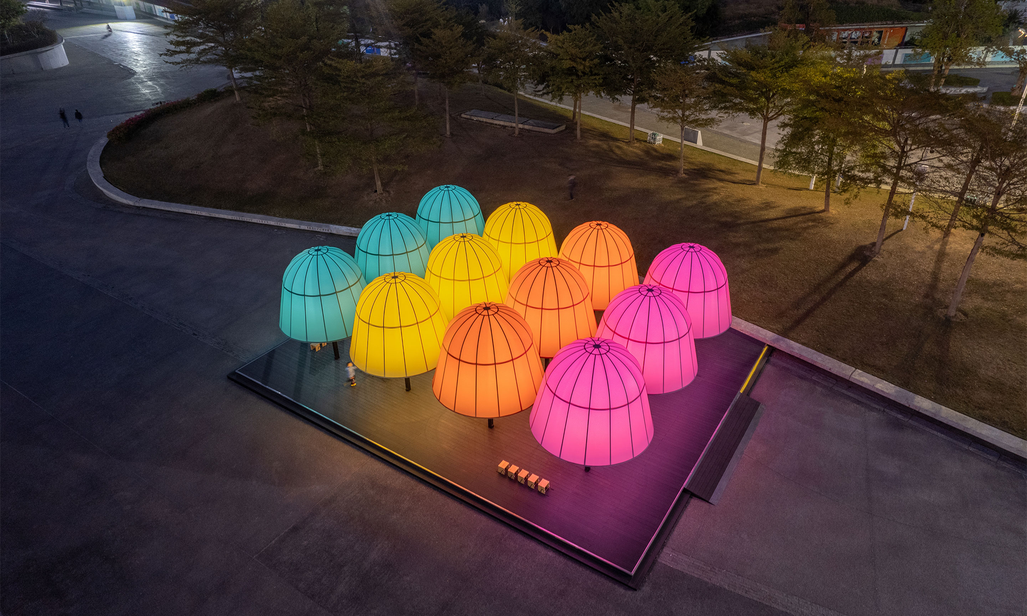 Las cúpulas de los pabellones están envueltas por películas blandas coloreadas, translúcidas y mate. Los diseñadores querían que el material tuviera una textura similar al papel y que permitiera la penetración de la luz; su carácter impermeable también convierte a los pabellones en un refugio temporal para los días de lluvia. Durante el día, el material transmisor de luz sombrea parte de la luz solar, asegurando la comodidad del espacio debajo de los pabellones; Después de la puesta del sol, los pabellones iluminados emiten una luz suave y colorida, lo que lo convierte en un espacio público destacado por la noche.