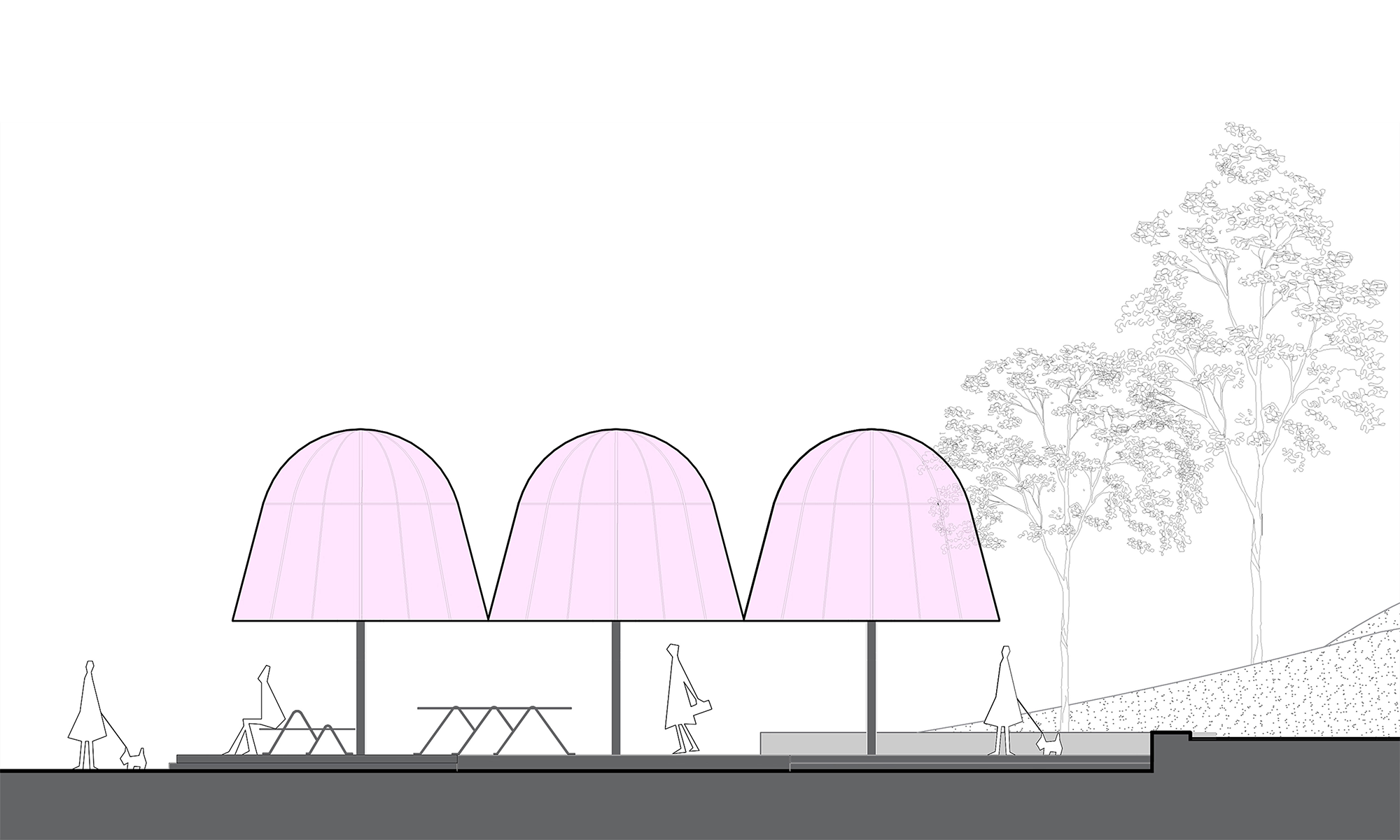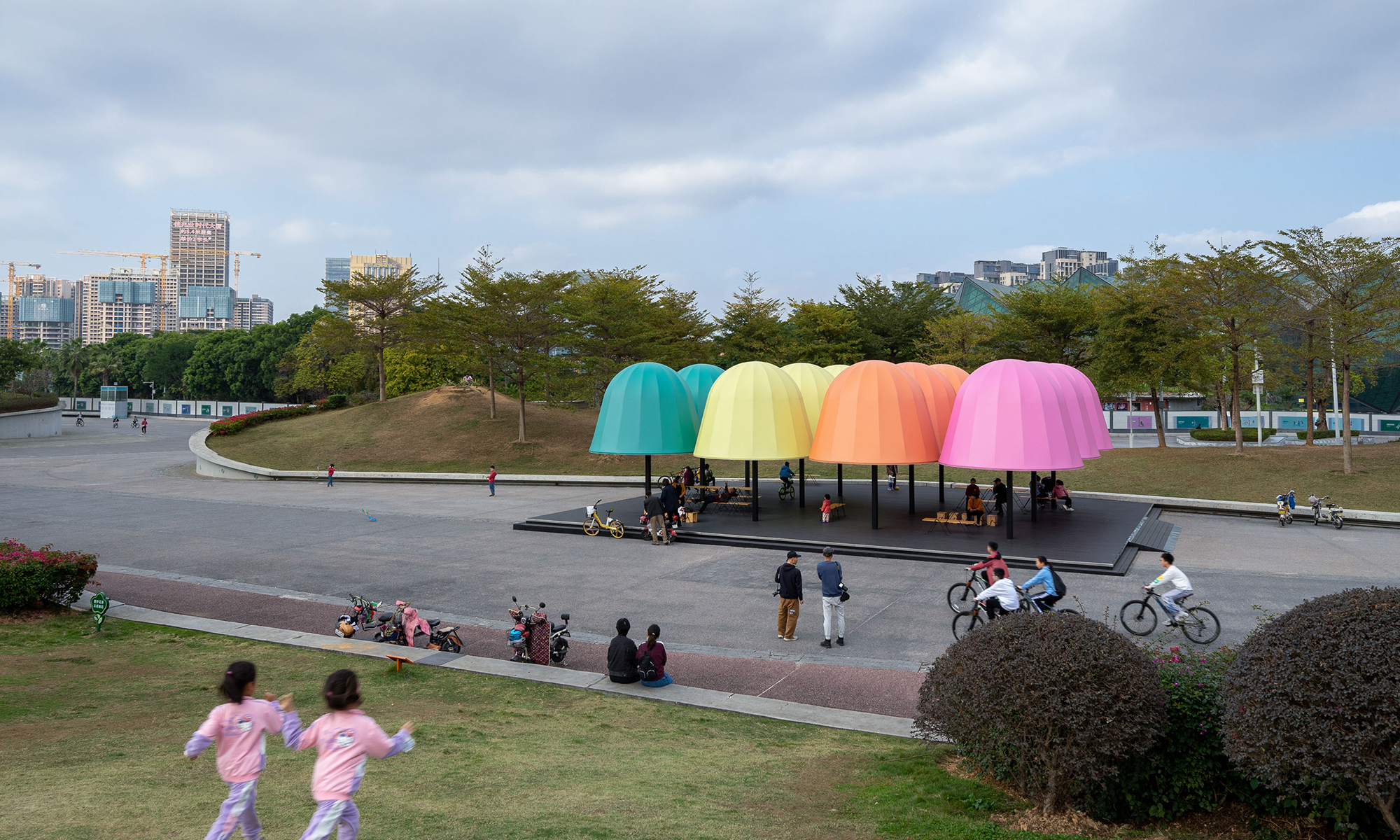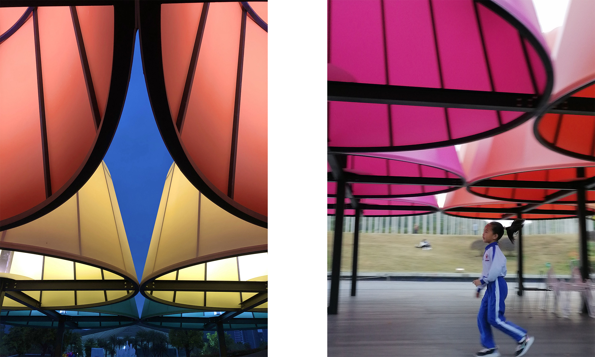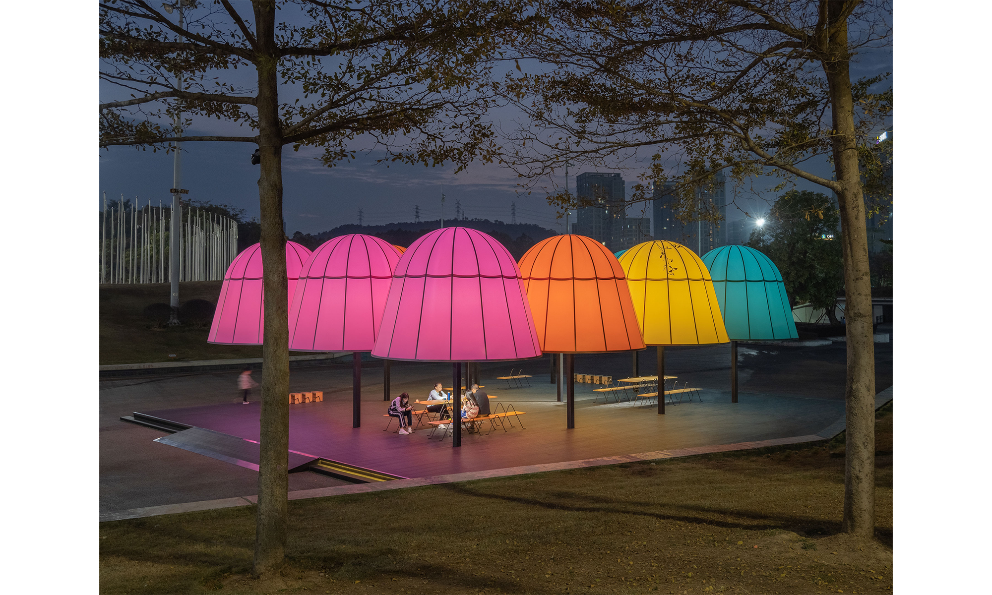 Esperamos que las personas desvíen brevemente su atención de los dispositivos digitales y vengan a los pabellones para disfrutar de los sutiles cambios de luces y sombras creados por los pabellones y los árboles circundantes, así como para observar el hermoso entorno ambiental y los niños jugando. Tomando la relación entre los humanos y la naturaleza como punto de entrada, la instalación brinda un espacio para el contacto social en persona que busca examinar, explorar y empoderar nuestro futuro compartido.
