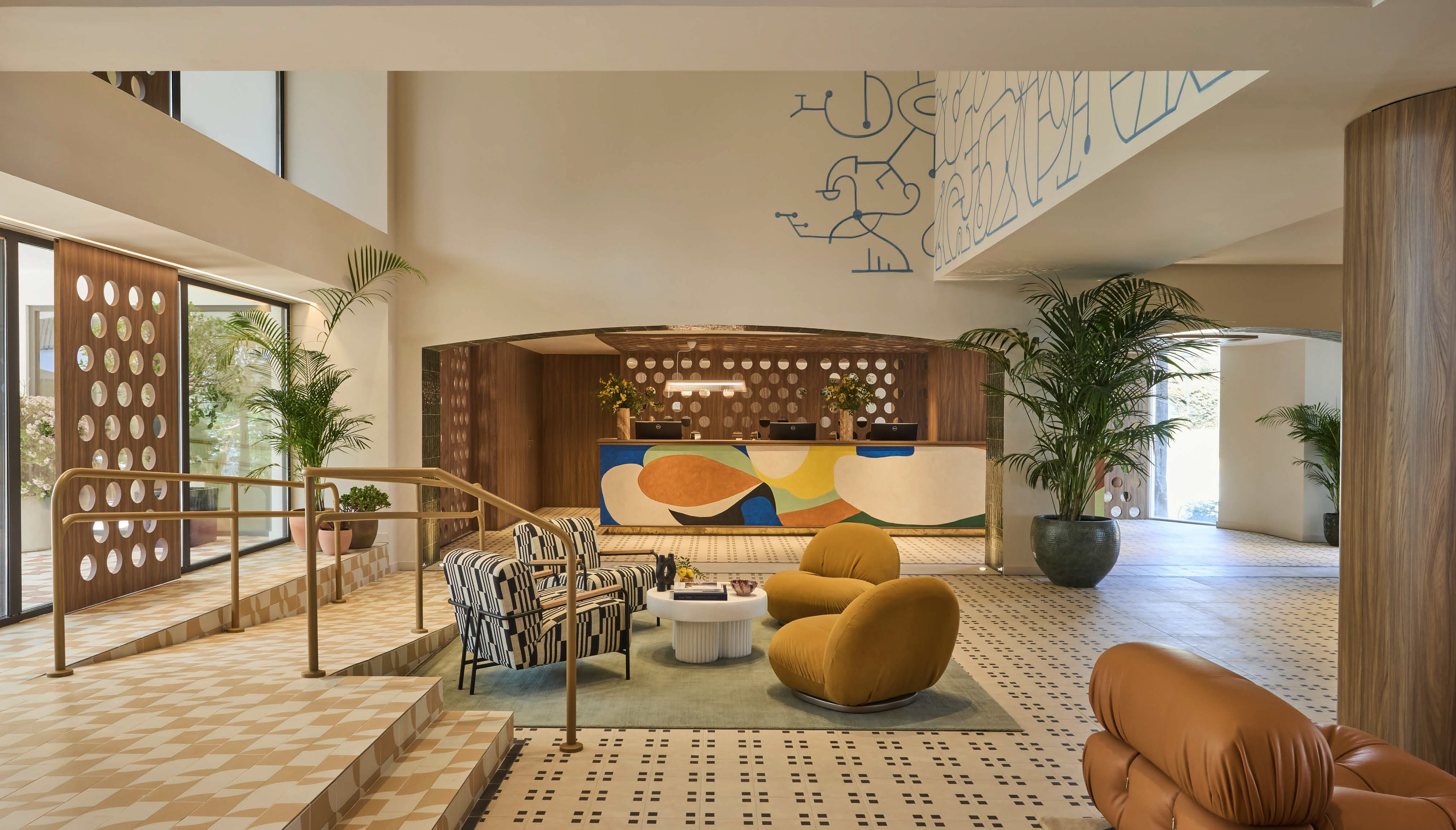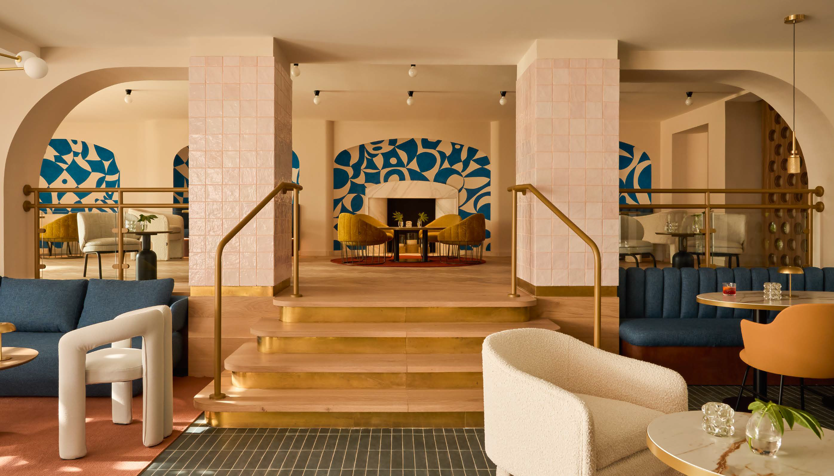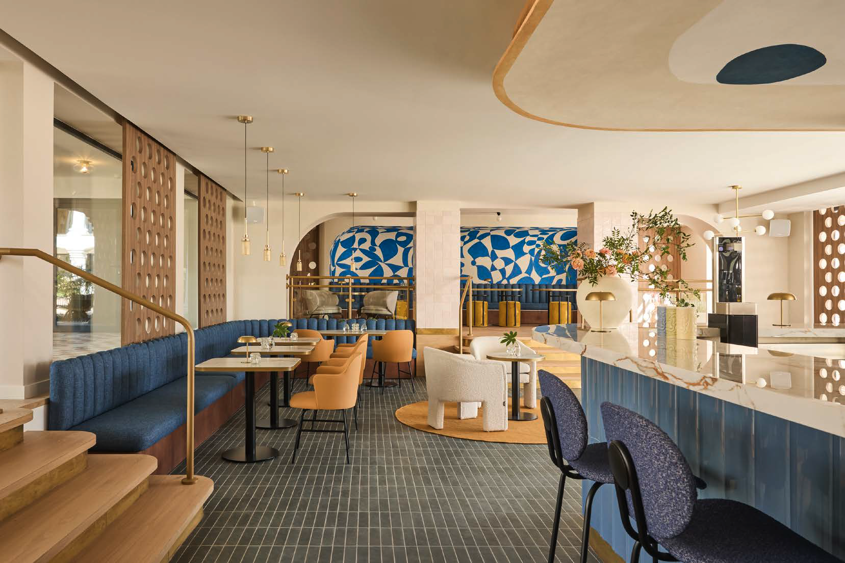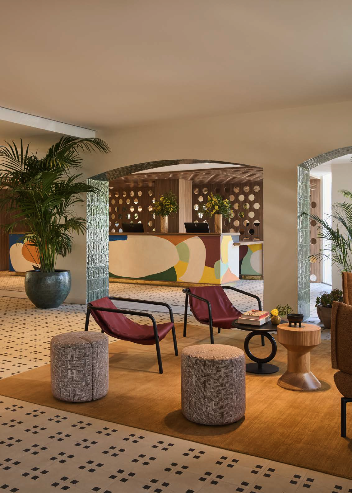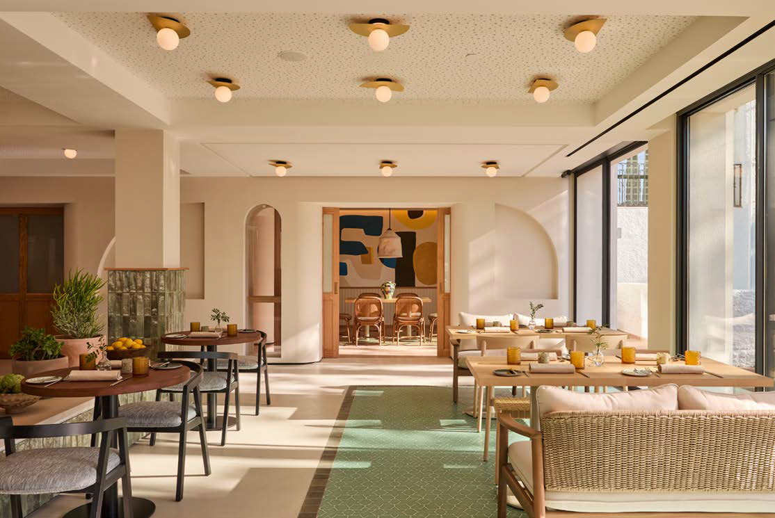 Aunque el diseño bebe de la tradición mediterránea, también incorpora un toque inspirado en los años 70, en homenaje a la arquitectura original del edificio de esa época. Esta influencia se refleja en el uso de patrones geométricos, nichos integrados y celosías que filtran la luz.