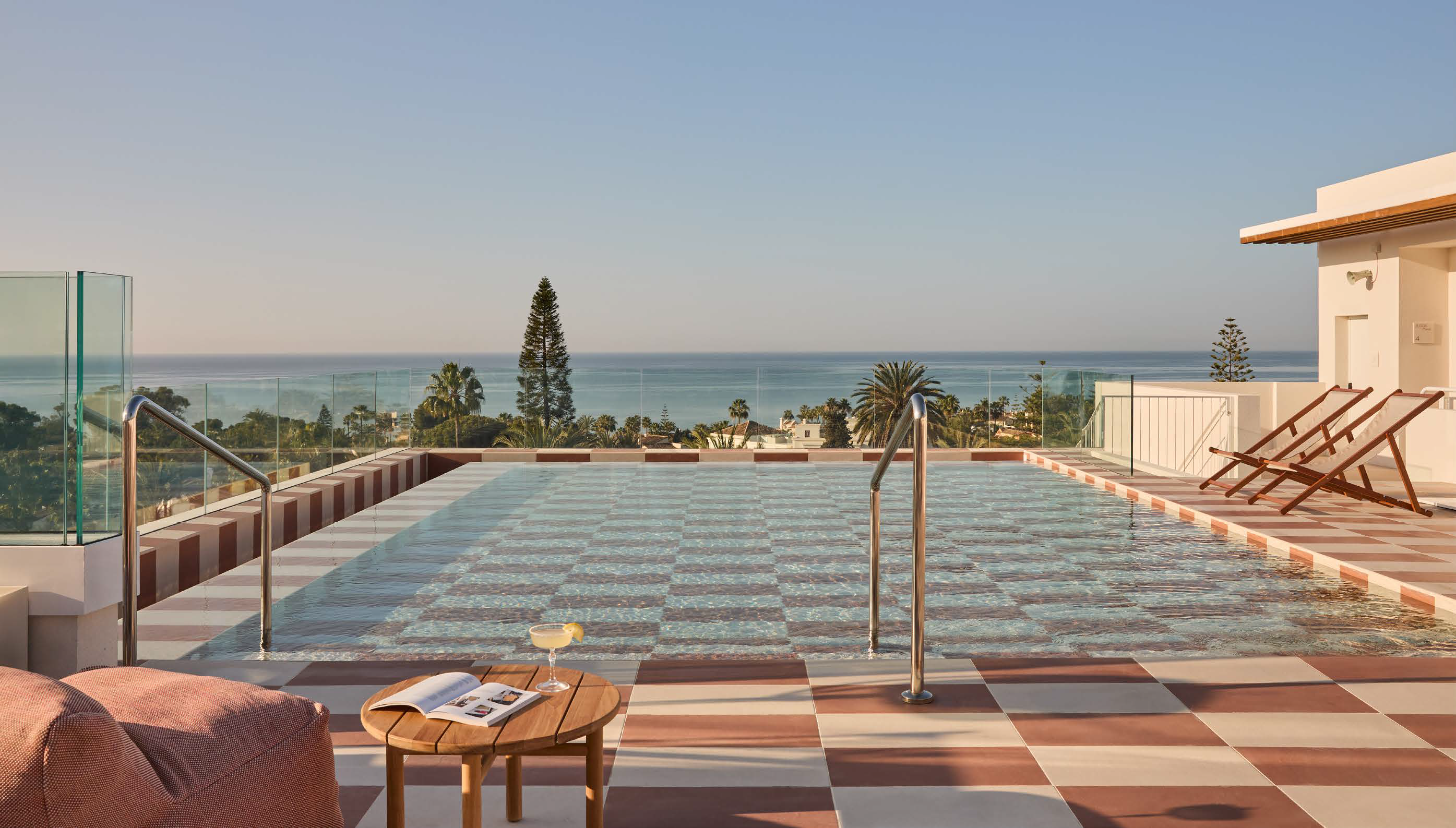Al descender, una piscina panorámica, enmarcada por motivos cerámicos retro, se extiende hacia las vistas del Mediterráneo. Durante el día, el ambiente es casual y relajado; por la noche, se transforma en una experiencia elevada y sofisticada. En resumen, una mezcla de glamour retro, detalles inesperados y estética de atardecer, este rooftop reimagina con audacia el chic mediterráneo de los años 70.