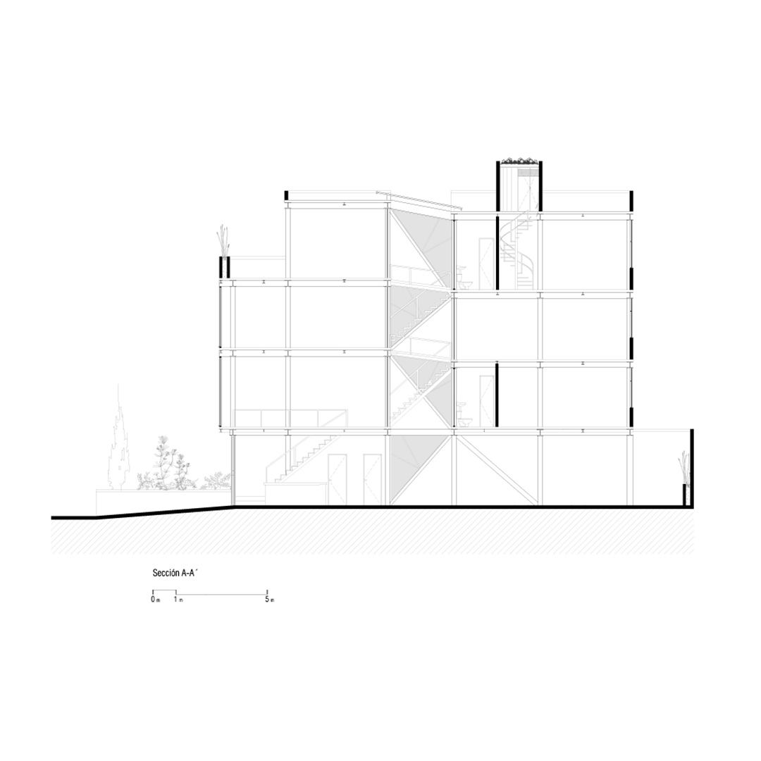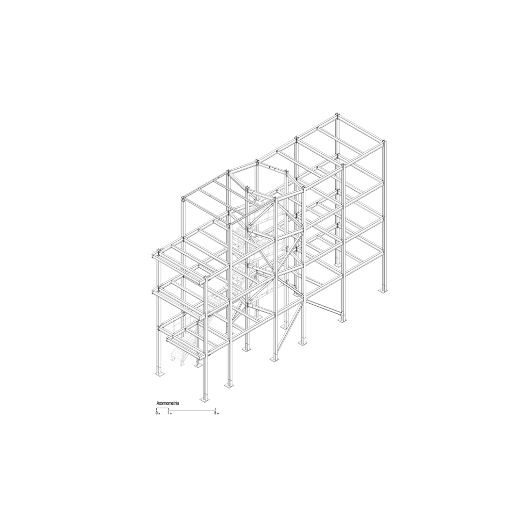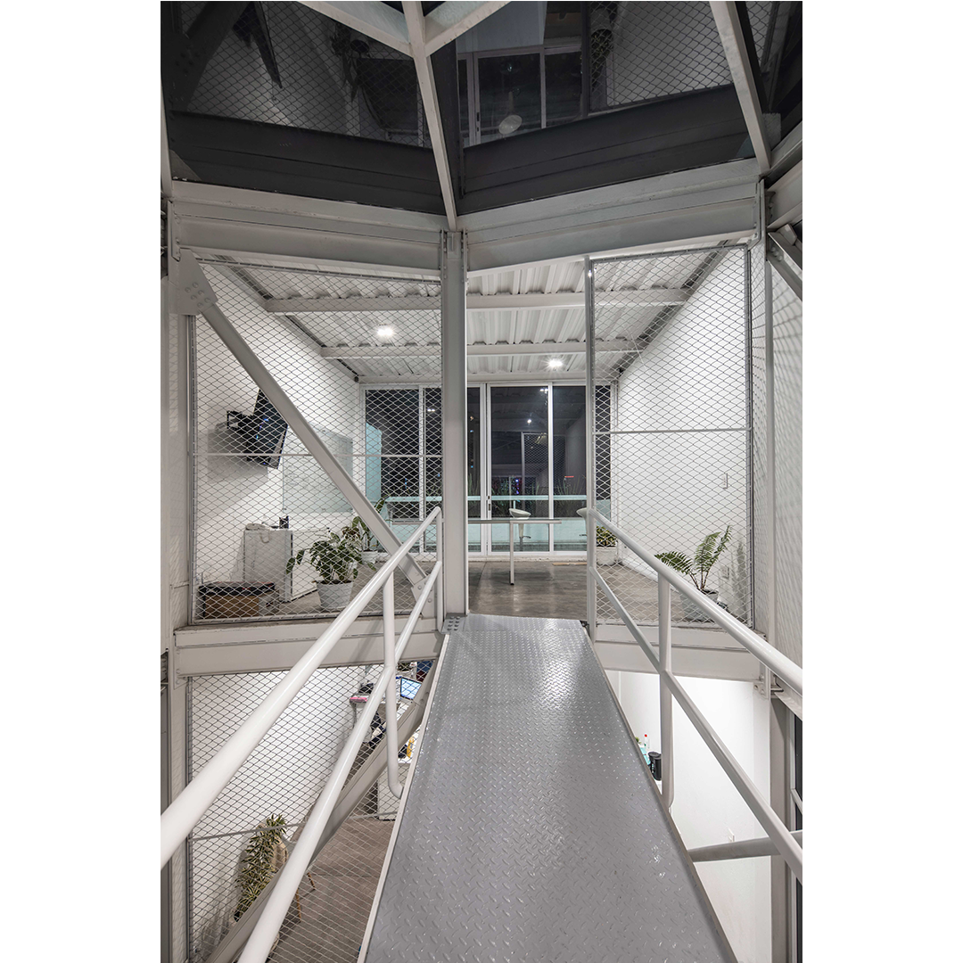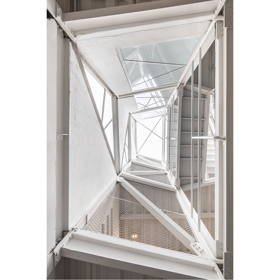 El esqueleto metálico de 4 plantas se articula en torno a un vació central por el cual se iluminan todos los espacios y que separa dos volúmenes conectados por puentes y escaleras en distintos niveles.  Los juegos de altura, el circuito de recorrido y los movimientos de la estructura permiten que estos 480 m2 de construcción se perciban como m3 continuos adaptables a múltiples formatos de uso.