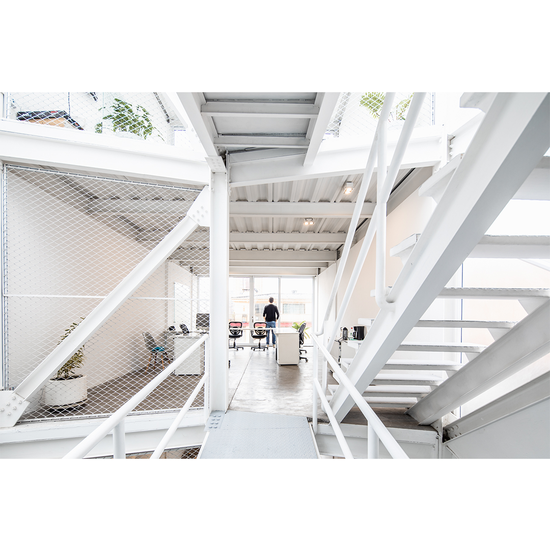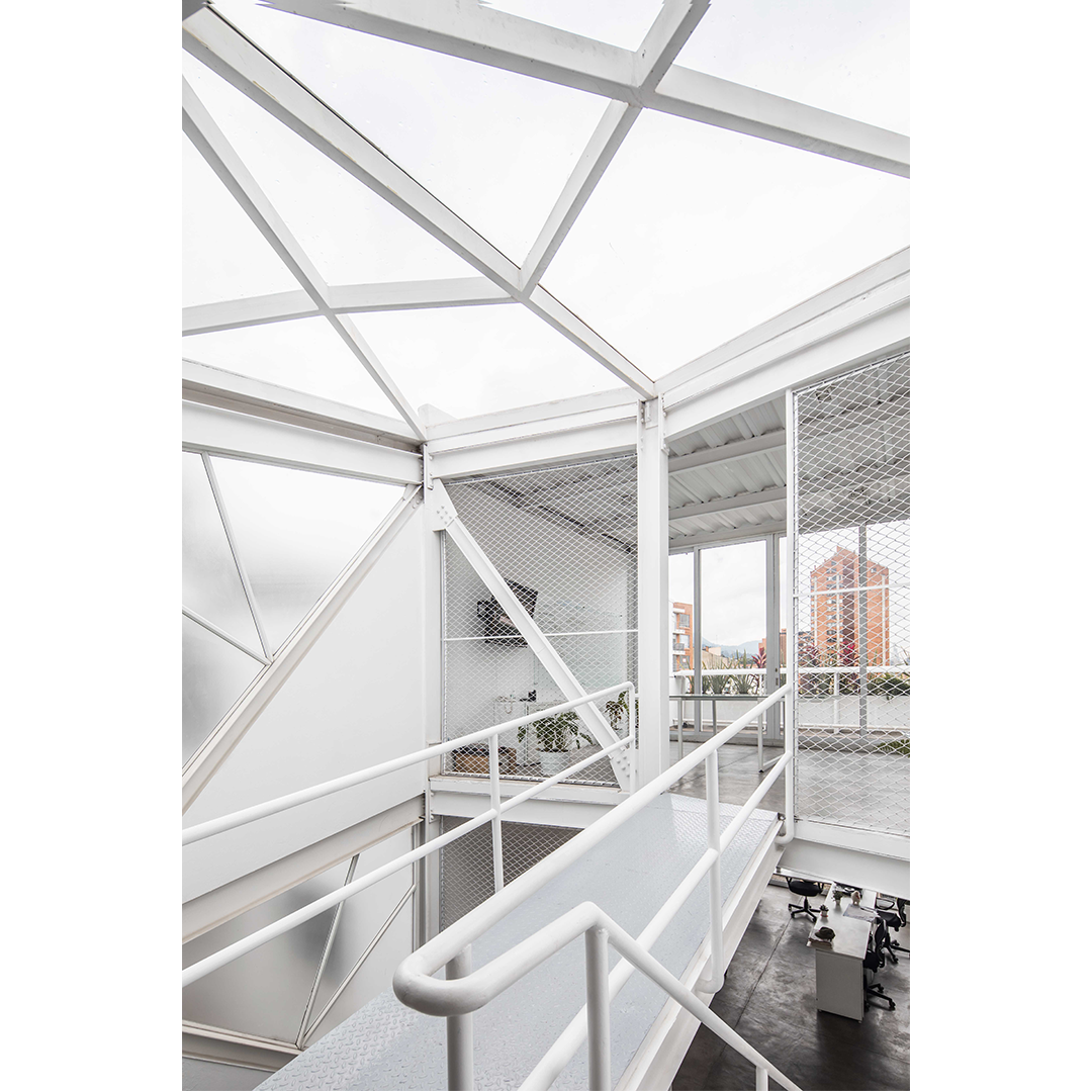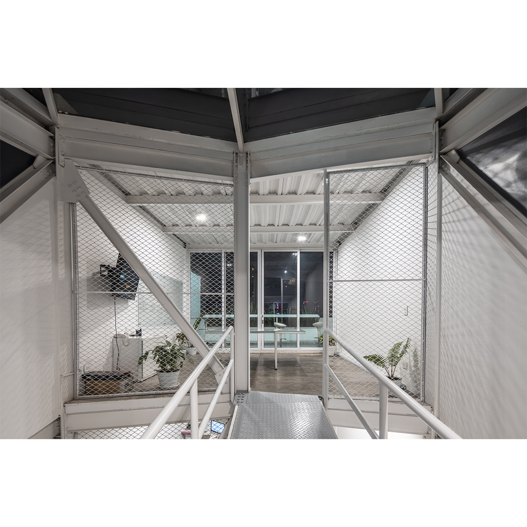 El esqueleto metálico de 4 plantas se articula en torno a un vació central por el cual se iluminan todos los espacios y que separa dos volúmenes conectados por puentes y escaleras en distintos niveles.  Los juegos de altura, el circuito de recorrido y los movimientos de la estructura permiten que estos 480 m2 de construcción se perciban como m3 continuos adaptables a múltiples formatos de uso.