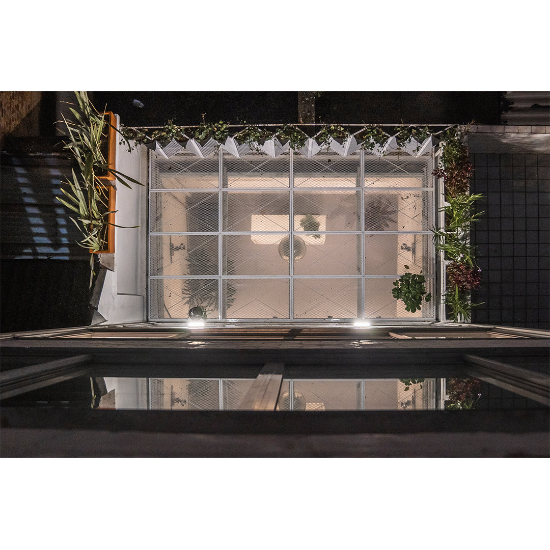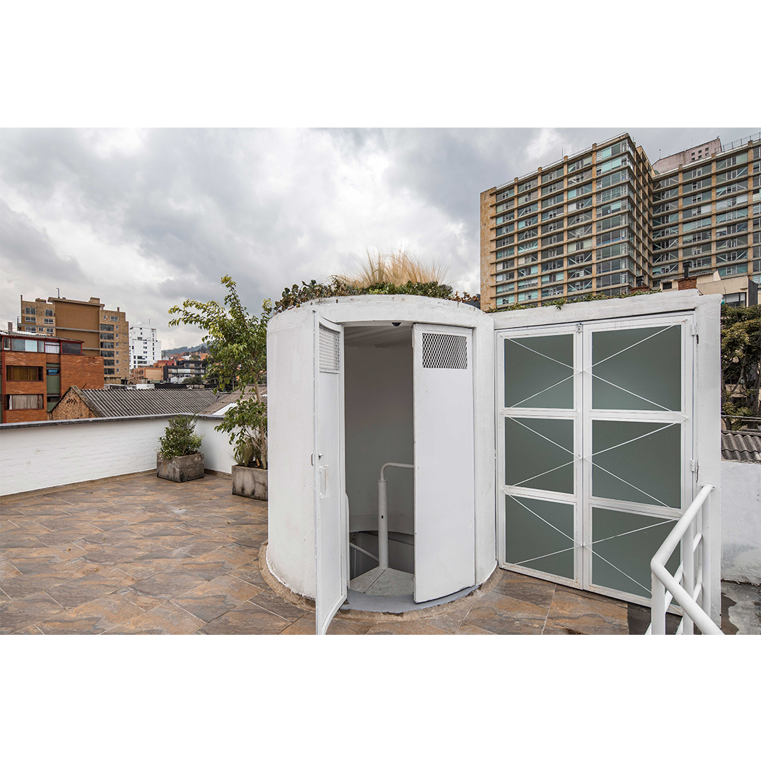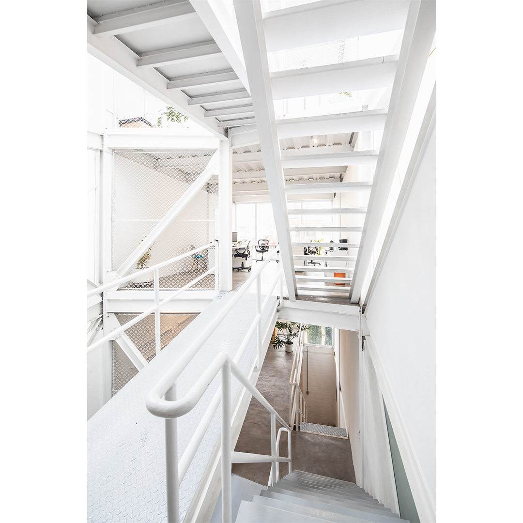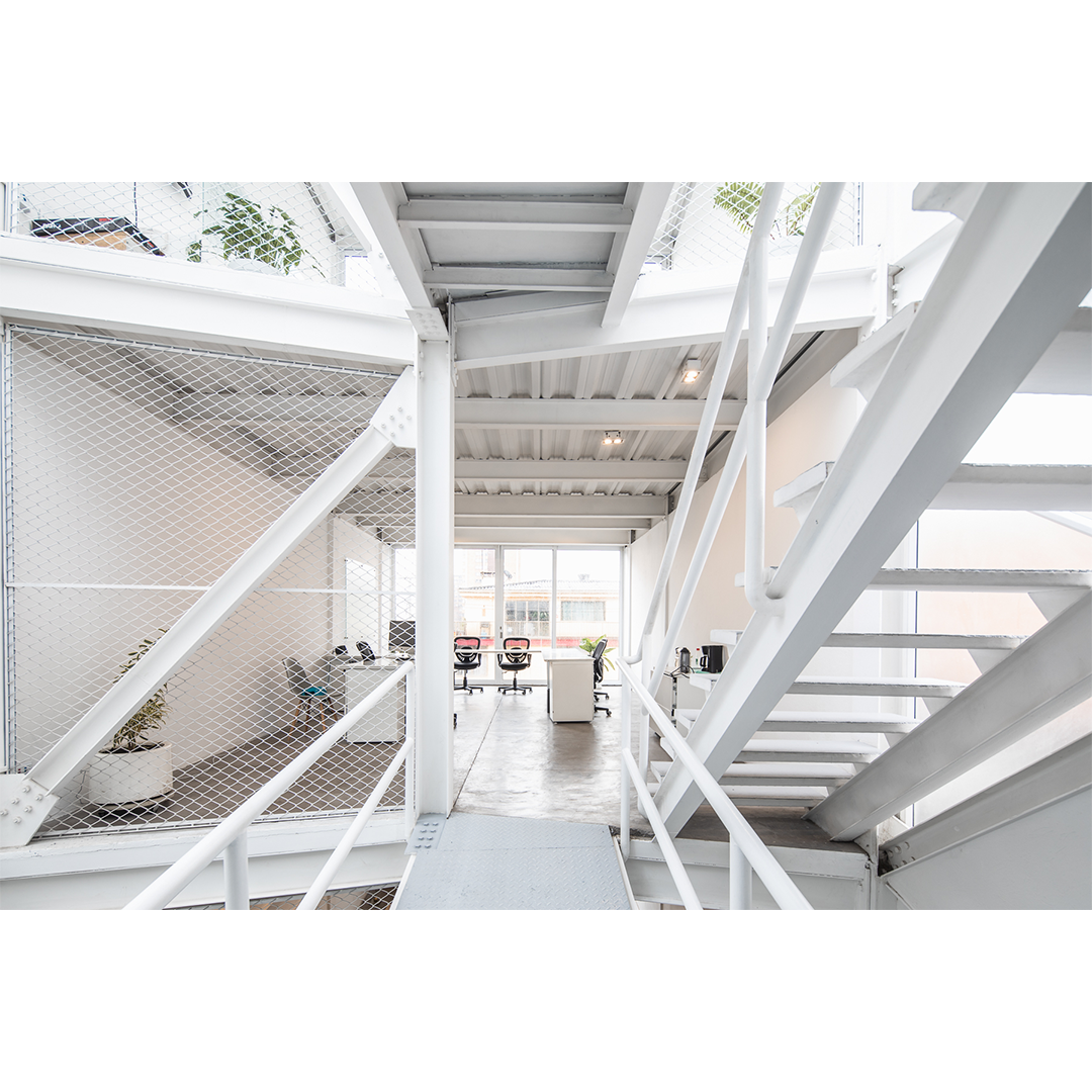 El esqueleto metálico de 4 plantas se articula en torno a un vació central por el cual se iluminan todos los espacios y que separa dos volúmenes conectados por puentes y escaleras en distintos niveles.  Los juegos de altura, el circuito de recorrido y los movimientos de la estructura permiten que estos 480 m2 de construcción se perciban como m3 continuos adaptables a múltiples formatos de uso.