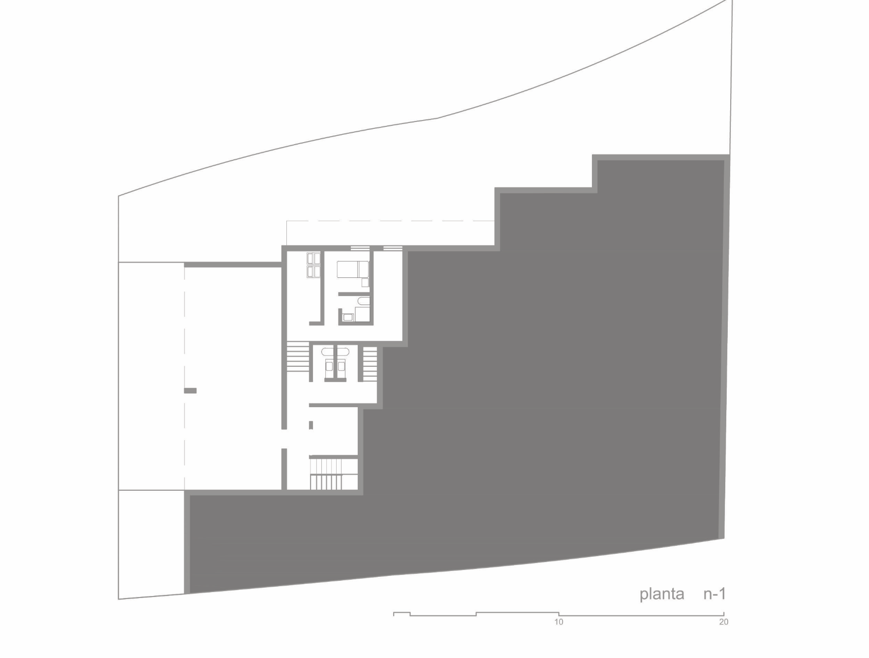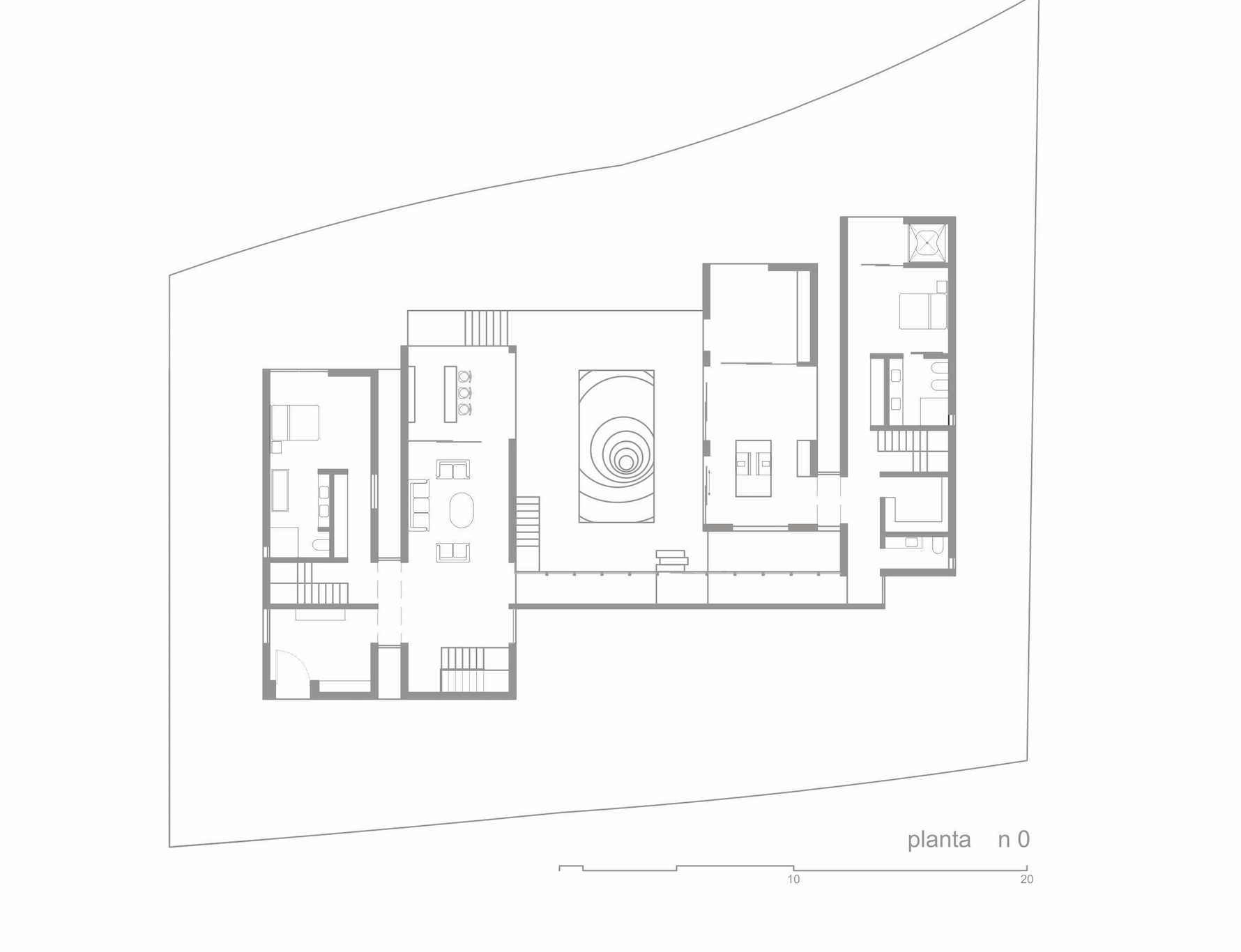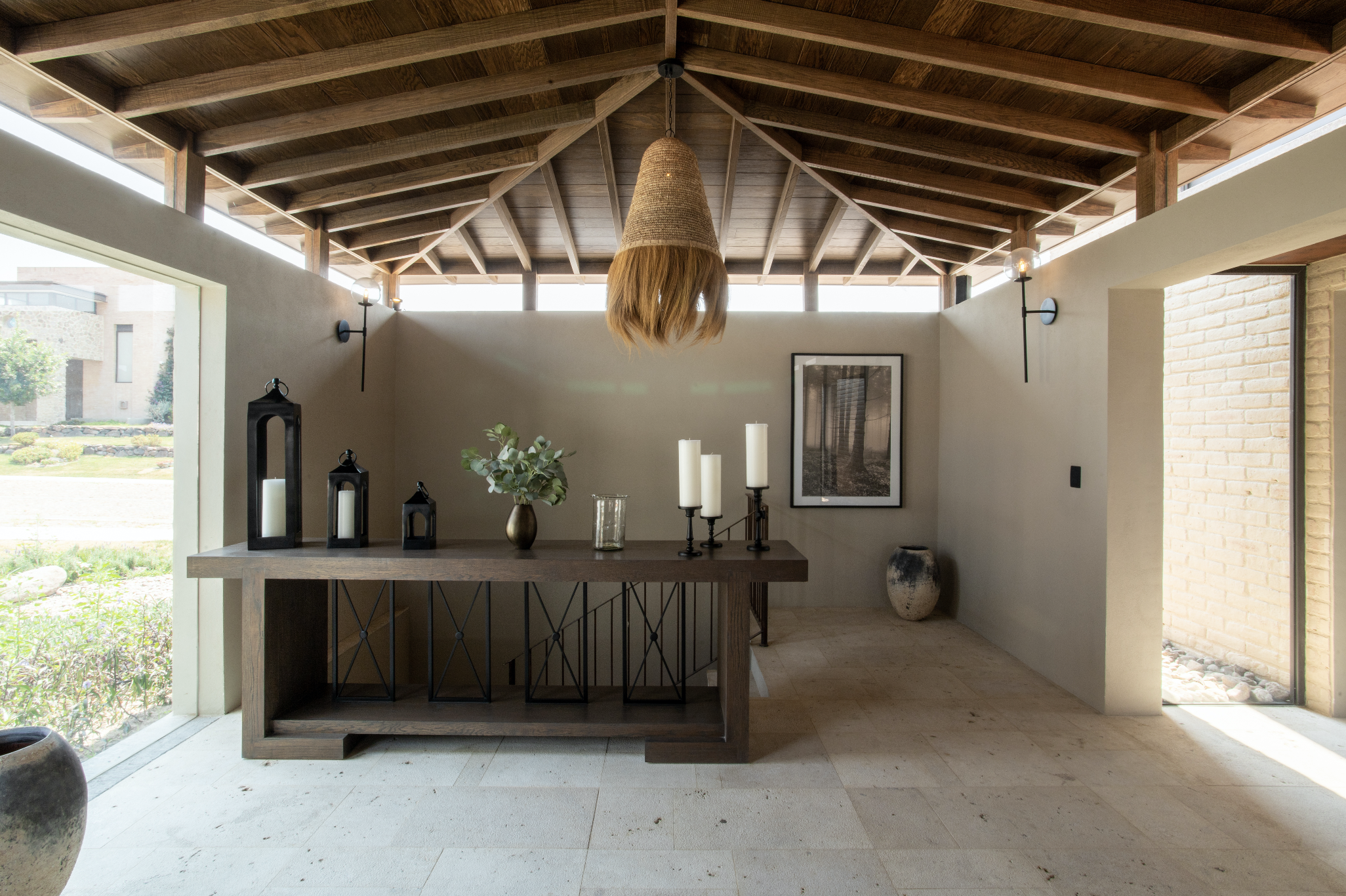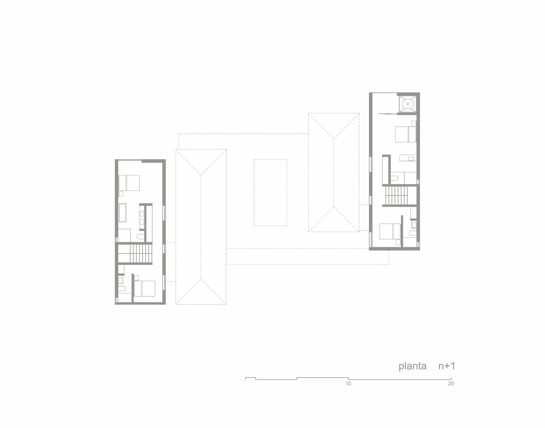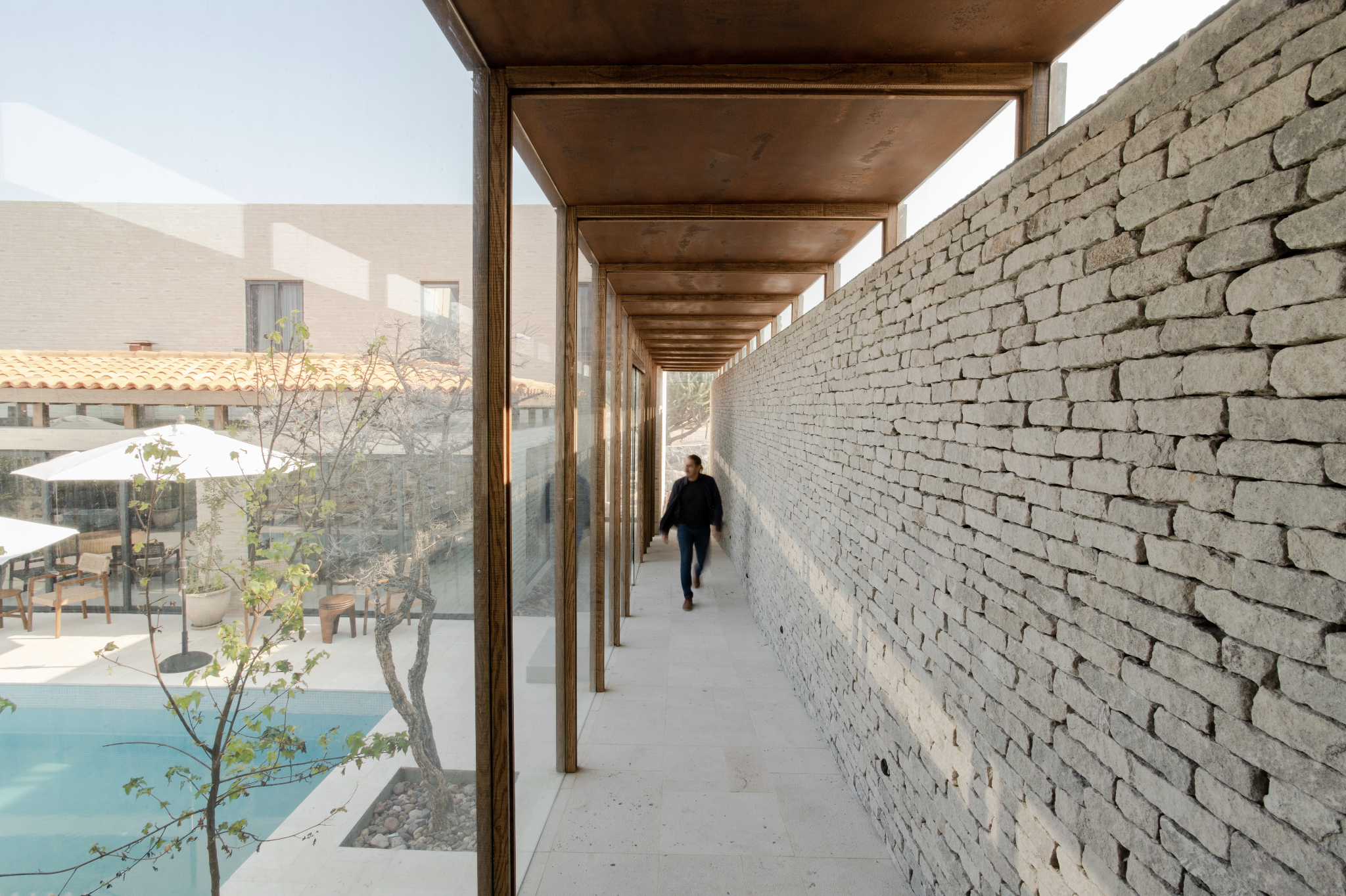 El proyecto emerge sobre un terreno irregular con una cañada y pendiente hacia el poniente, éste es desplantado y condicionado por estas características así como el respeto por la vegetación existente, en su mayoría árboles tipo palo dulce y nopal de talla mediana. El proyecto está conformado por 4 bloques que sugieren la separación de lo privado y lo social, así como el favorecimiento del paso del viento e iluminación natural, estos mismos bloques son conectados por un andador orientado hacia el oriente y fachada principalcon un cambio de materialidad enfatizando el espacio de transición, las habitaciones son desplazadas hacia los bloques de los extremos, siendo estos bloques los de mayor altura, y dejando los bloques interiores para espacios sociales como terraza y alberca, hacer esto nos permite contener las visuales exteriores hacia y desde la relación predio-calle y nos permite voltear hacia el interior con vistas hacia la cañada y el viñedo.