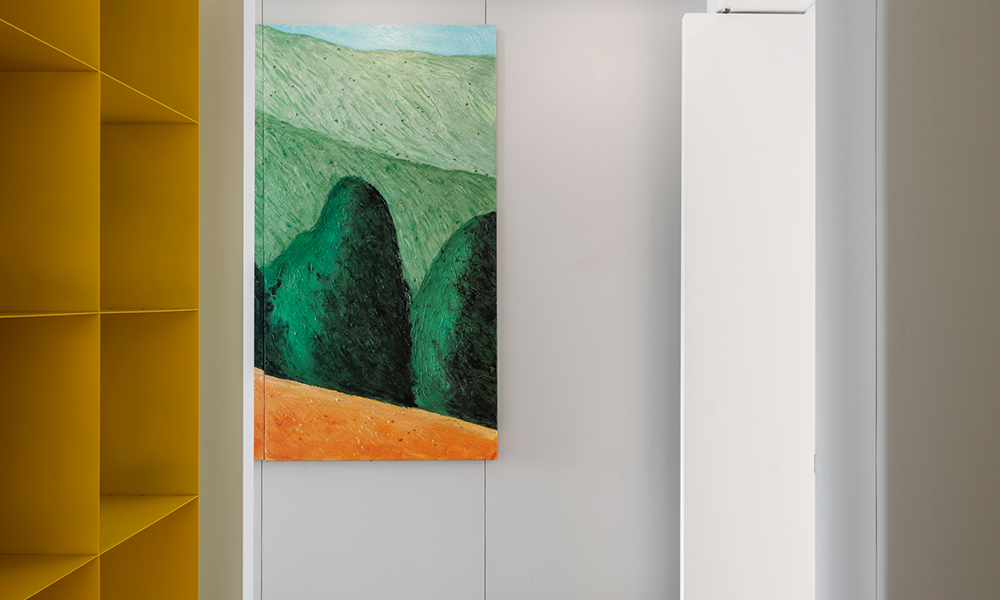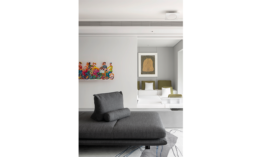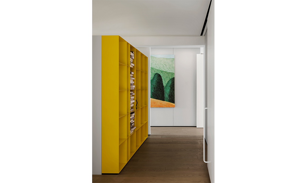 “La extensión del espacio residencial constituye el arte de la vida.” El minimalismo puede ser considerado como el medio del arte y de la vida. Con el fondo blanco, el contraste de los colores altamente saturados, amarillo limón y verde oscuro, con el corredor cambiante de gran tamaño, hace que el espacio sea amplio y espacioso.