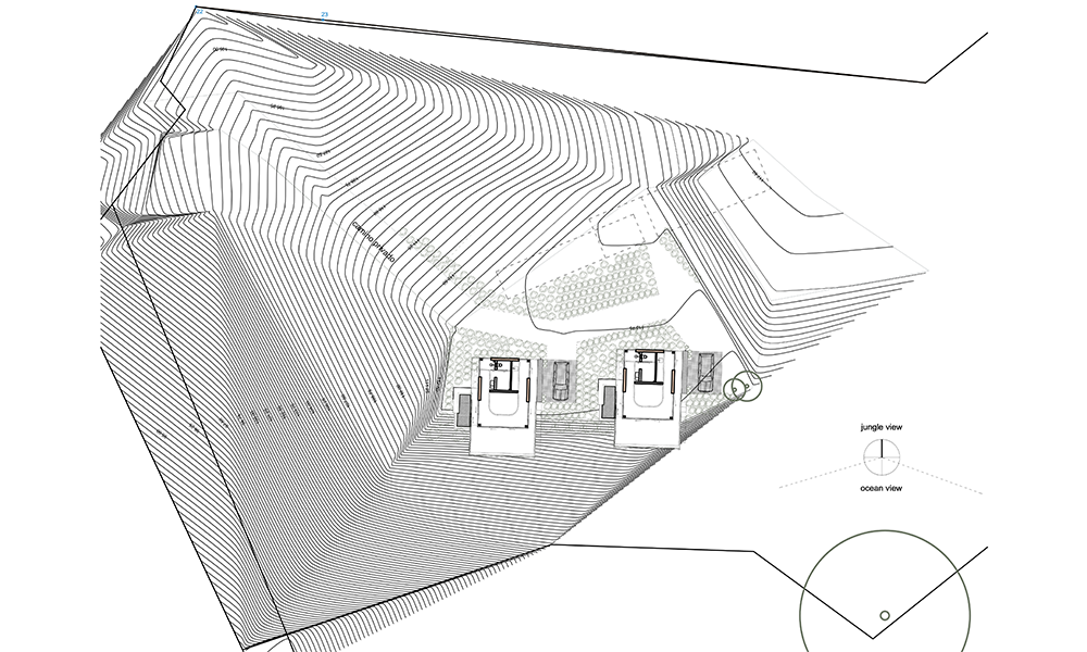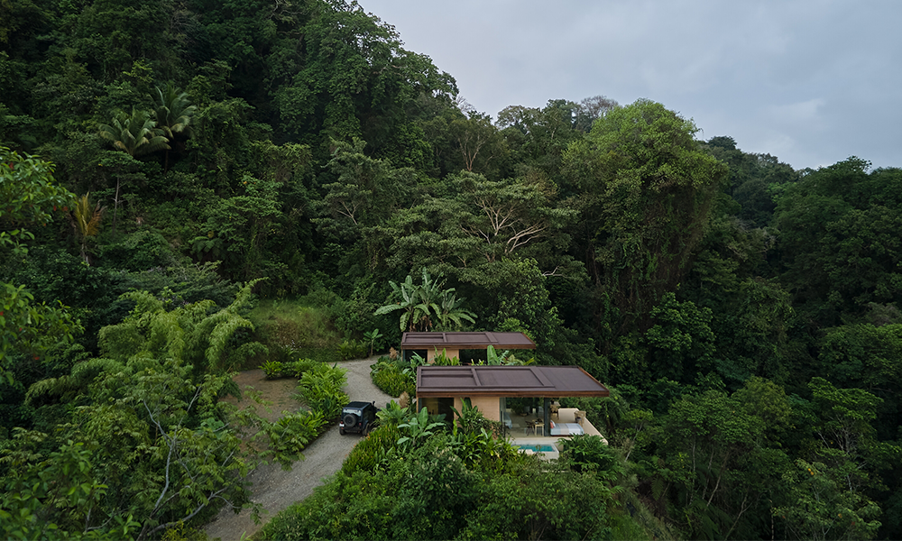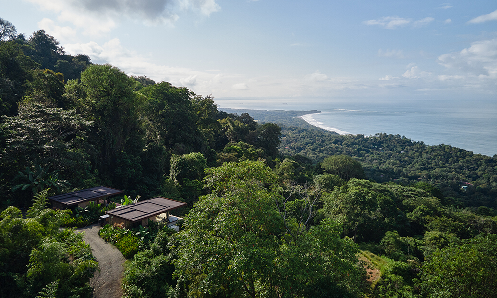 Cerca del pueblo de Uvita, en un terreno de 11.000 metros cuadrados a una altura de 300 m sobre el mar, diseñé dos pequeñas villas en una colina cubierta de selva. Ambas villas, que en parte levitan sobre la empinada ladera sur, están diseñadas para alquileres recreativos a corto plazo. La superficie construida de cada uno de ellos es de 90 m2.