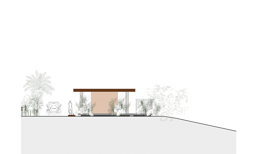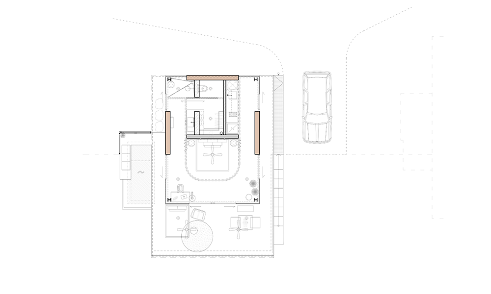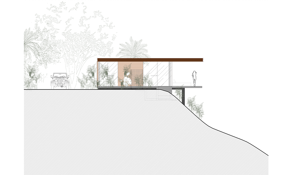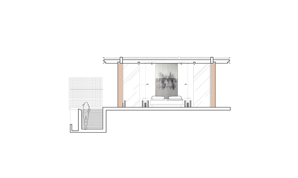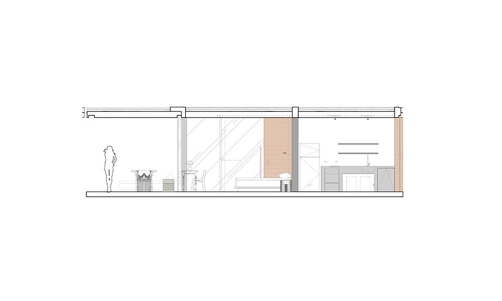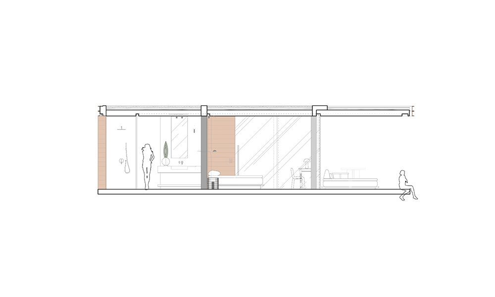 Todas las fachadas orientadas a vistas infinitas del océano están diseñadas con vidrio sin marco. Los perfiles de las partes deslizantes y macizas de las fachadas de vidrio están empotrados en las ranuras de la losa de techo de hormigón. De esta forma también se aplicó la instalación de los rieles de iluminación interior y el riel de conexión para la mosquitera y las cortinas alrededor de la cama.