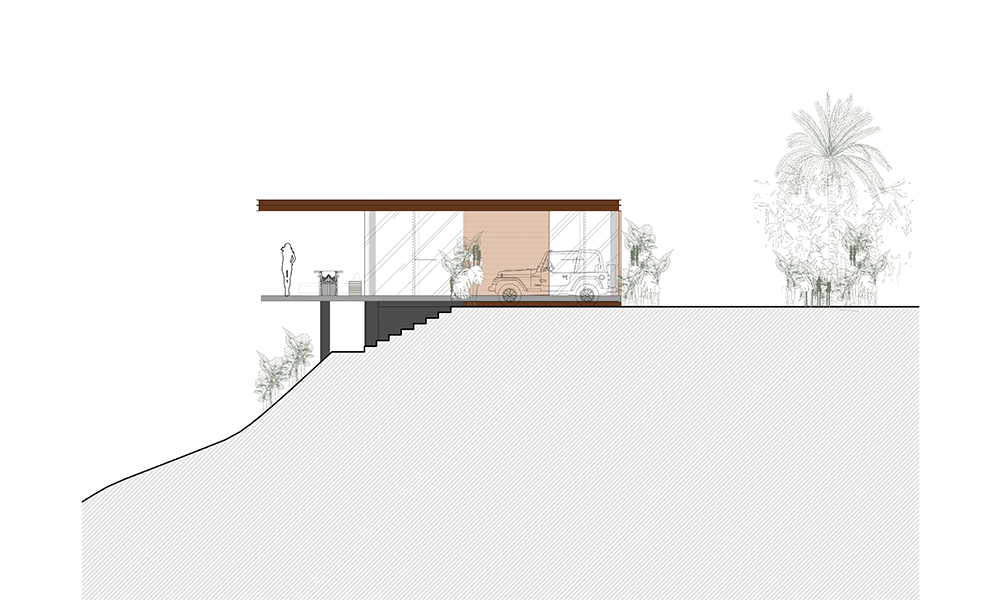 Los materiales visuales en bruto de las paredes de tierra apisonada y el hormigón se complementan con las vigas en H de acero estructural, que soportan una losa de techo monolítica de hormigón. Las vigas y el anillo de la casa son visibles solo en la cara superior del techo, que está revestido con un par de perfiles en “U” de acero. También cumplen la función del ático del techo.