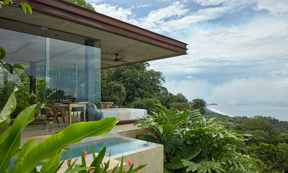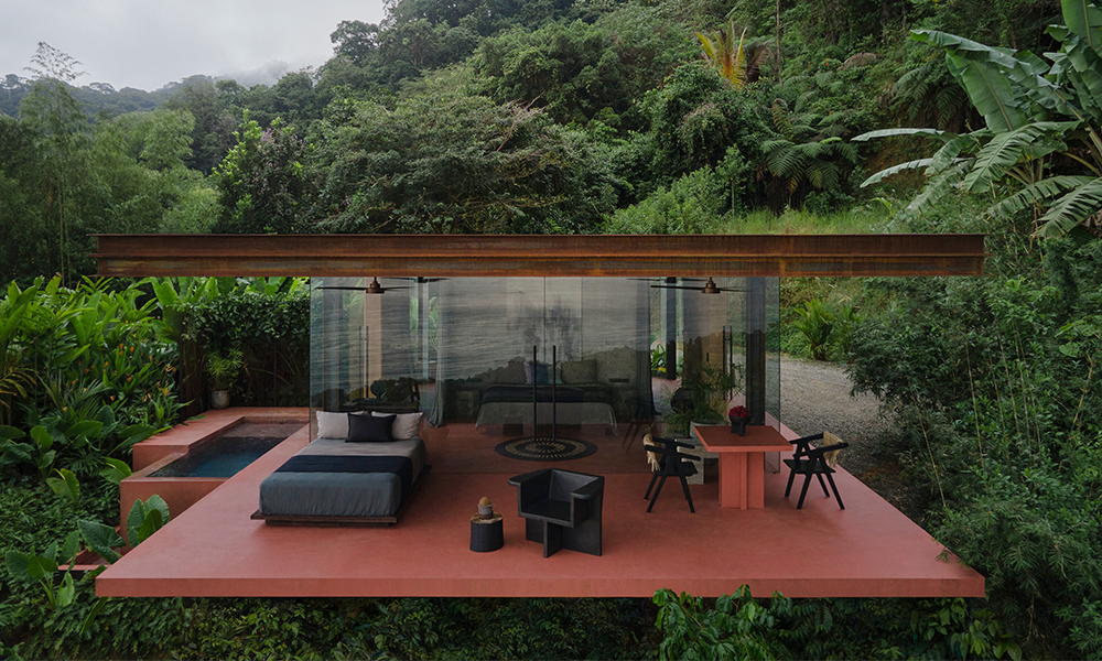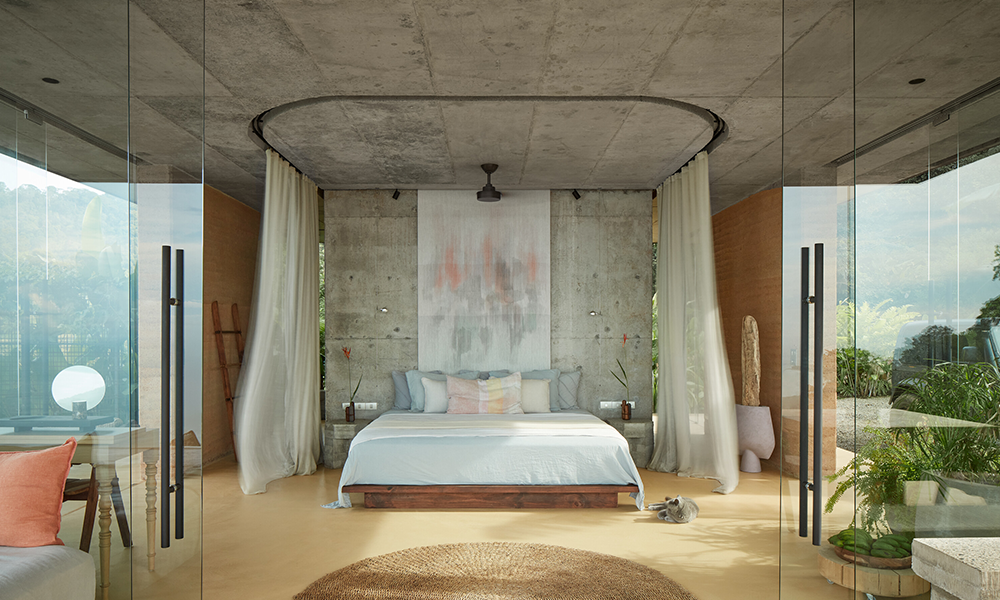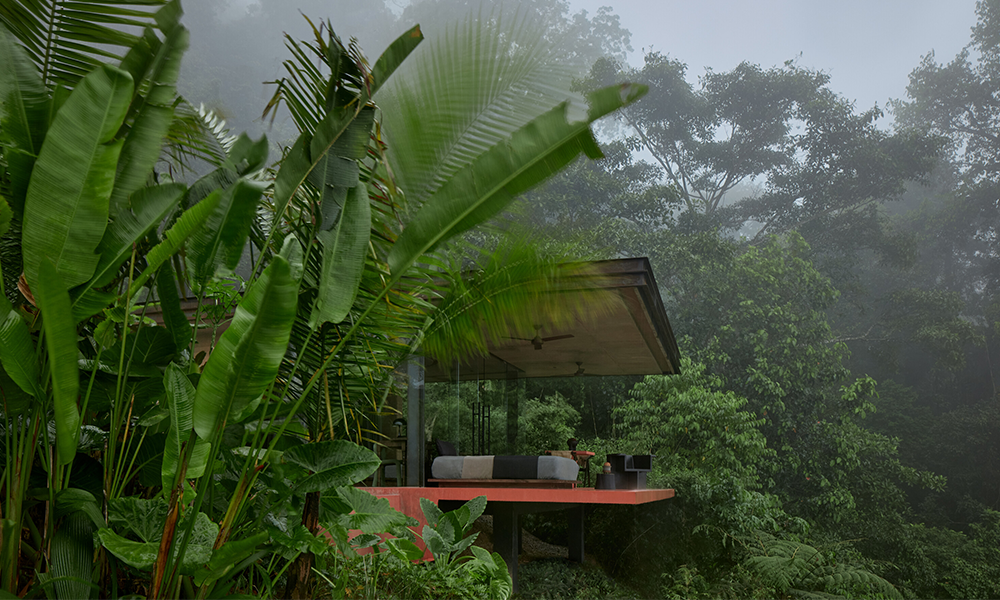 La arquitectura de las villas contrasta deliberadamente con sus líneas finas y afiladas con la exuberante vegetación tropical, pero los materiales y colores elegidos coinciden perfectamente con el entorno.